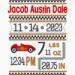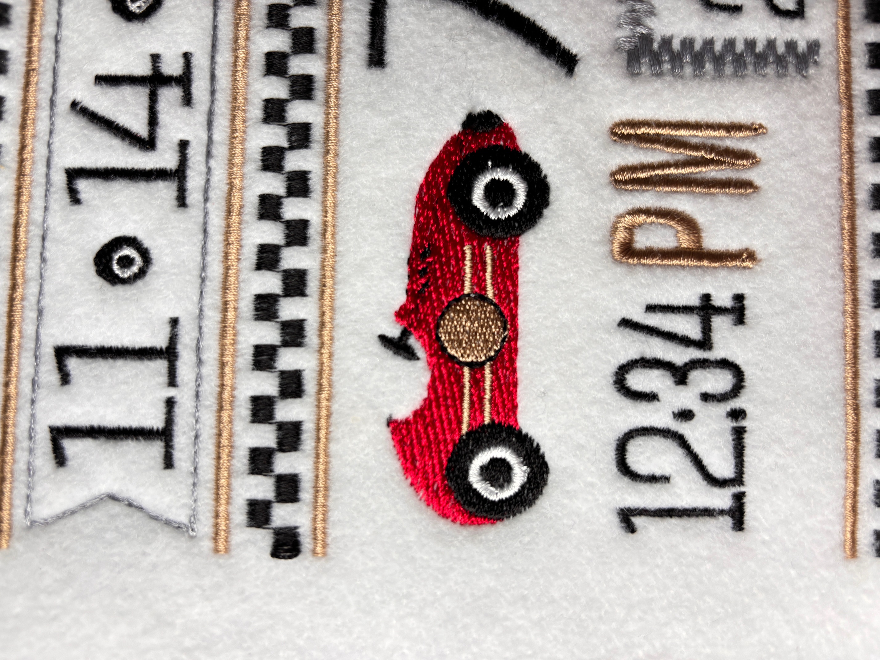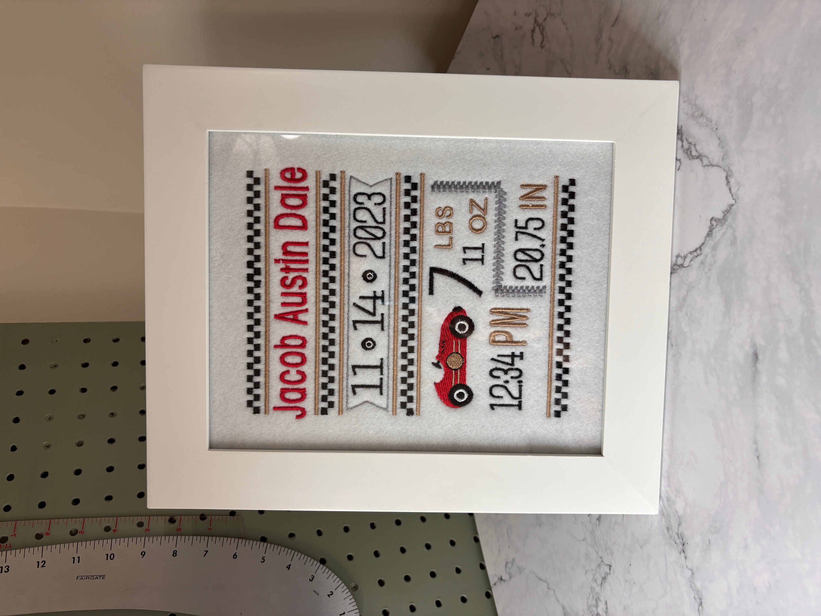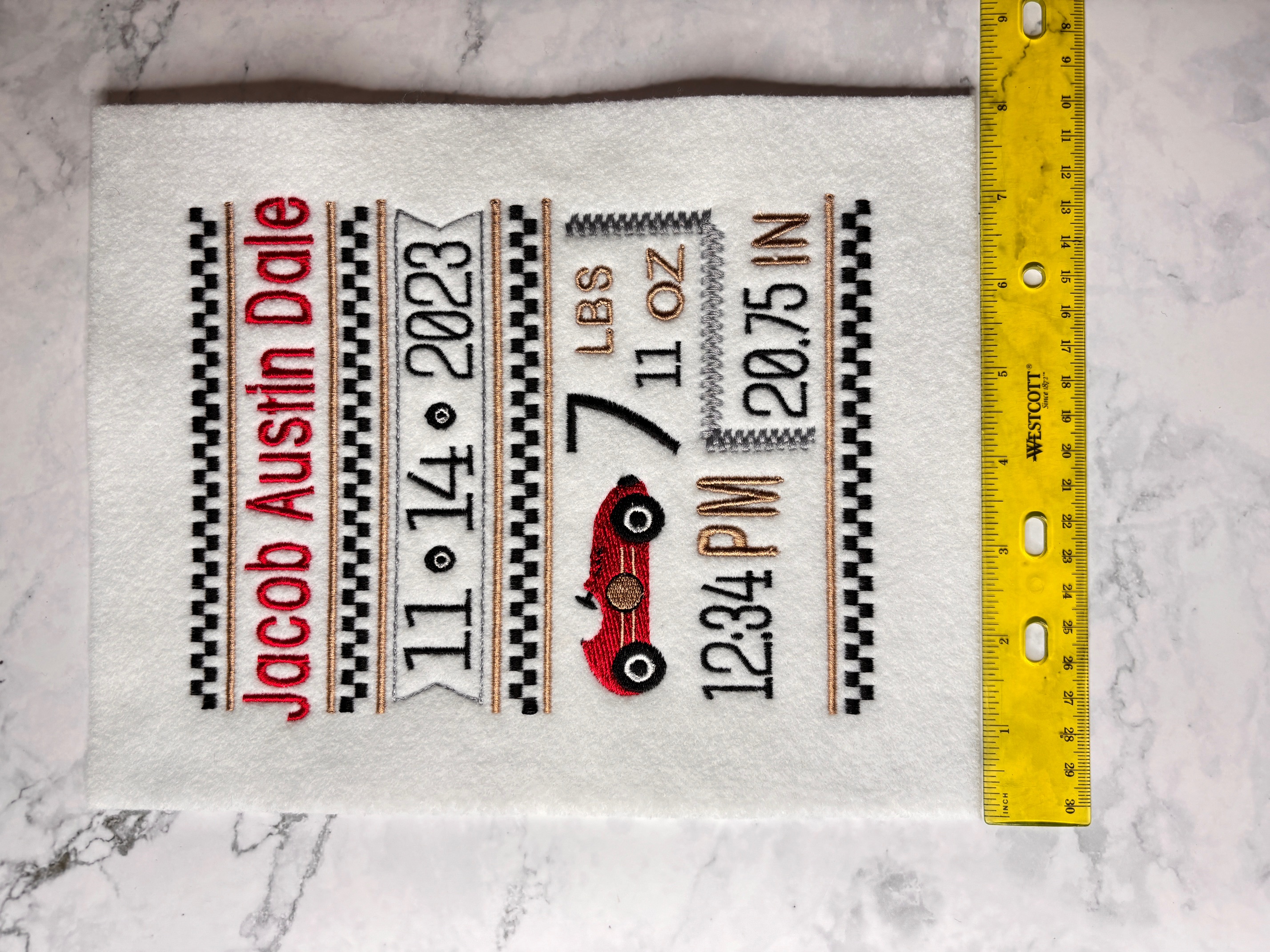 Custom Embroidered Birth Announcement – Perfect addition to any nursery. Embroidered Racecar Birth Announcement, Newborn Keepsake, Baby Statistics