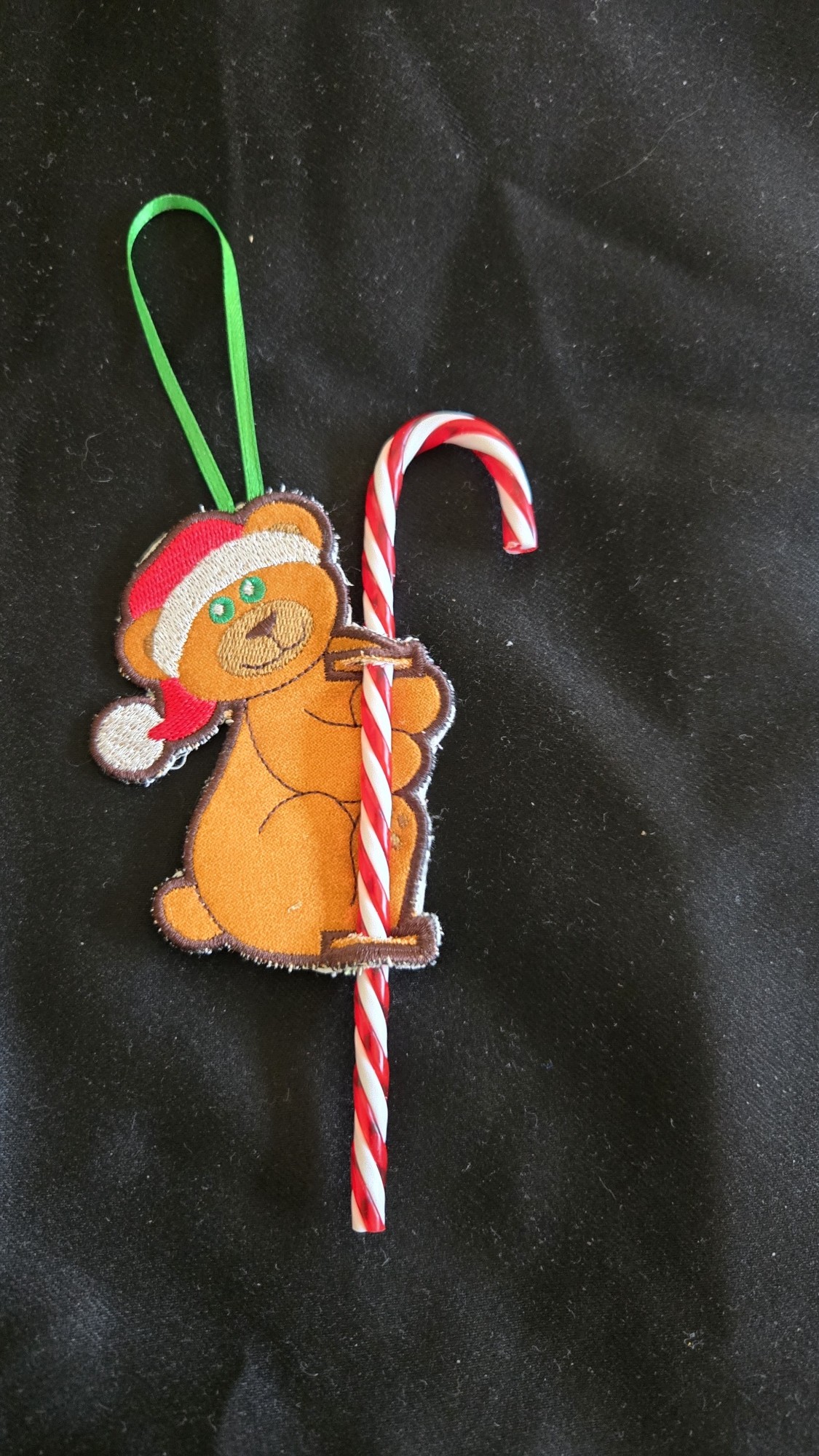 This handmade item combines both fabric, thread, and appliqued to create unique embroidered candy cane holders to hang on Christmas trees or on stockings.