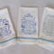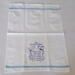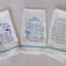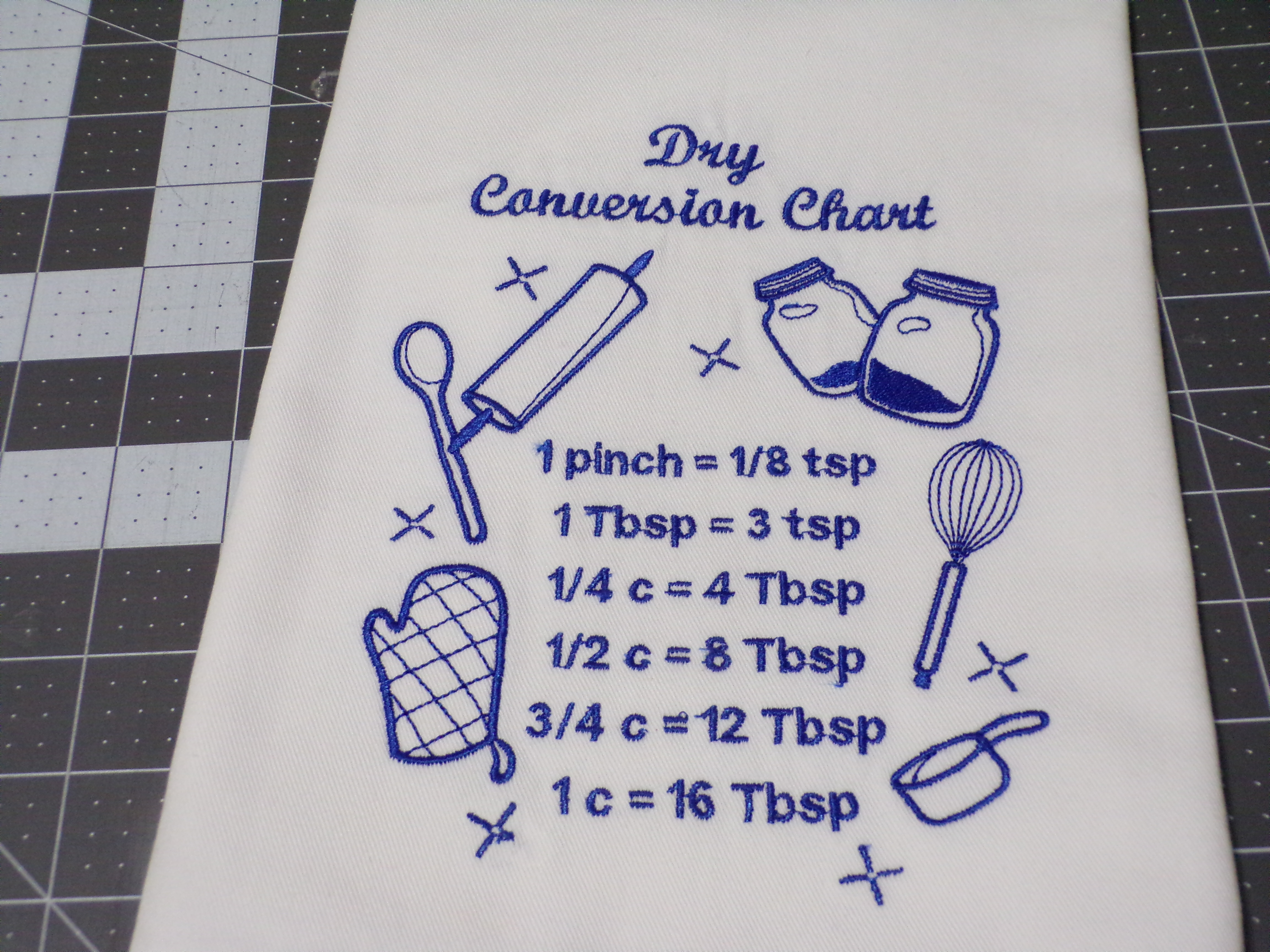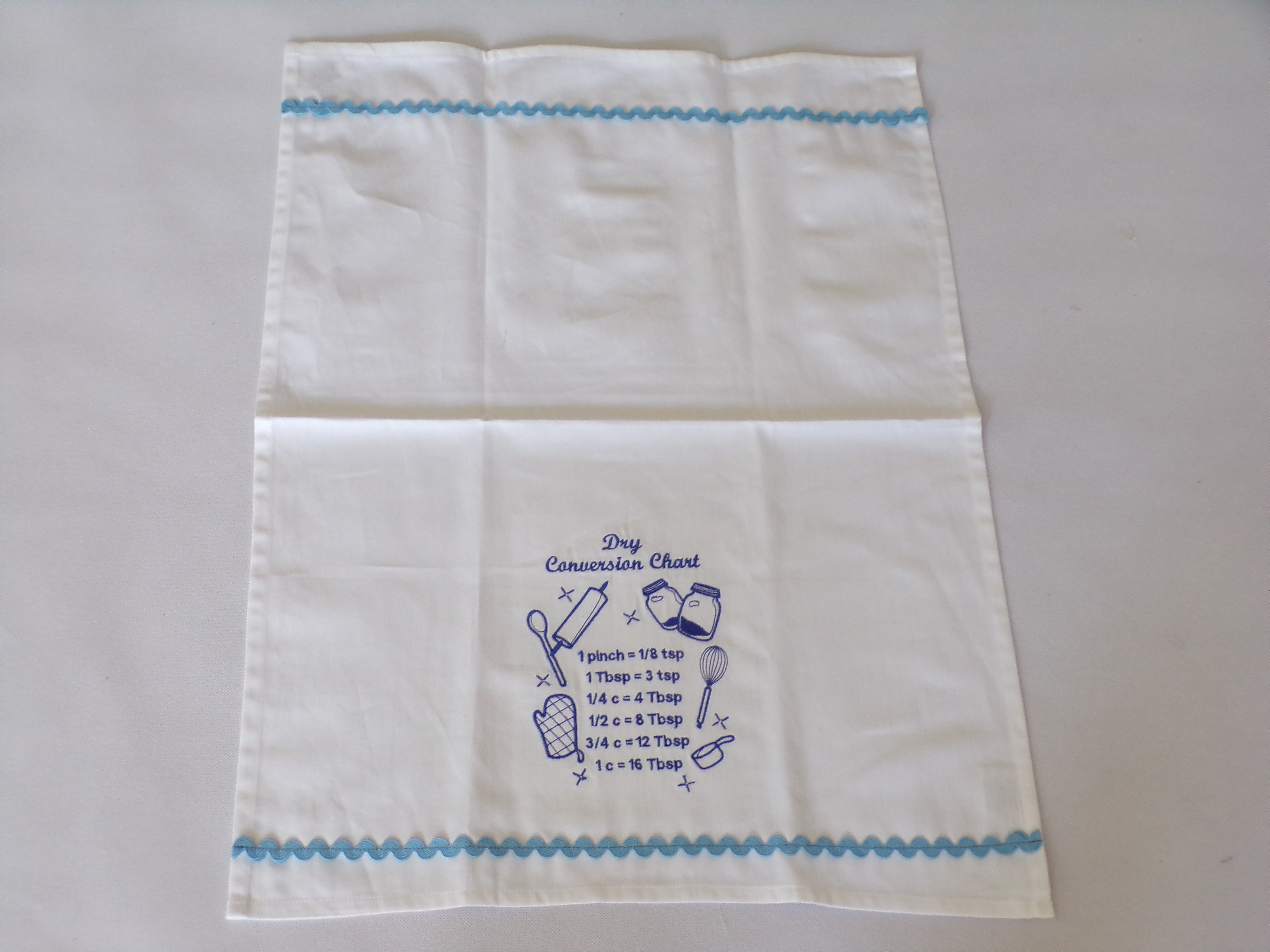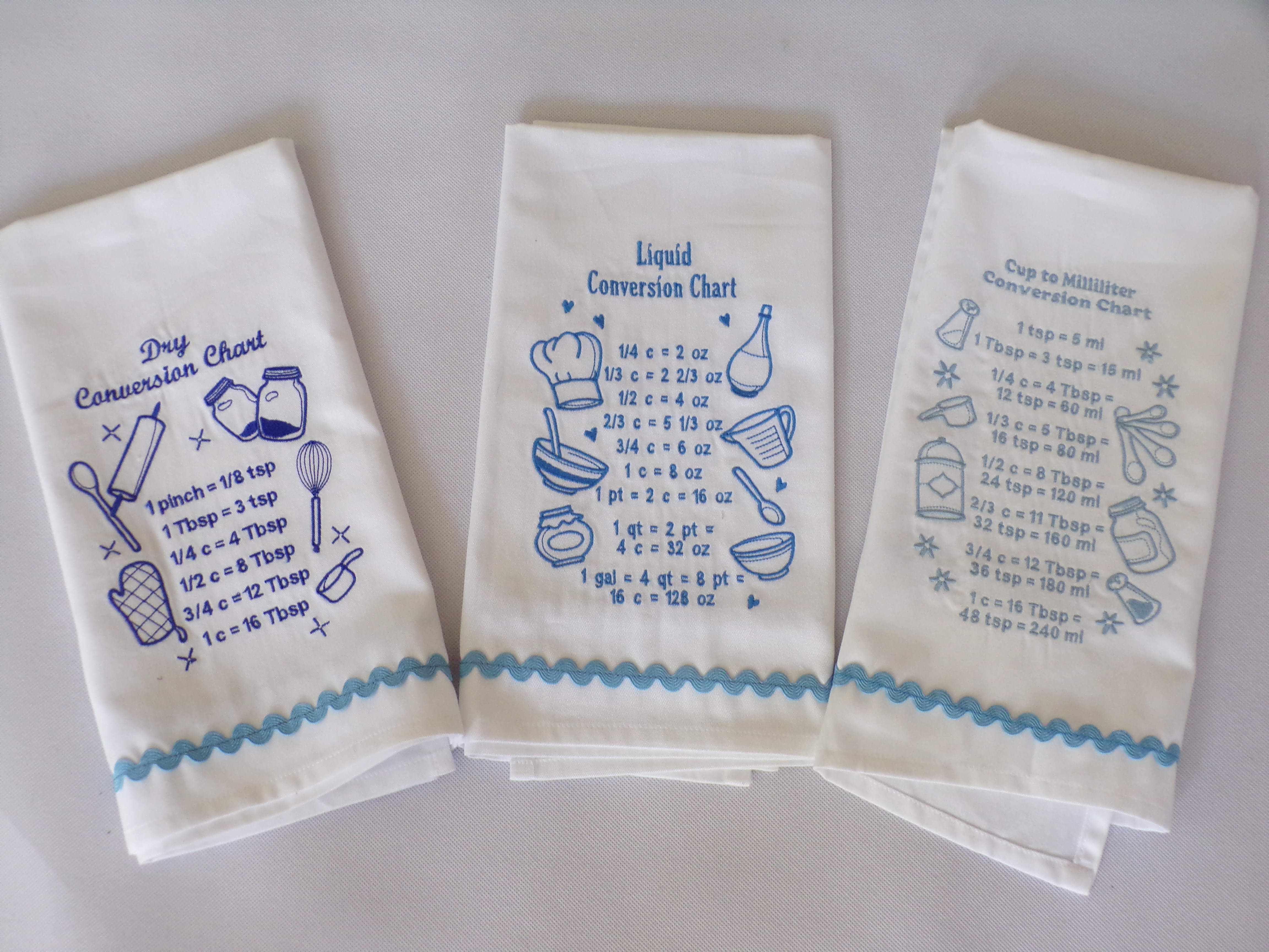 Tea towels are embroidered in three shades of blue and trimmed with a light blue ric rac. Each towel features a different conversion chart. Towels are approximately 20 inches by 28 inches and 100% cotton. Machine wash in cold water, mild detergent, and a color catcher. Line dry or dry on low heat. Iron when necessary. Only one set available.