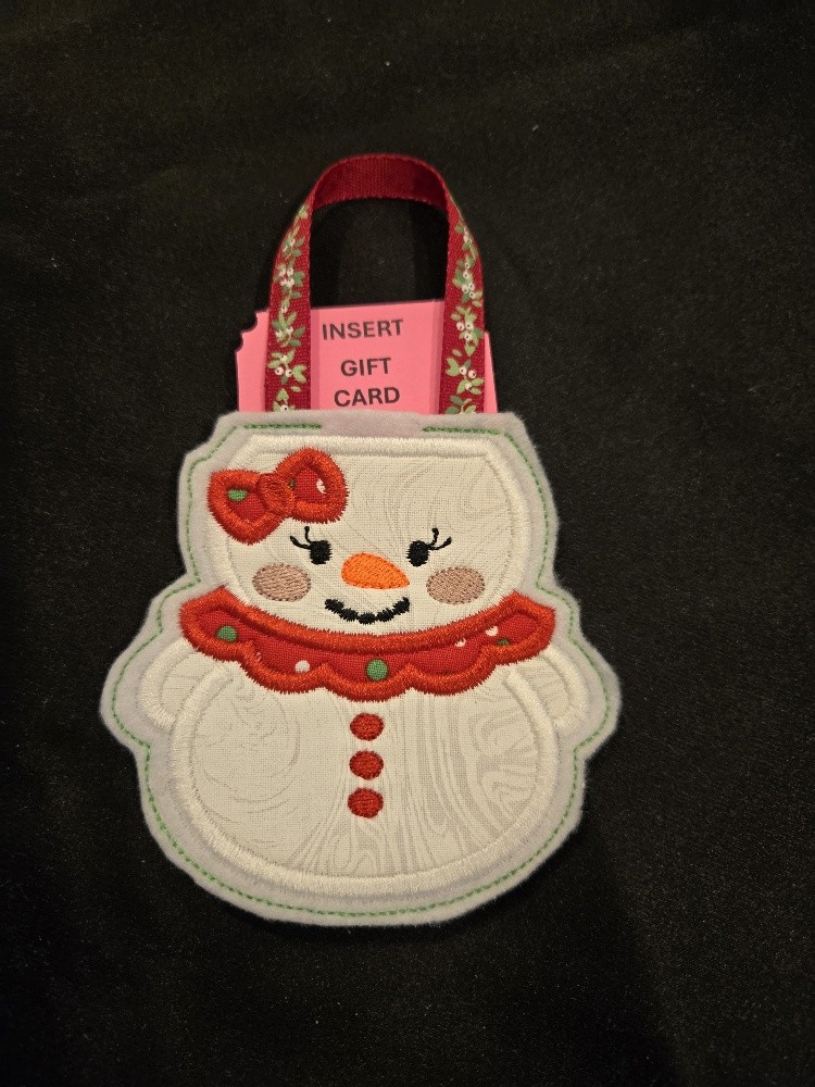 This item combines both fabric, thread, and appliqued to create unique embroidered gift card holders to hang on Christmas trees or in stockings.