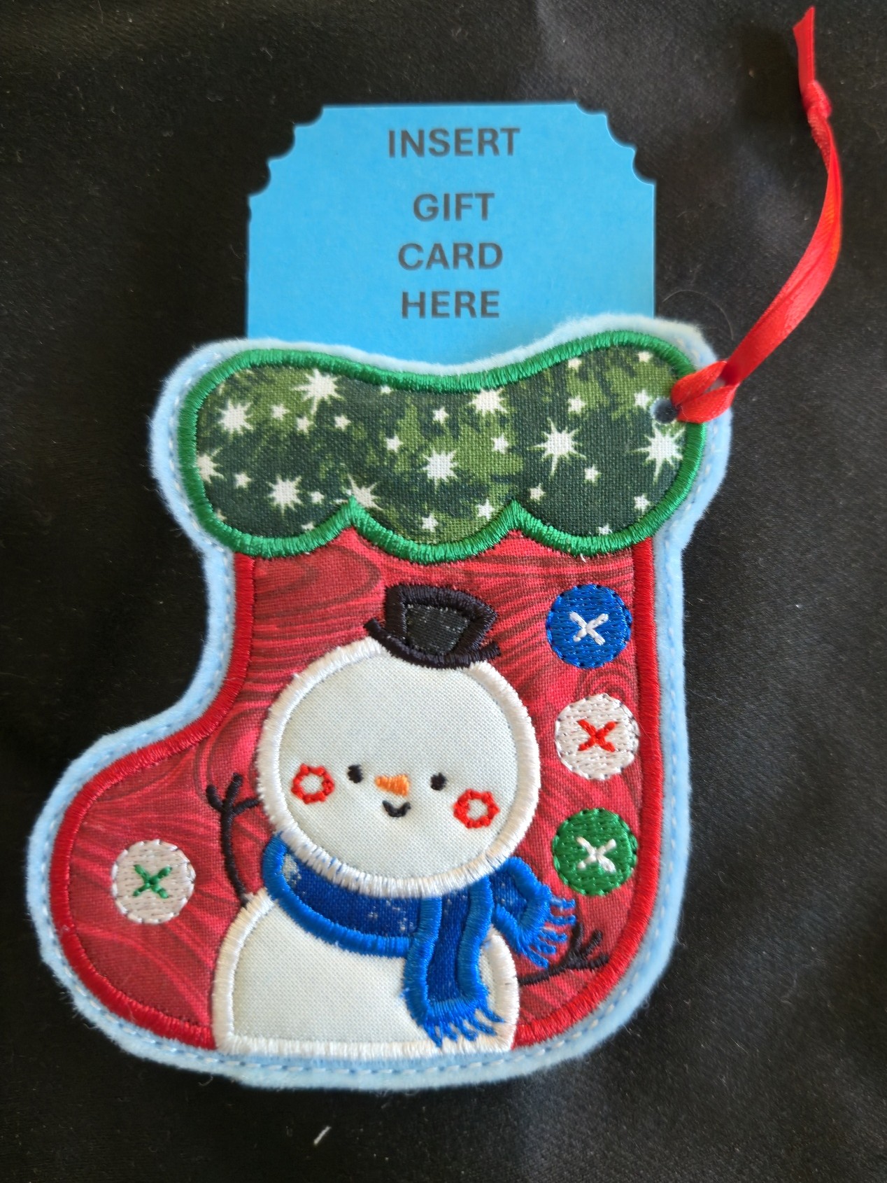 This item combines both fabric, thread, and appliqued to create unique embroidered gift card holders to hang on Christmas trees or in stockings.