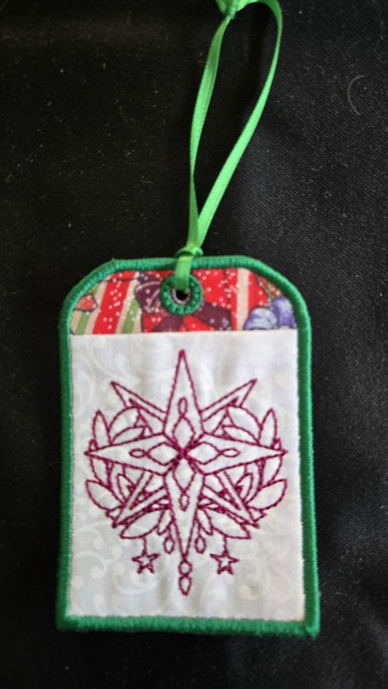 This handmade item combines both fabric, thread, and appliqued to create unique embroidered gift card holders to hang on Christmas trees or on stockings.