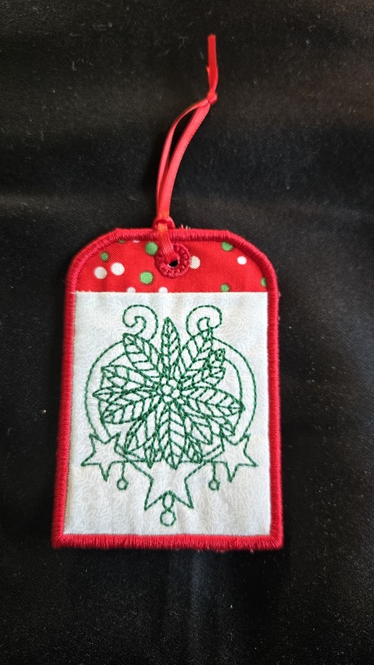 This handmade item combines both fabric, thread, and appliqued to create unique embroidered Gift card holders to hang on Christmas trees or on stockings.