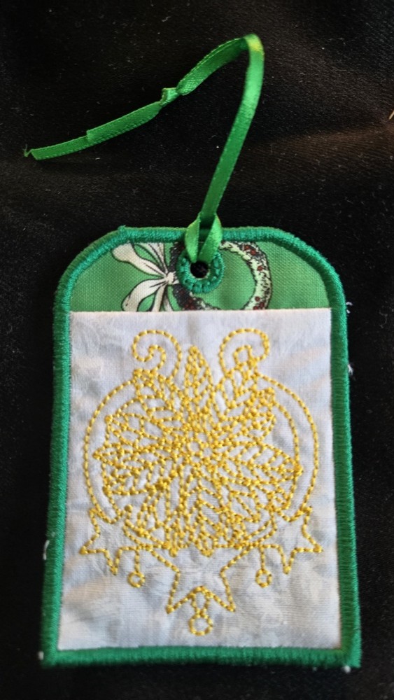 This handmade item combines both fabric, thread, and appliqued to create unique embroidered gift card holders to hang on Christmas trees or on stockings.