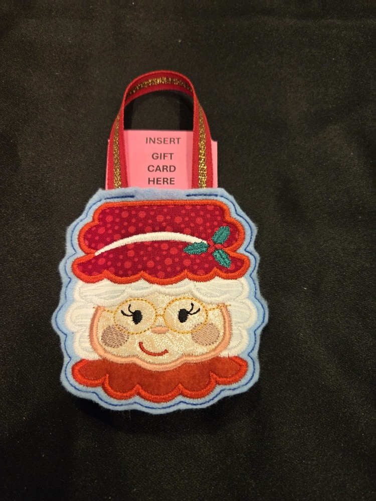 This item combines both fabric, thread, and appliqued to create unique embroidered gift card holders to hang on Christmas trees or in stockings.