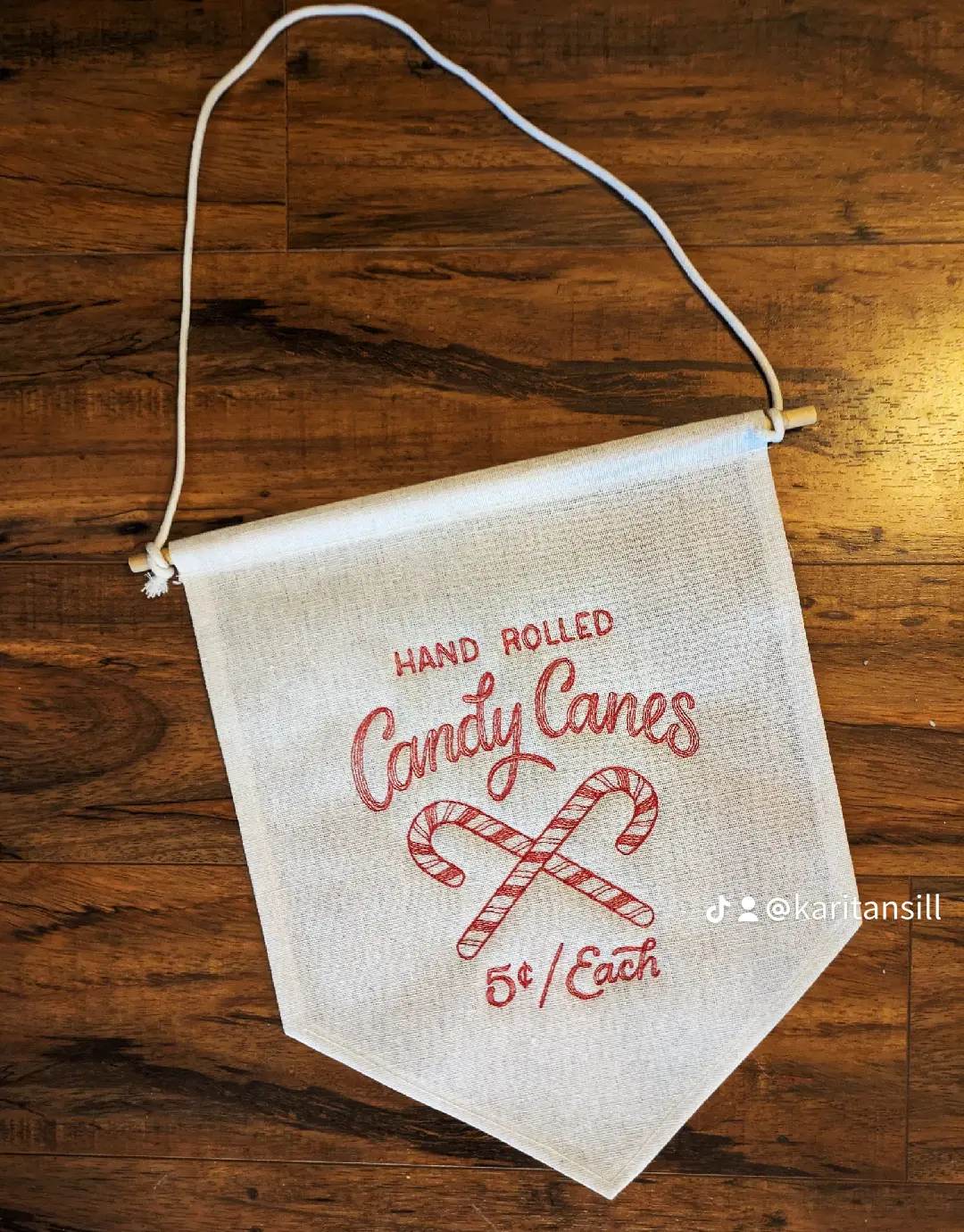 This cute Candy Cane banner will look festive hanging in your home, or would make a great Christmas gift for your family and friends. Banner hangs from a cord and dowel, and is weatherproof, so it can be hung inside or out.