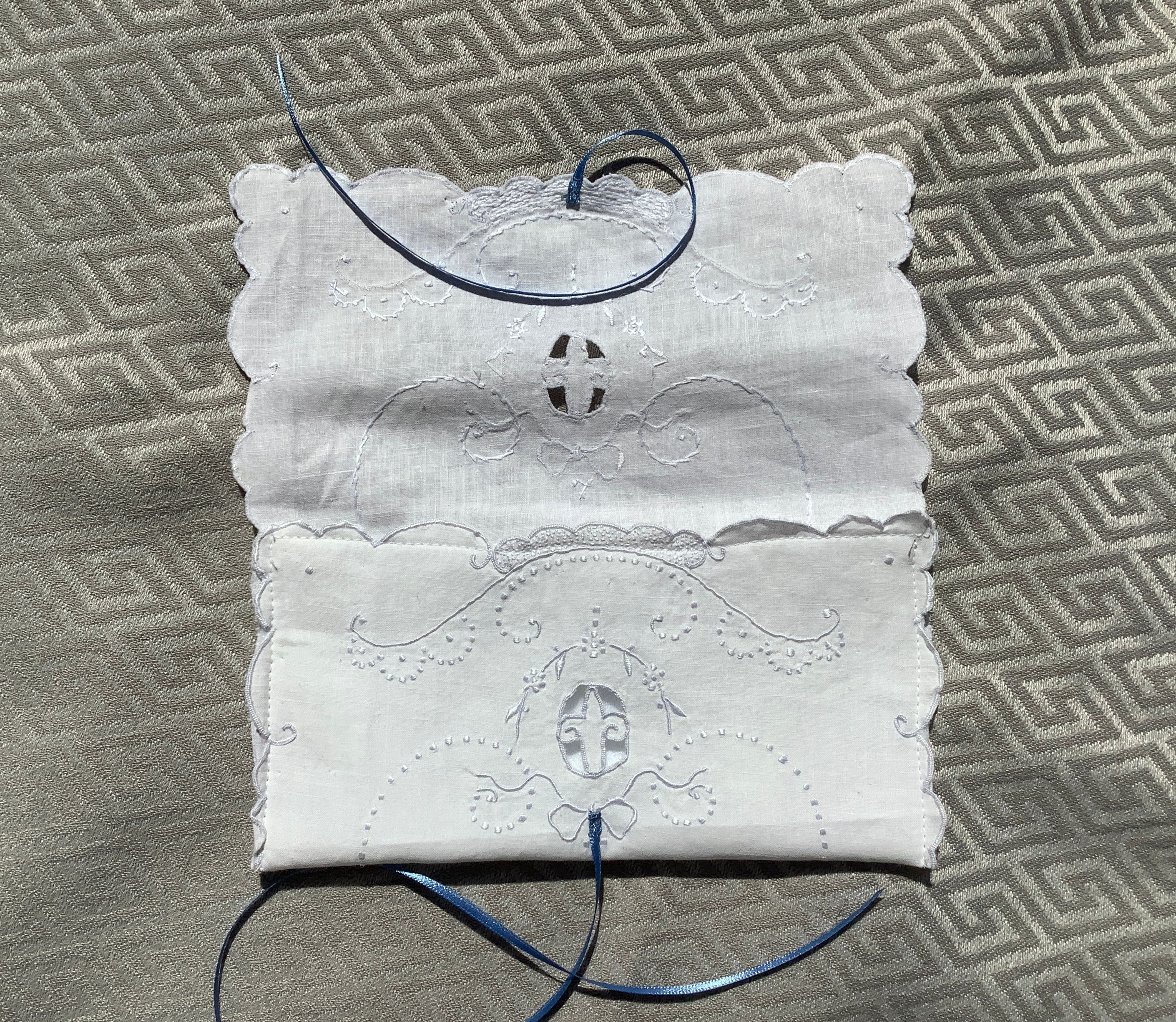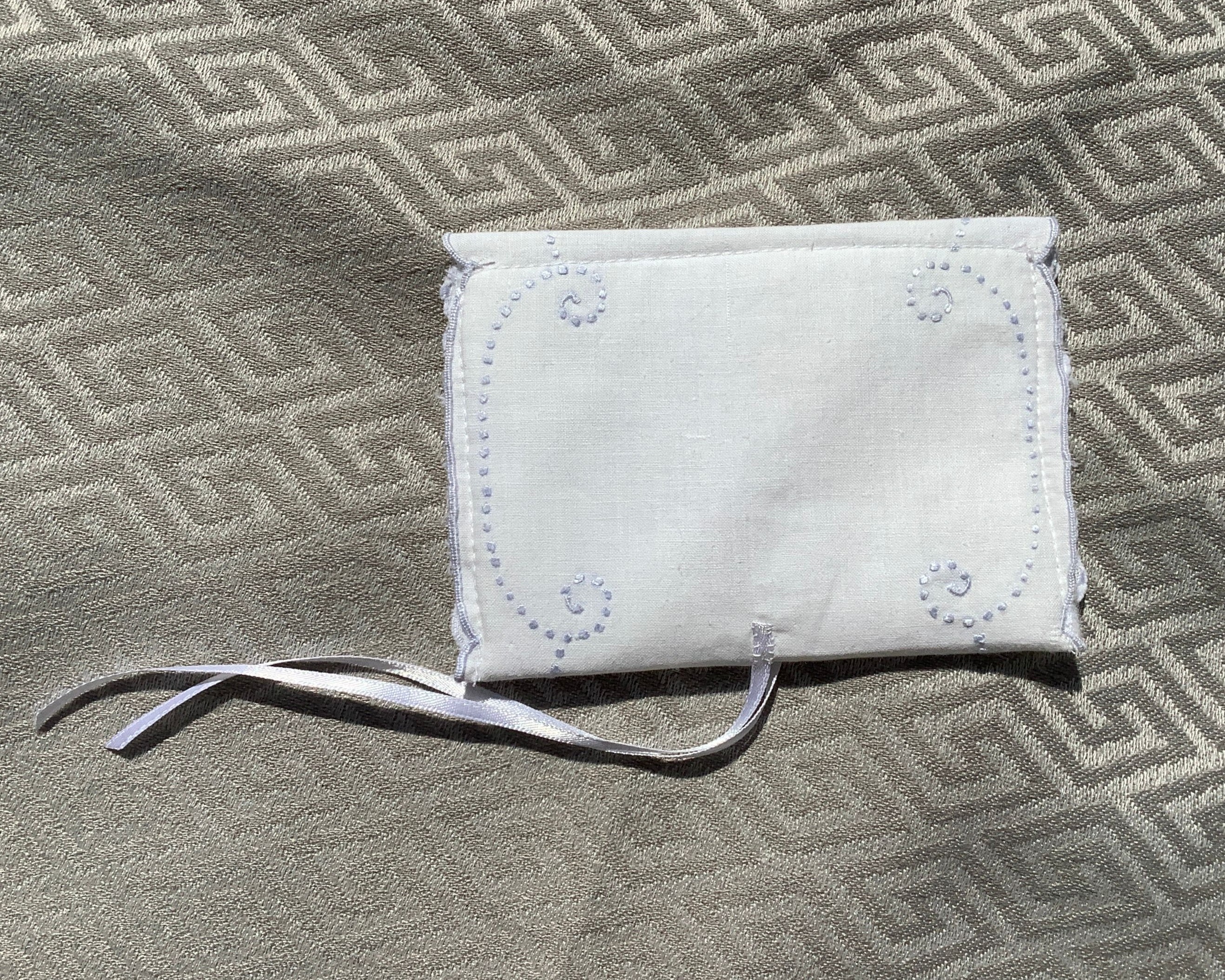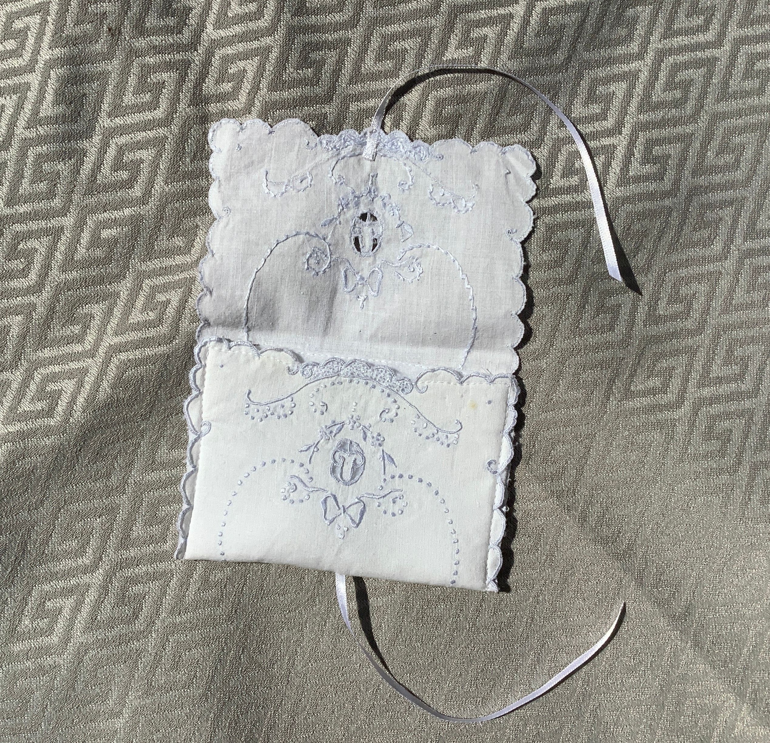 This cute and useful little pouch is made from a white cotton vintage linen that is delicately embroidered with pale blue designs and a cutout motif ~ They are lined with a thick white felt