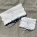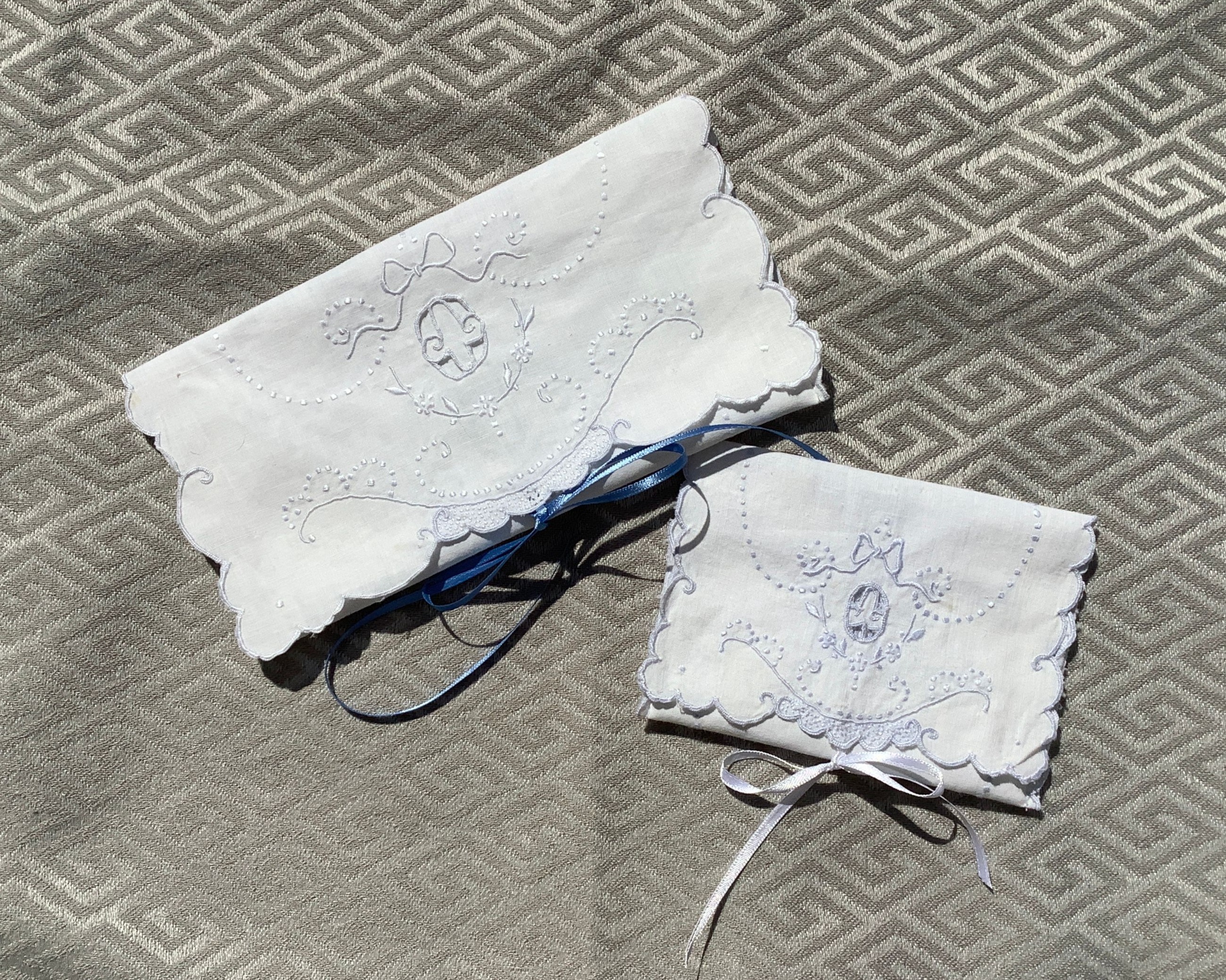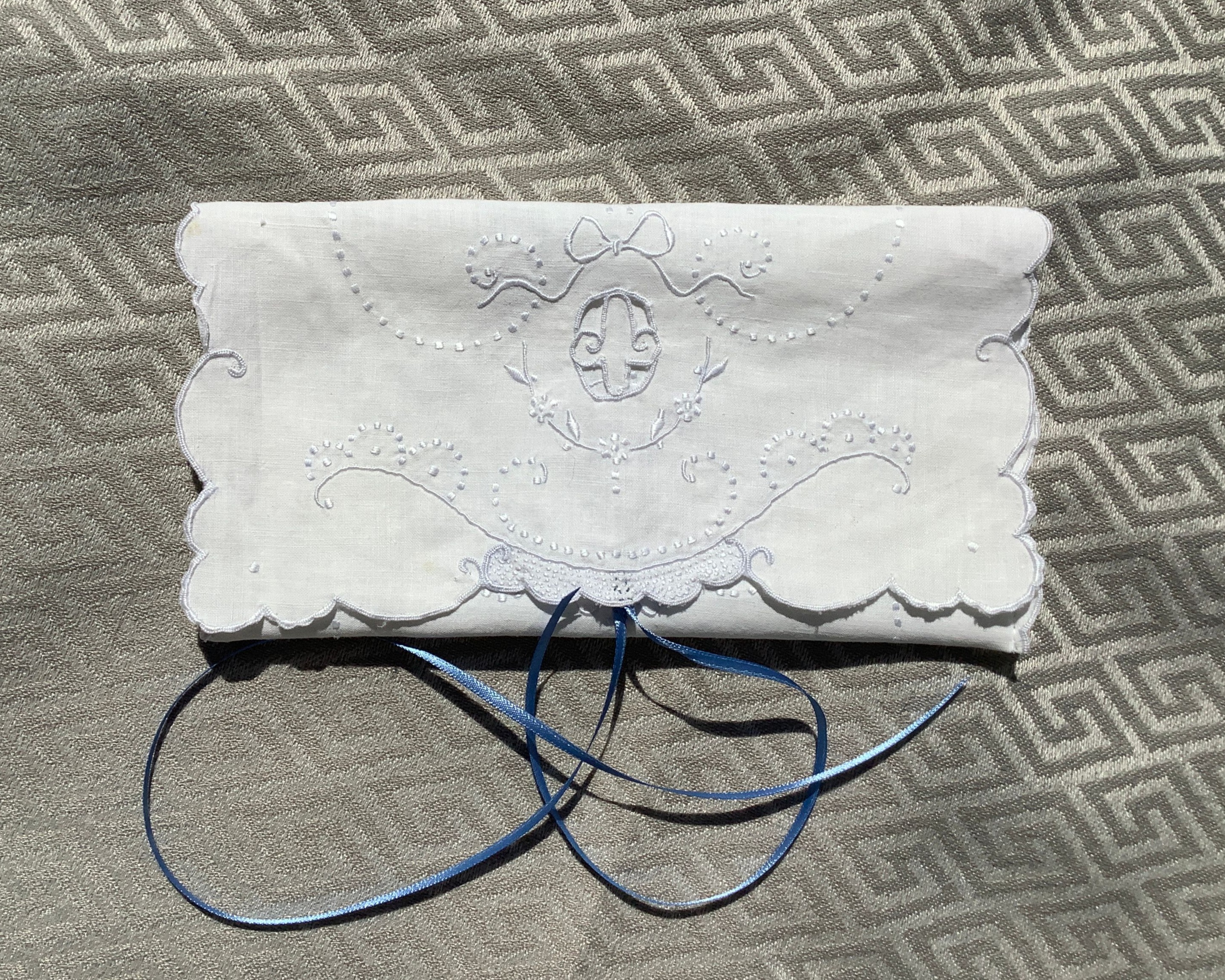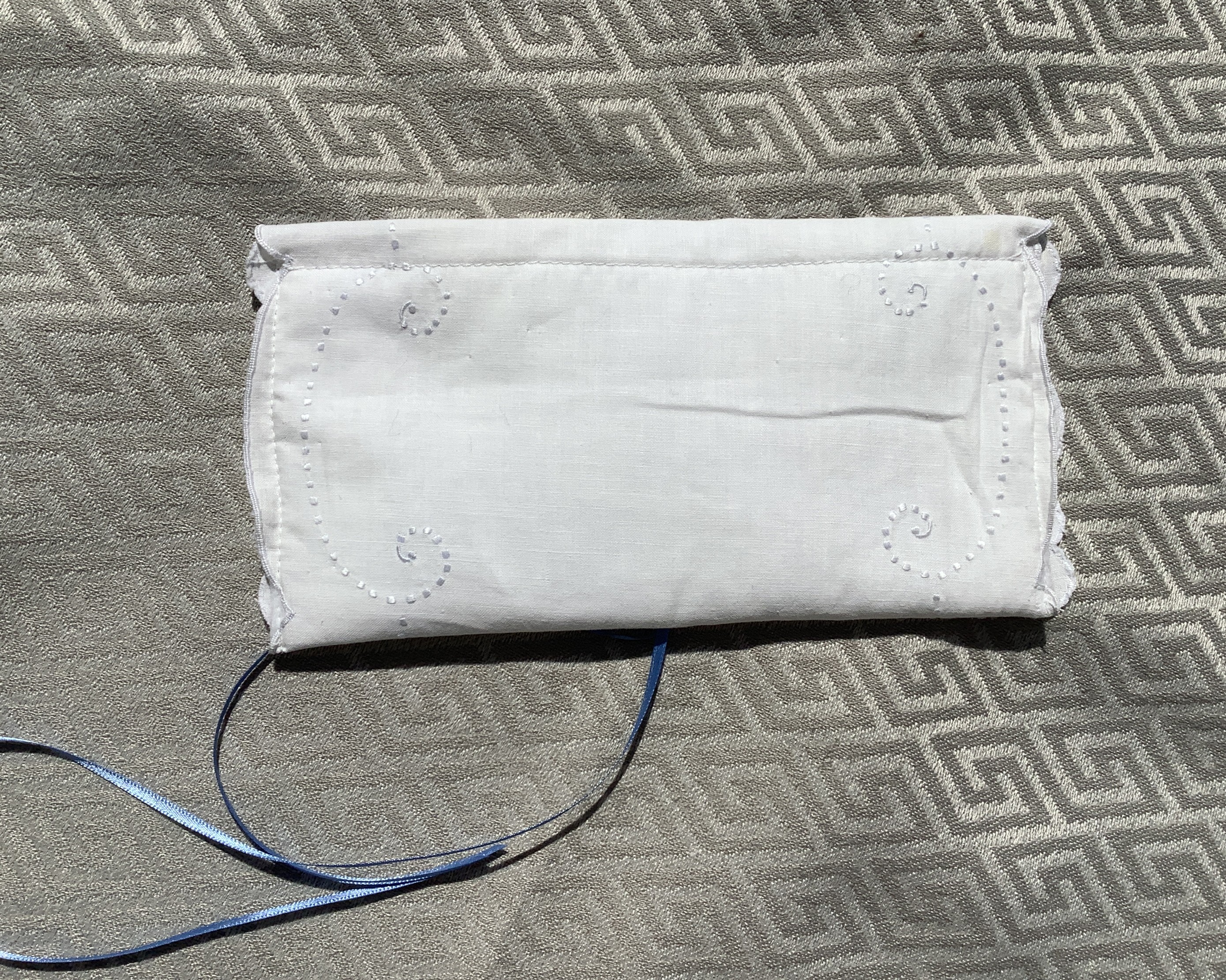 This cute and useful little pouch is made from a white cotton vintage linen that is delicately embroidered with pale blue designs and a cutout motif ~ They are lined with a thick white felt