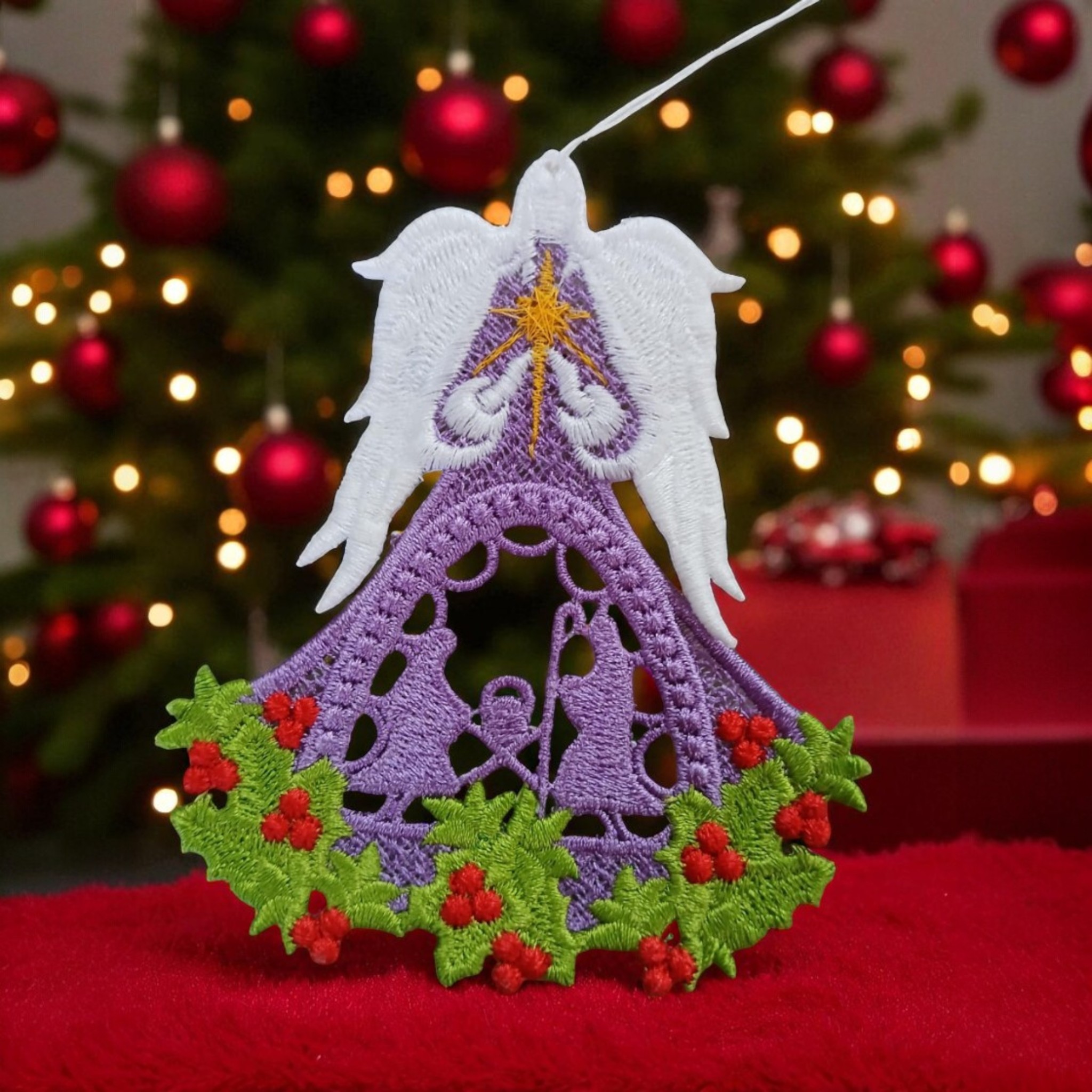 I embroidered these Angels in colors of lilac, green, red, gold and white. Has a Manger design in the middle. They measure 4 inches wide and 3 inches long. Has a white yarn thread for hanging.