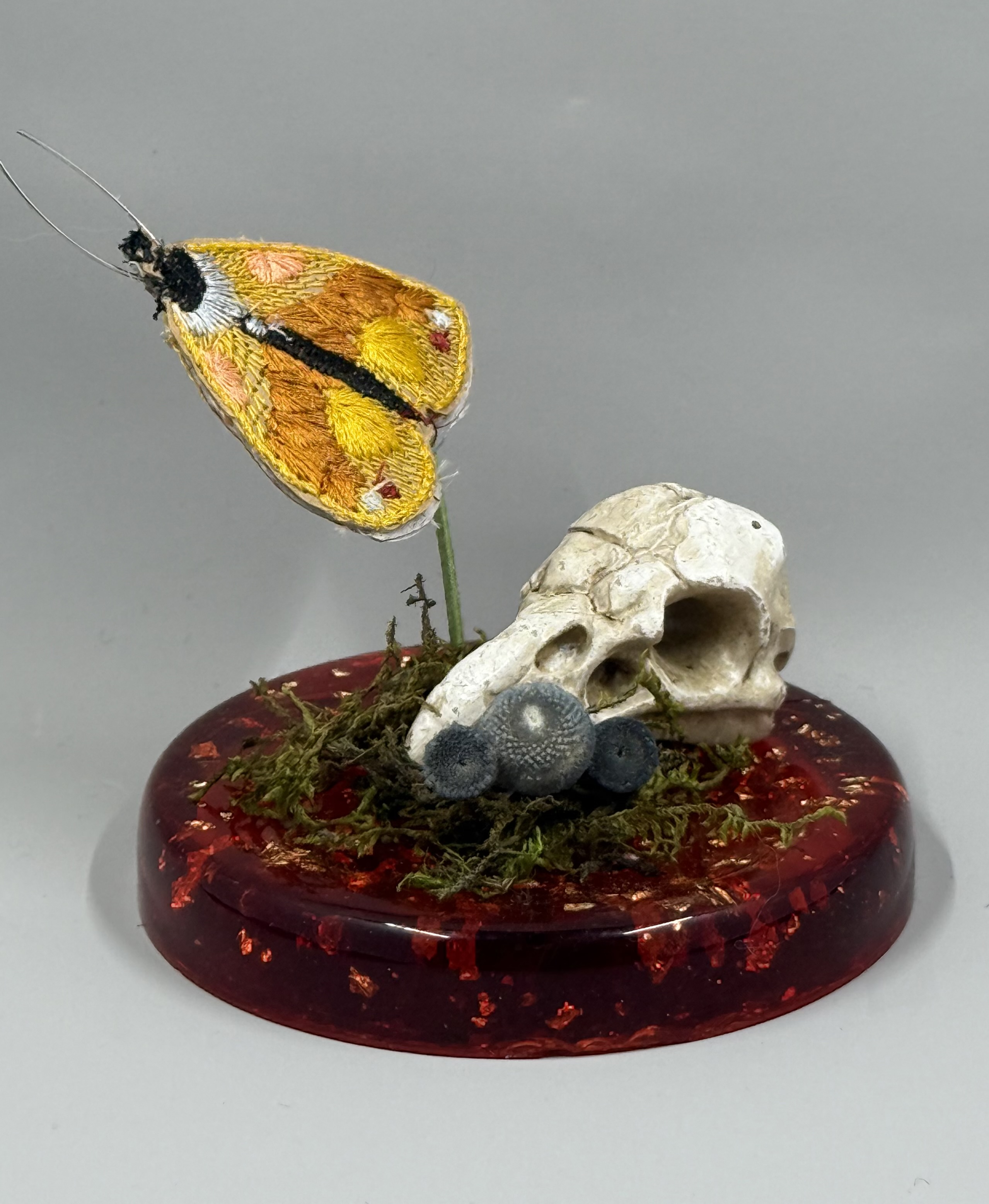 This is an embroidered moth design flying over a bird skull just sitting in a nest of moss on a rose red resin base with gold leaf inside. This is a one of a kind item.