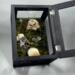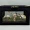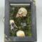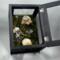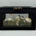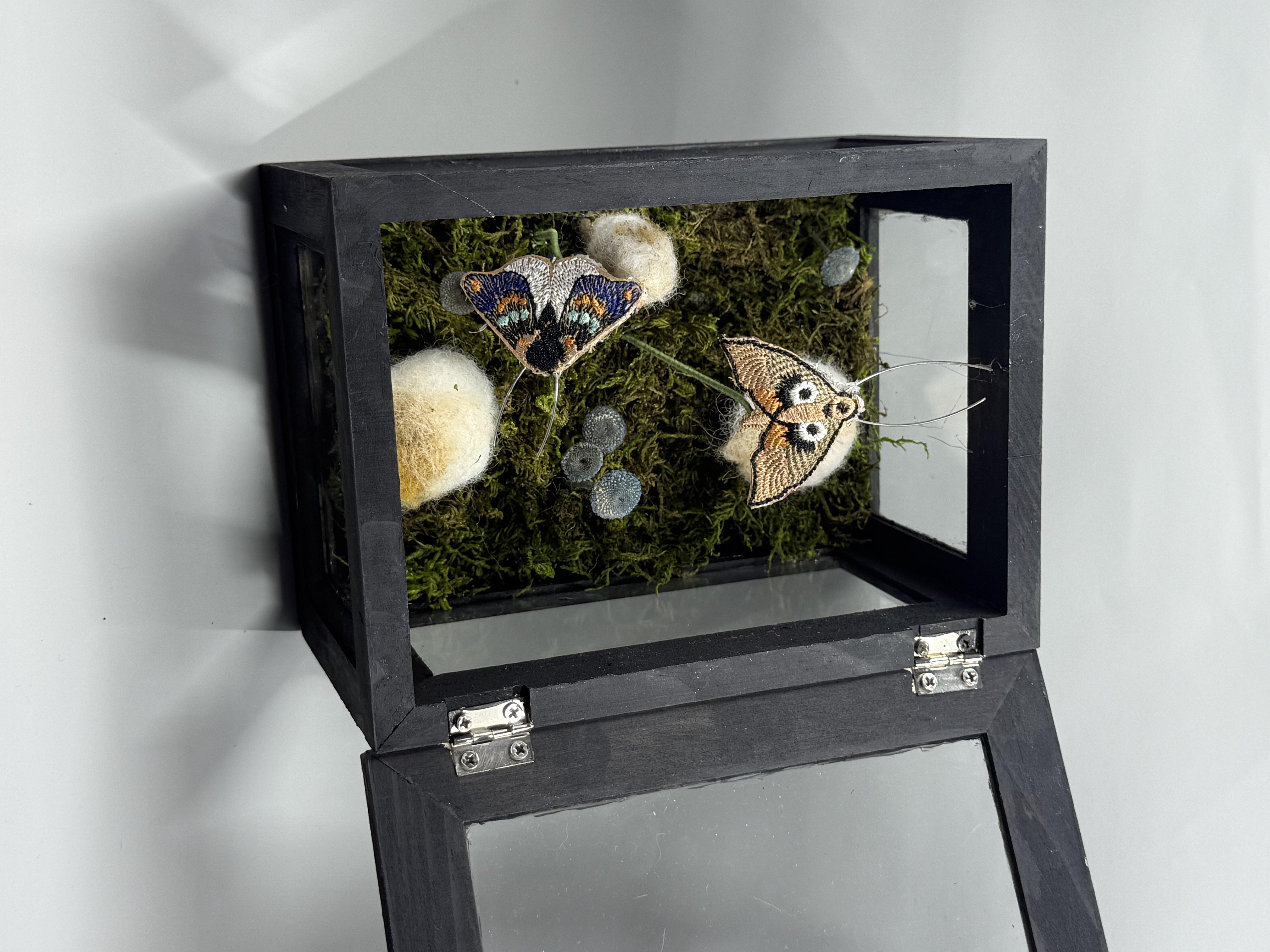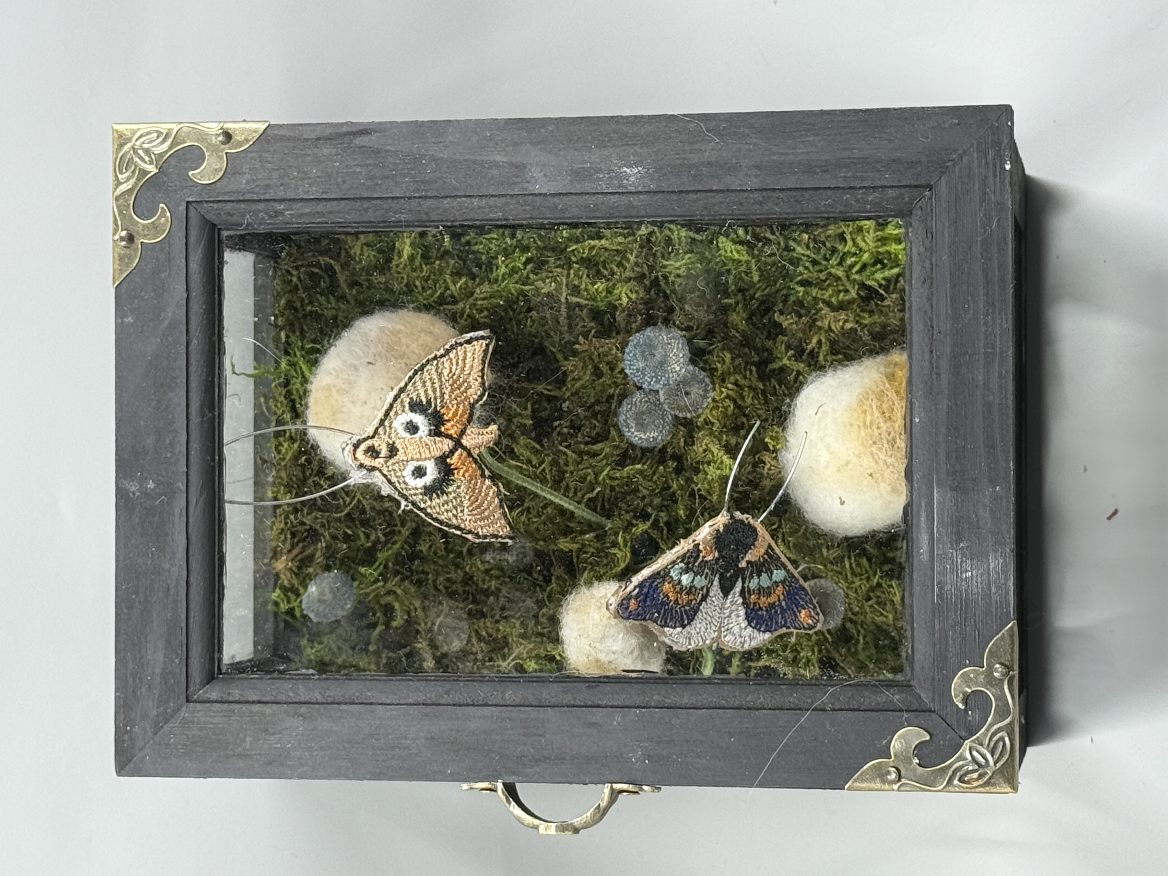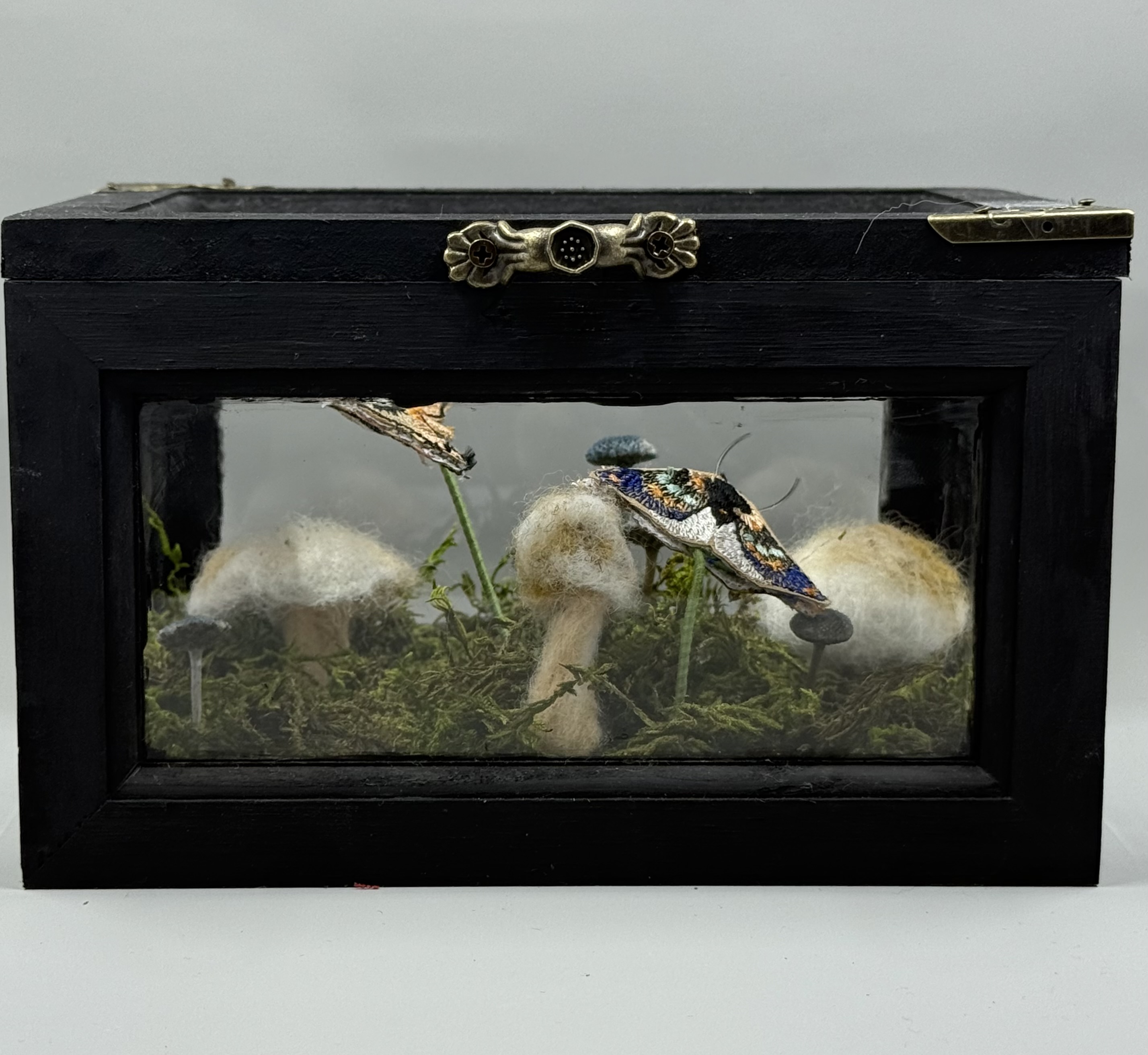 Wouldn’t display box sculpture with glass on five sides inside we have a pair of embroidered months along with some handmade fabric mushrooms on a bed of moss. The lid is on a hinge with decorative corner pieces