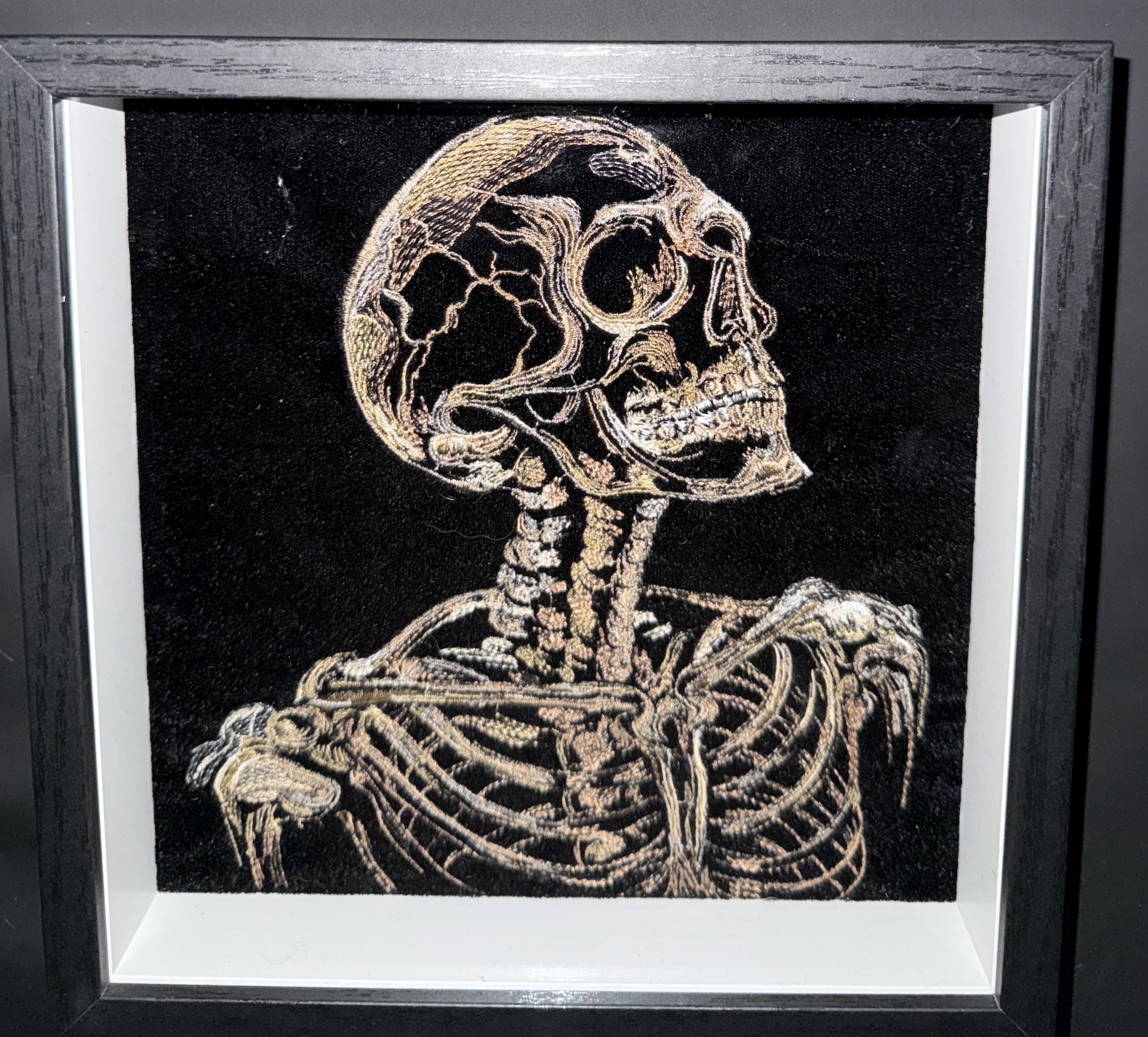 This item is a machine embroidered skull, and upper torso of a human. Embroidered on black velvet and encased in a 8“ x 8“ x 1.75“ black shadowbox.