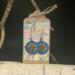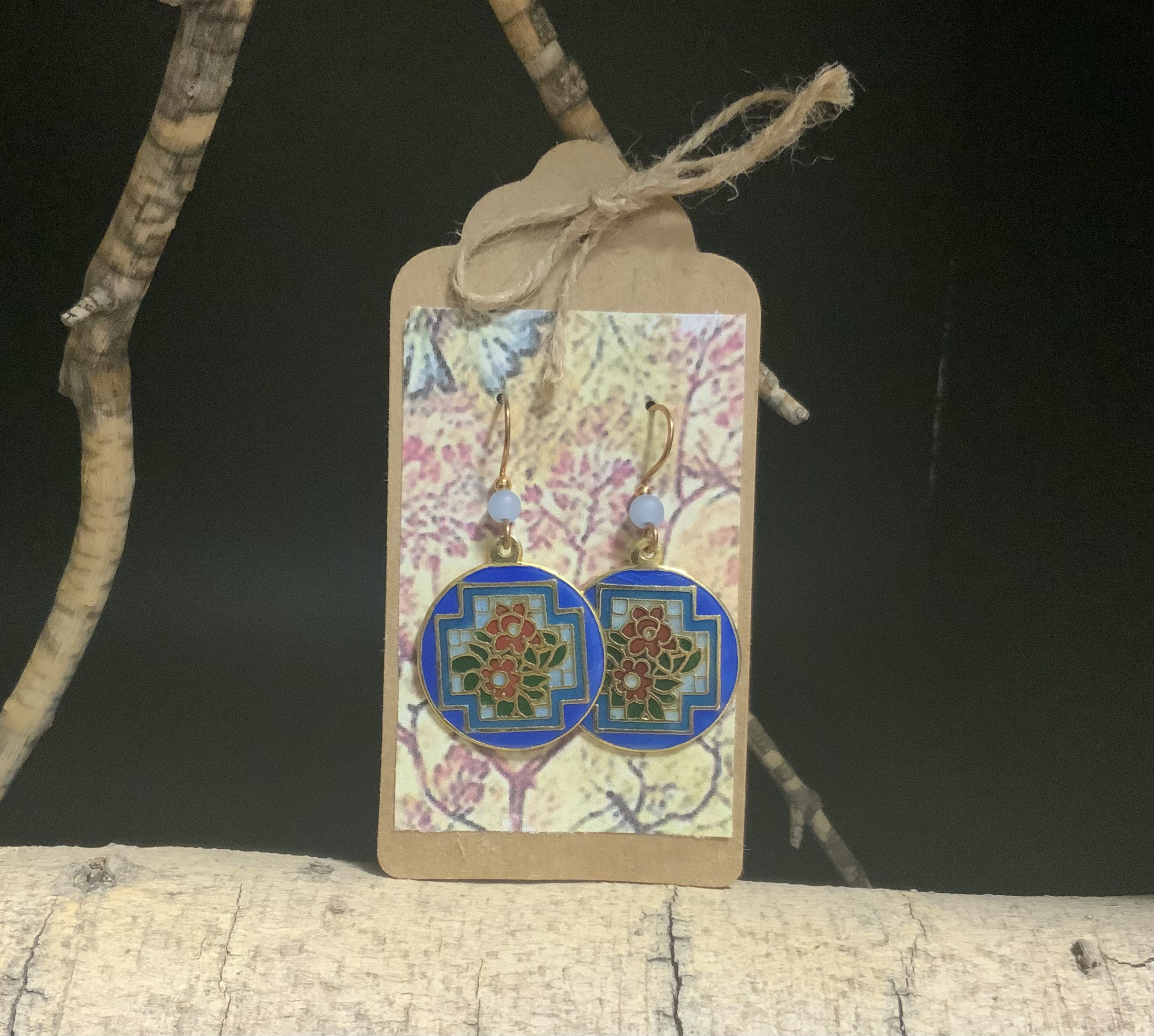 These earrings have handmade bronze ear wires with 4mm light sapphire Beach-Style glass beads. The red flower patterned drops are hand applied enamel to make the patterns look like traditional cloisonné. Very unique. Each pair of earrings comes displayed on a handmade card.