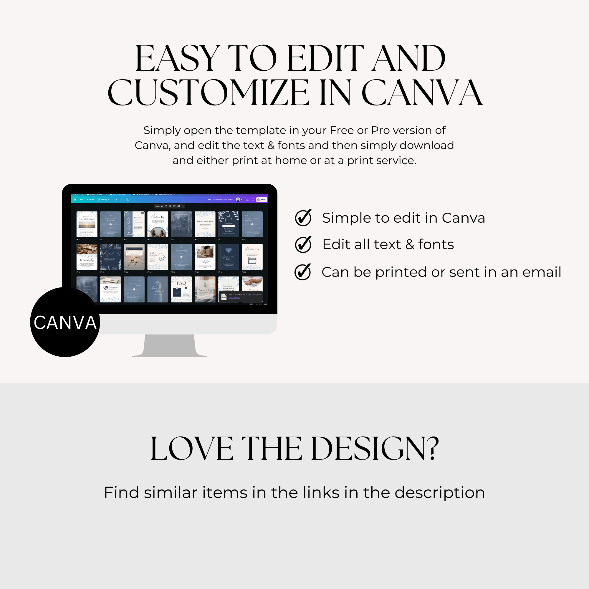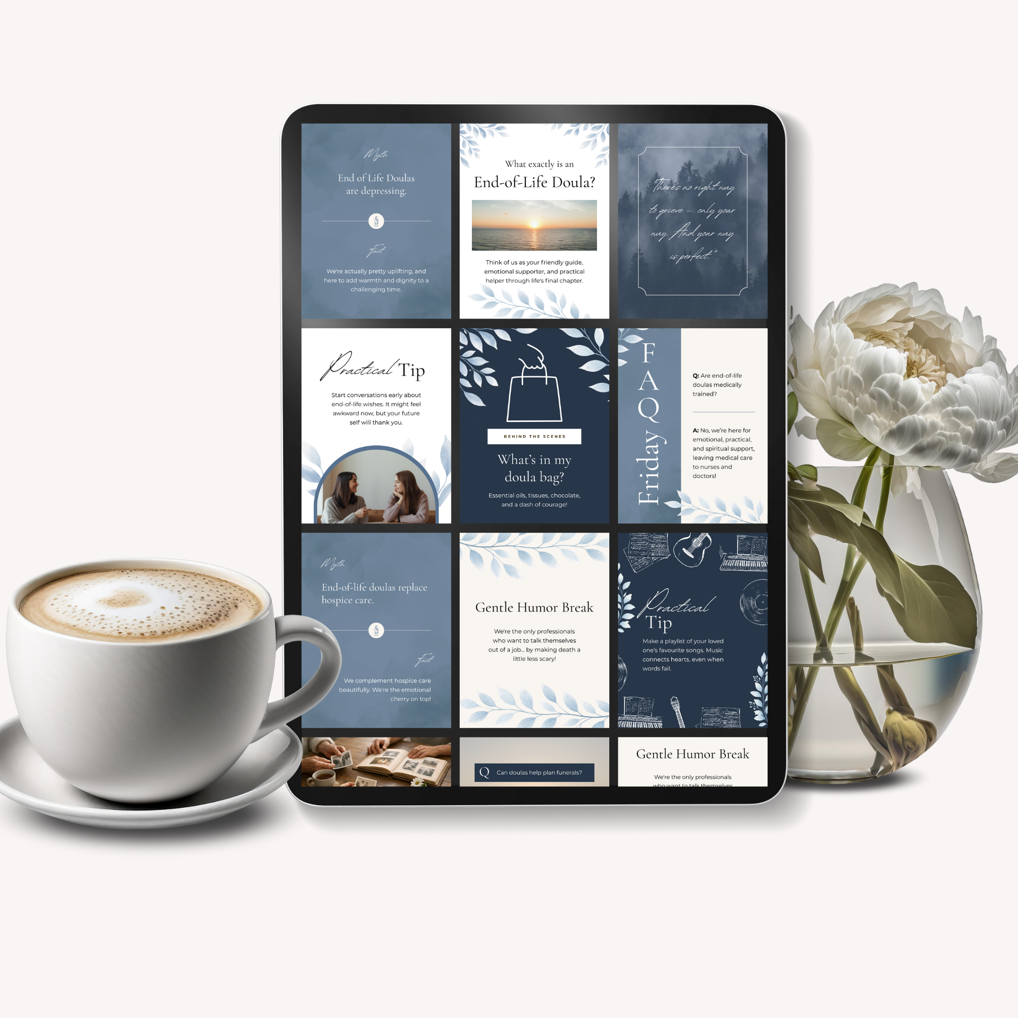 This editable Canva template bundle gives end-of-life doulas, death doulas, grief workers, and caregivers ready-to-use social media posts designed to educate, comfort, and open meaningful conversations.