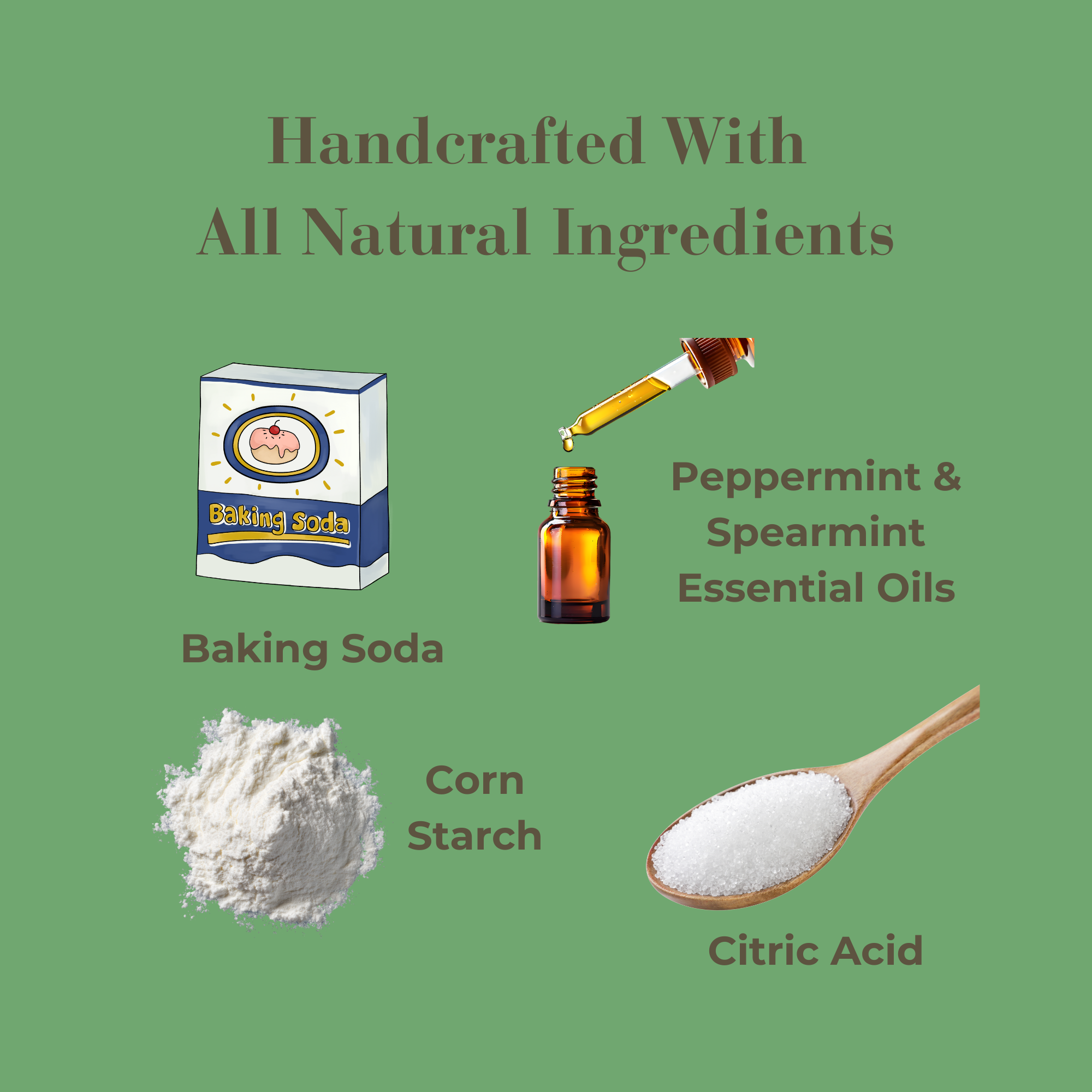 Ingredients: Baking Soda, Citric Acid, Corn Starch, Peppermint Essential Oil, Spearmint Essential Oil, Cosmetic Grade Mica Powder
