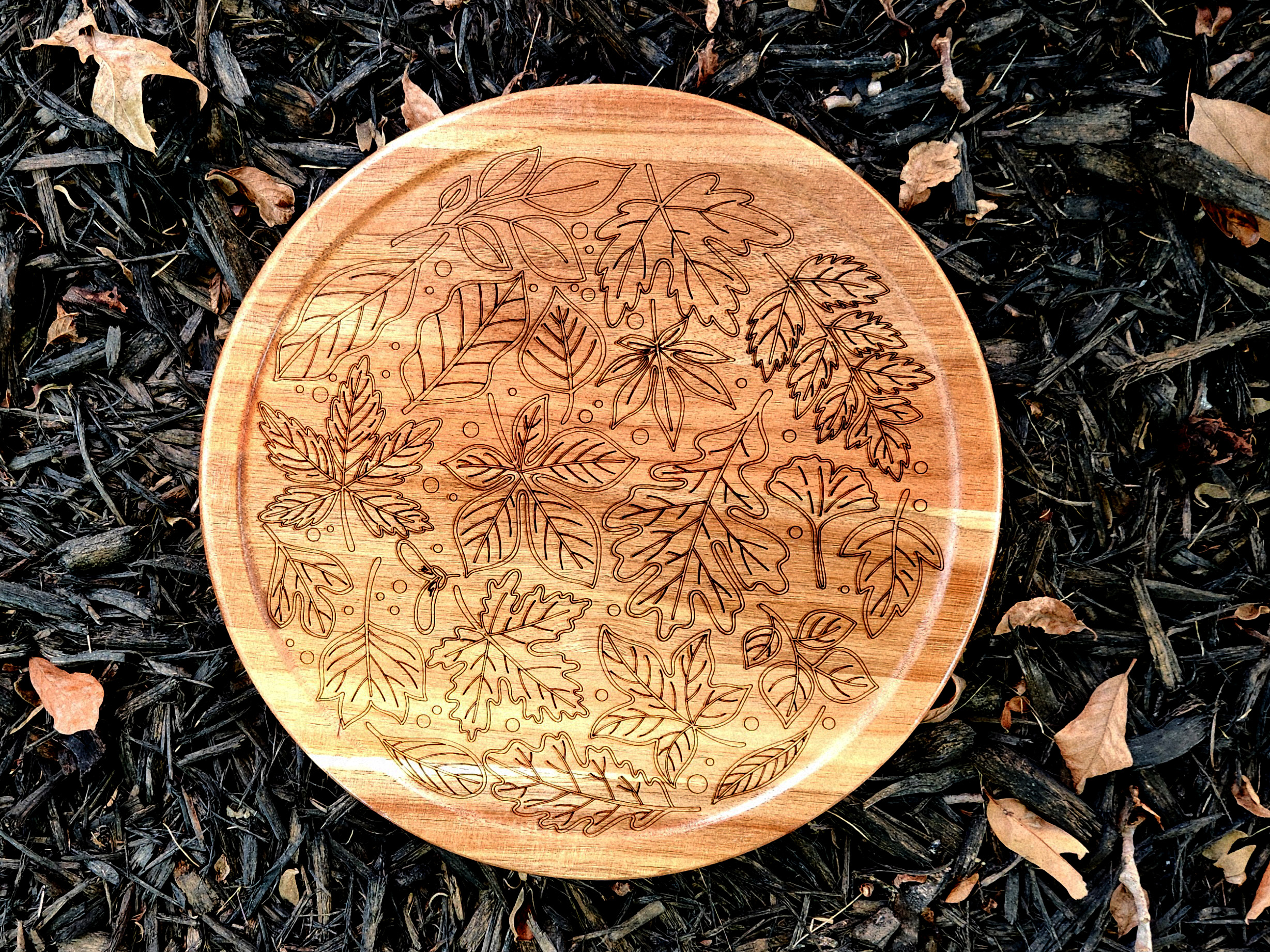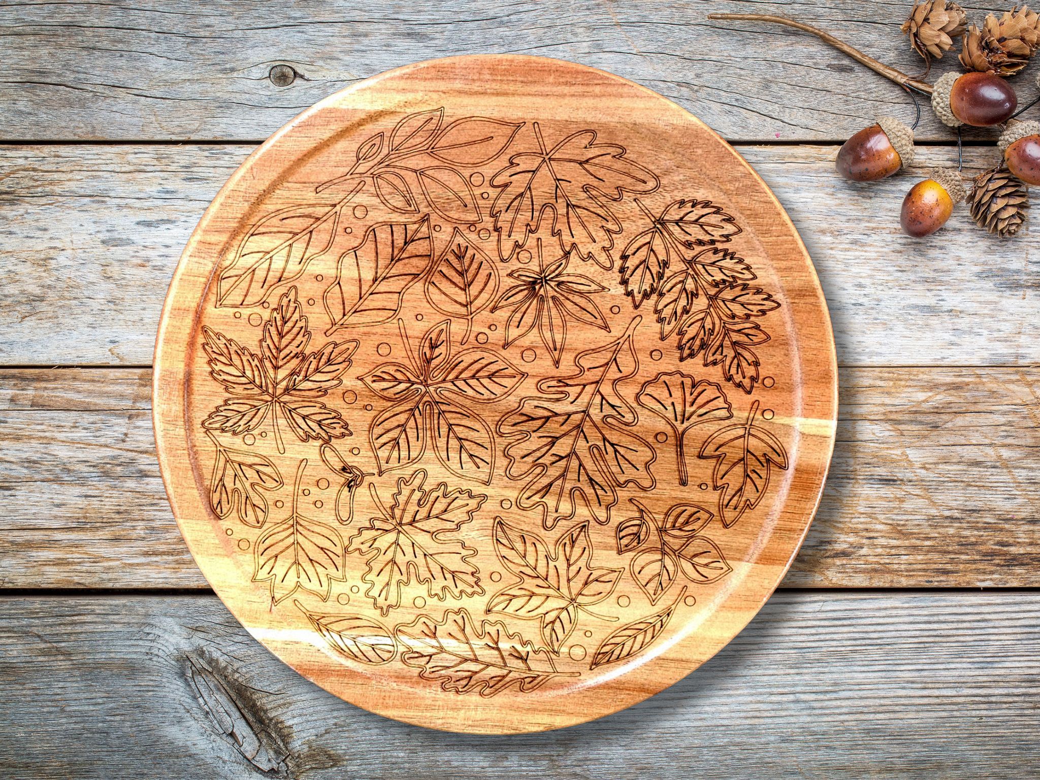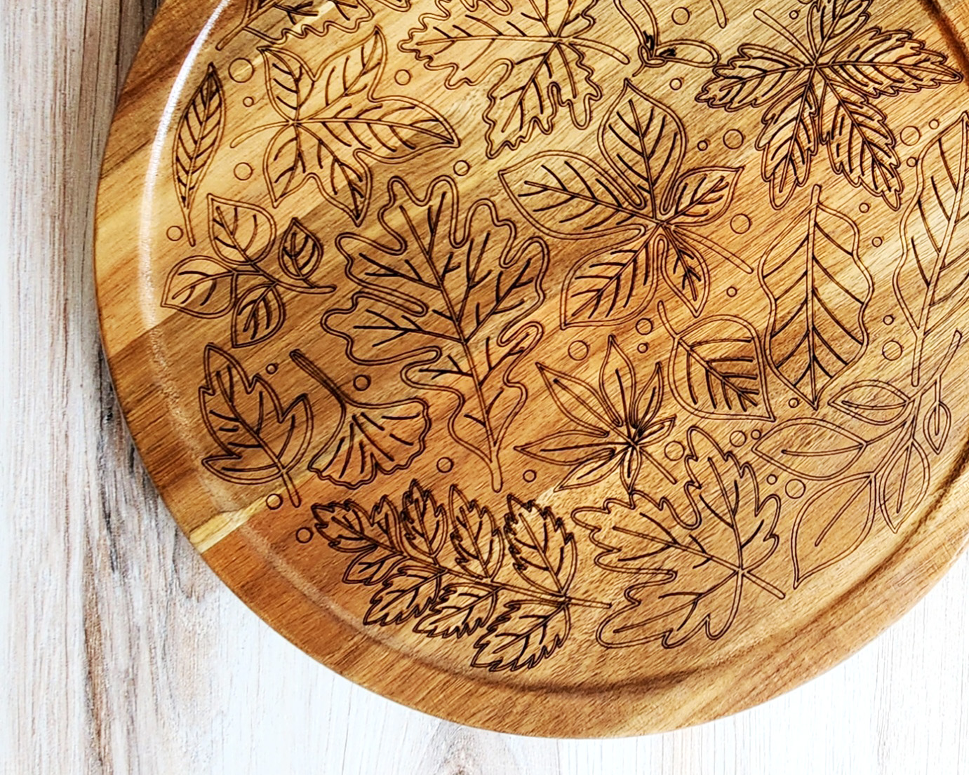 This engraved Lazy Susan features a fun design of fall leaves, all intricately engraved into the wood. It’s not just pretty; it’s also super practical.