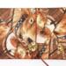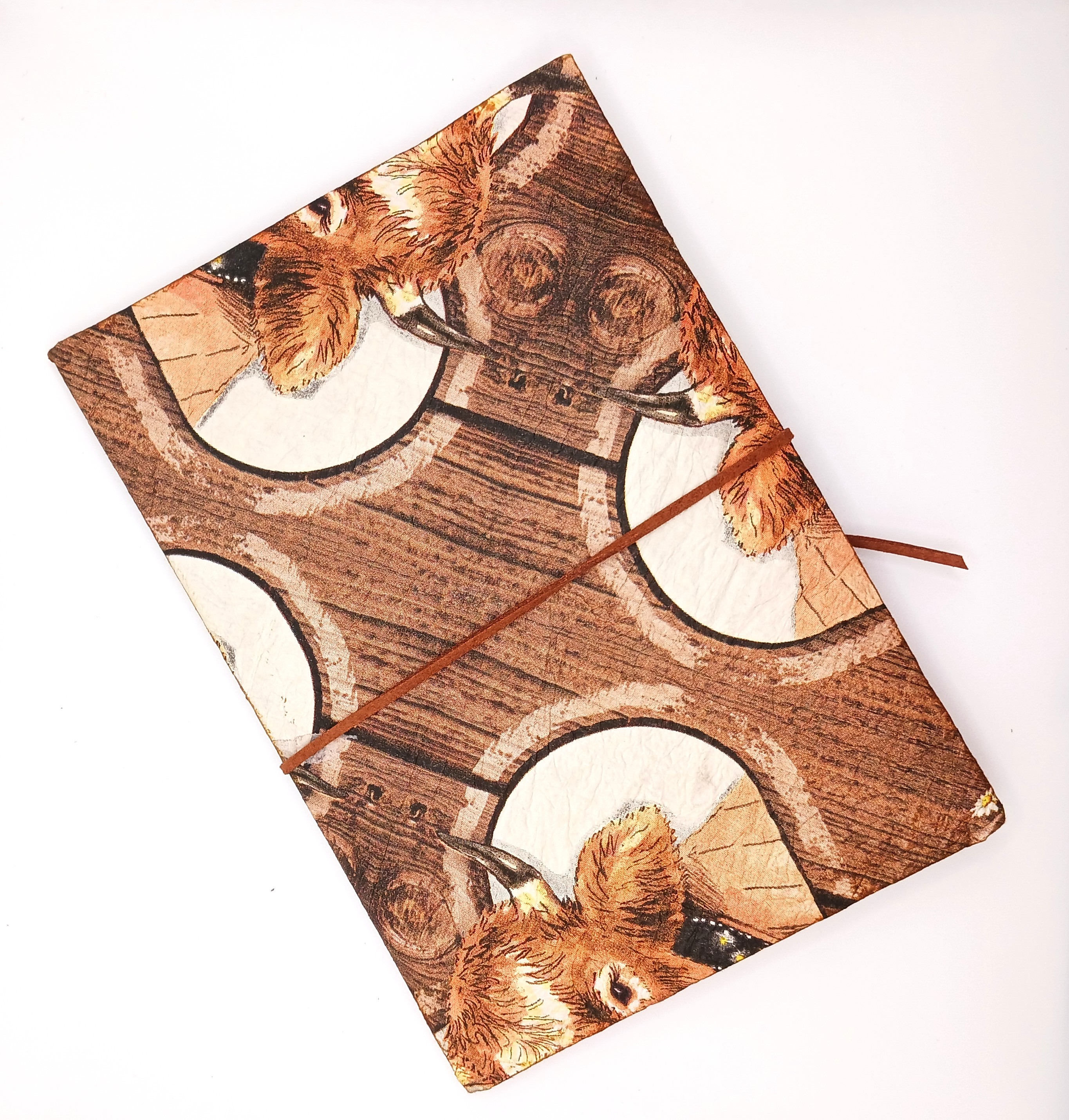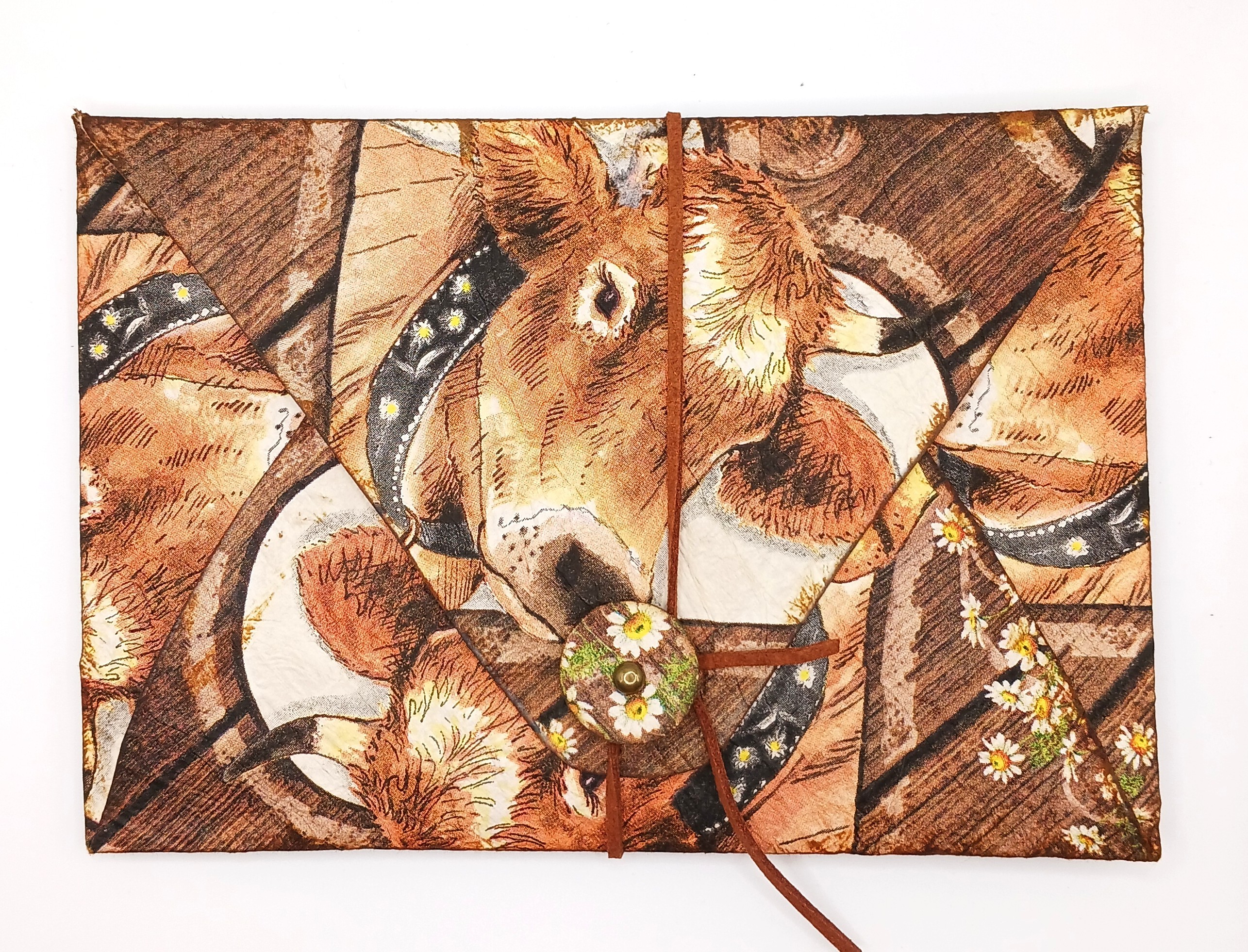 The cow pouch is made from designer napkins, the result is a tough sturdy paper made into an envelope pouch. Perfect for journals or keeping your art projects in, for a gift, stationery, lots of things. Closure is thin leather strip wrapped around a handmade button. The pouch measures ------ The pouch includes a writing journal