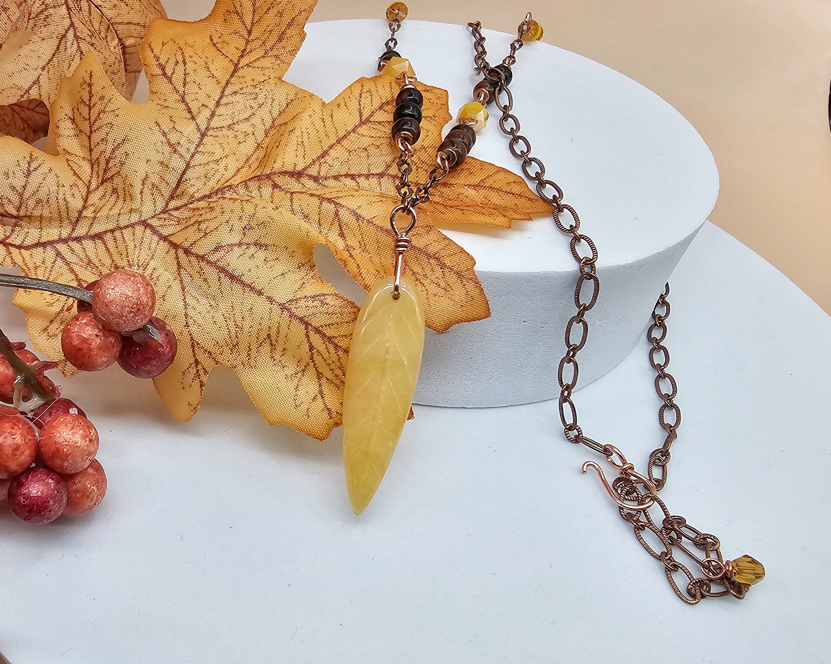 The copper chain is finished with a handmade hook clasp for a secure and personal touch and some flexibility in length. The etched golden quartz leaf pendant adds a beautiful focal point, reflecting light with a soft, golden glow.