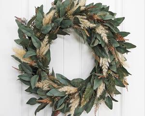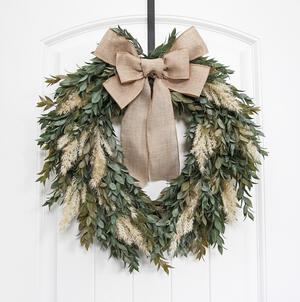Deep green eucalyptus with cream aspen leaves and bunny tail wreath is the perfect fall wreath for your front door. This neutral wreath is full of different textures that mix to create a cohesive autumn wreath that will carry you from summer into winter. The eucalyptus leaves are wispy, the aspen are different sizes and realistic and the bunny tails create a furry, unique look that you will enjoy for many years!This wreath is made full and lush, with high-quality materials, just like I would make it for my own home.