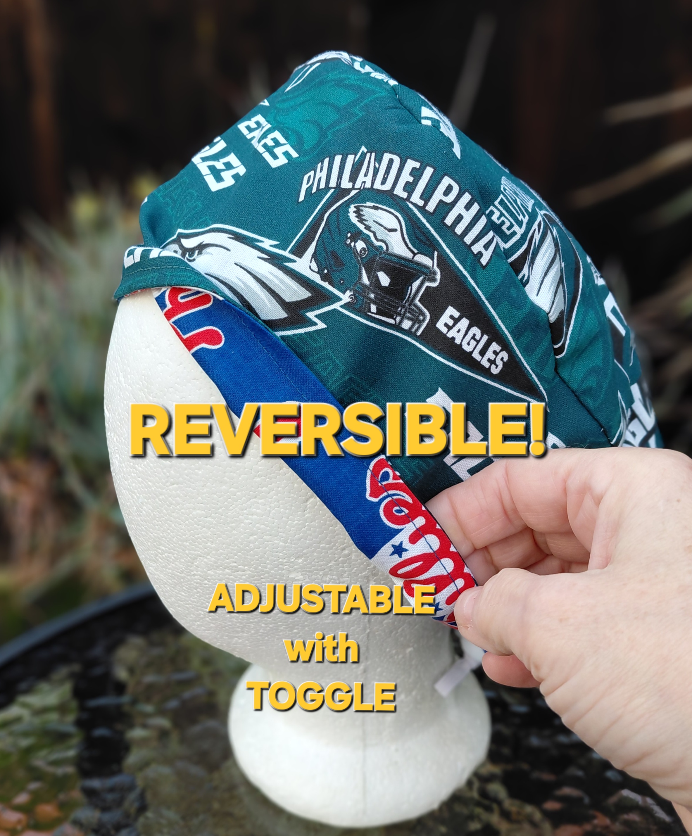 Two teams in one euro style scrub hat! Reversible Phillies and Eagles licensed prints. Adjustable with elastic and toggle (cord lock). Handmade from high quality woven cotton fabrics. Not affiliated with the teams or leagues.