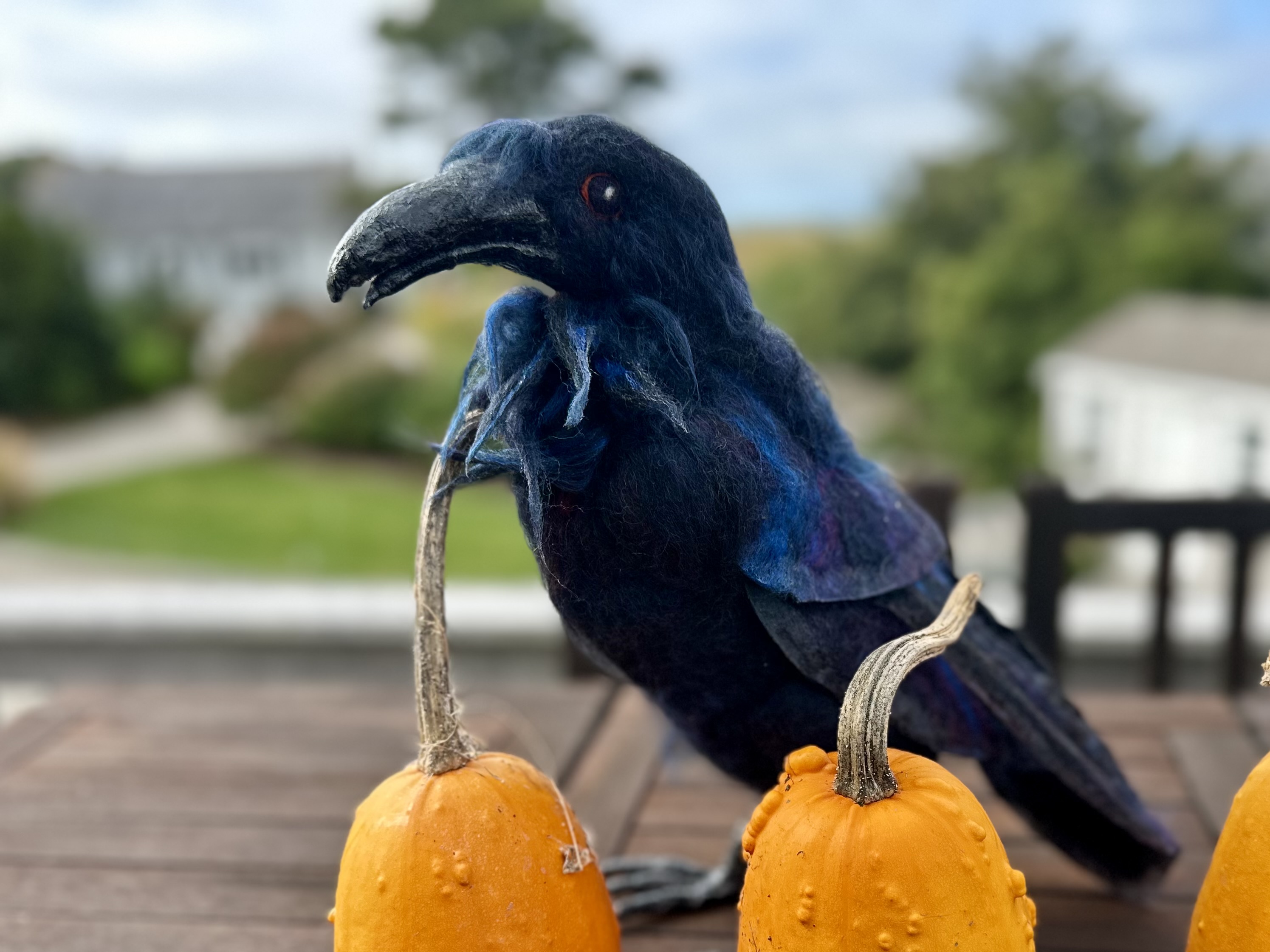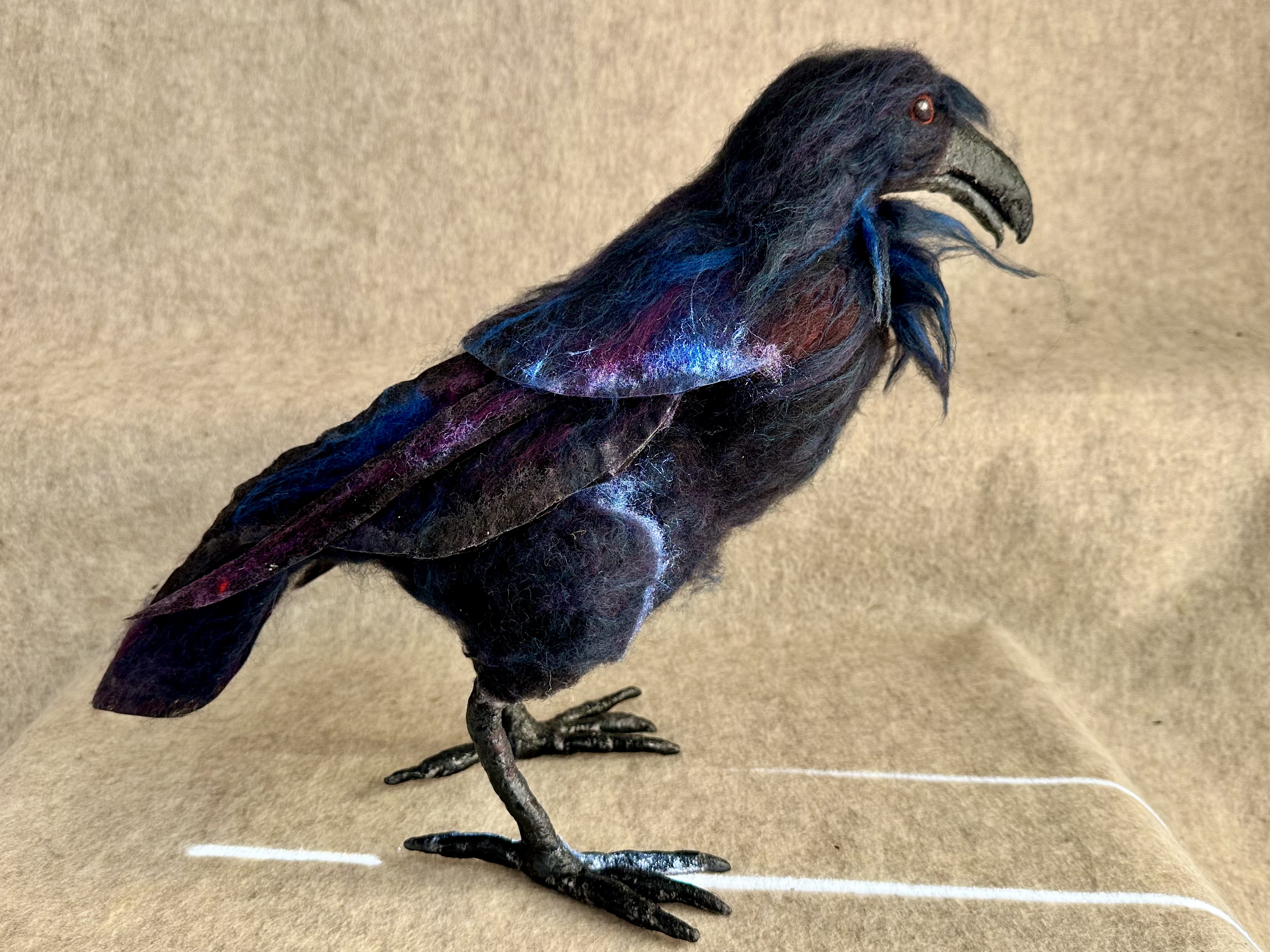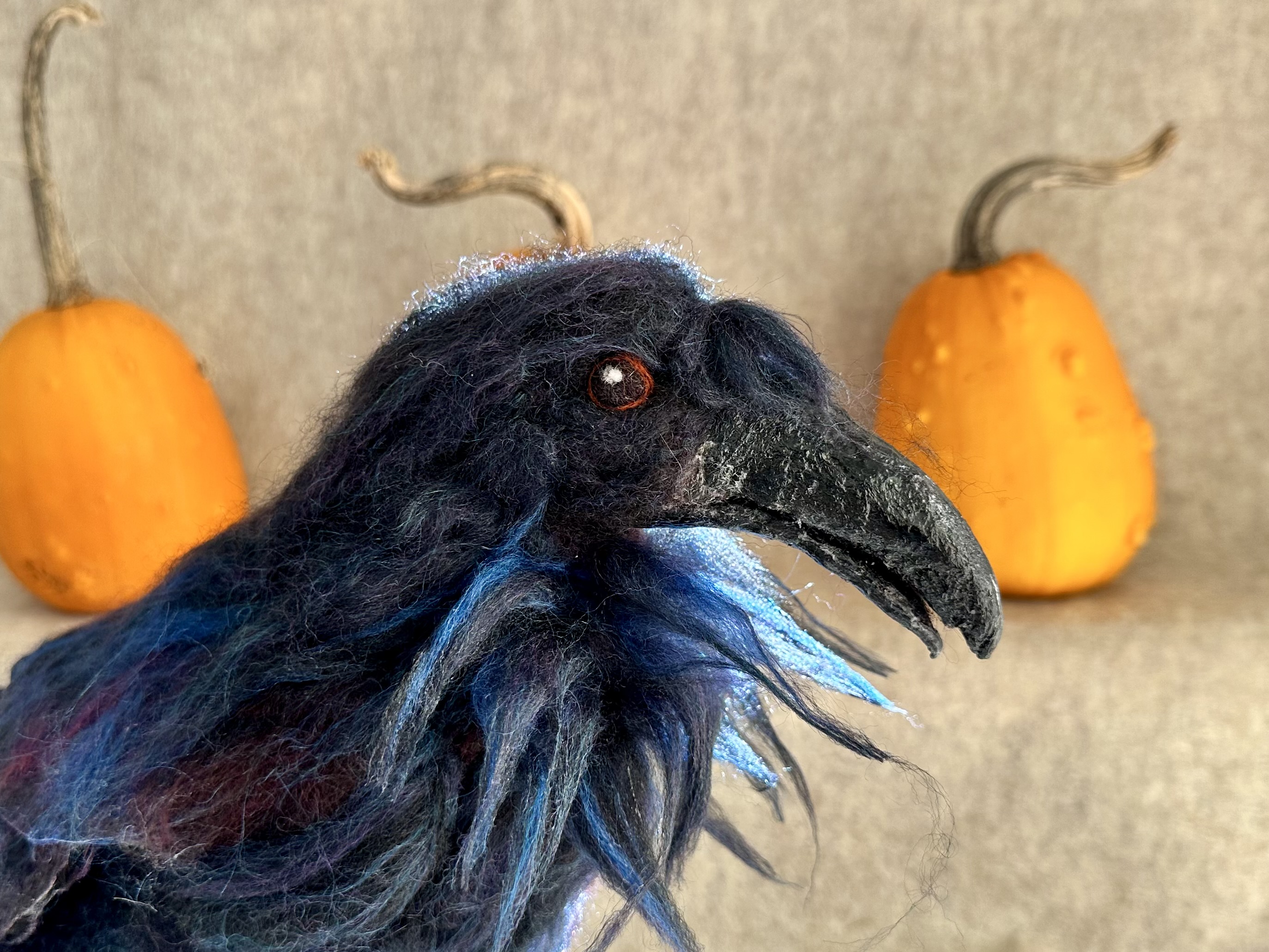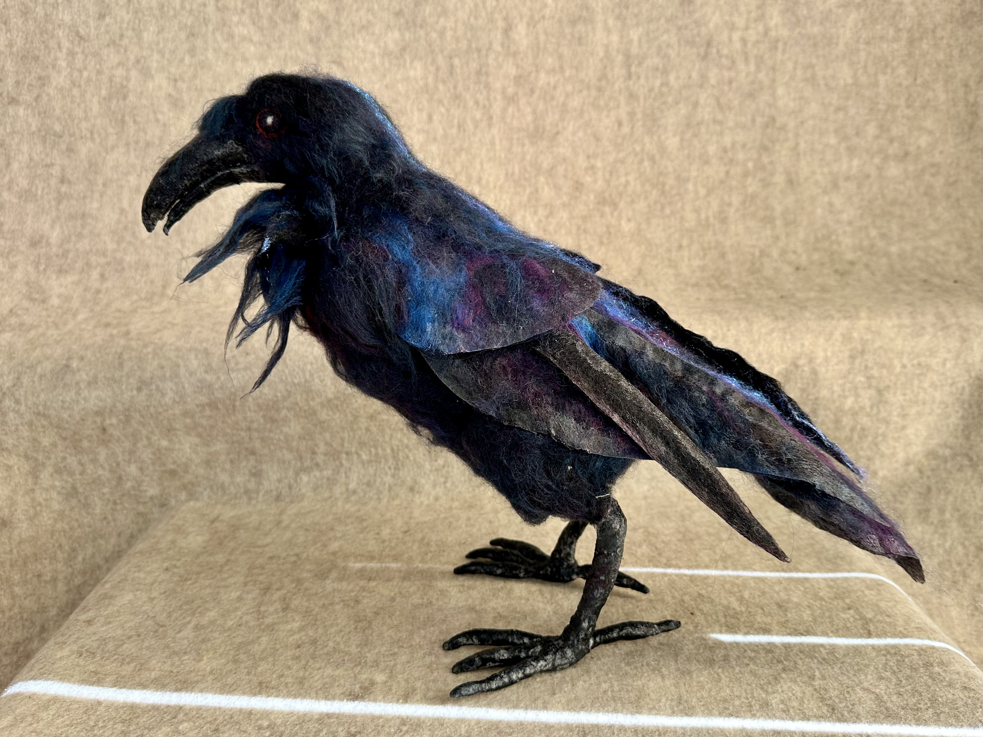 Magnificent true to life needle felted Halloween Raven sculpture hand-felted with premium wool. This one-of-a-kind collectible measures 13" wide and 19" tall. Dressed in feathers of 100% wool, her feet are wired, her beak is made of clay, her eyes are glass. Evangeline Blackwing makes a dramatic statement for Halloween displays, gothic home decor, or witchy altar spaces. Perfect for collectors of handmade dark fantasy art and occult-inspired decor.