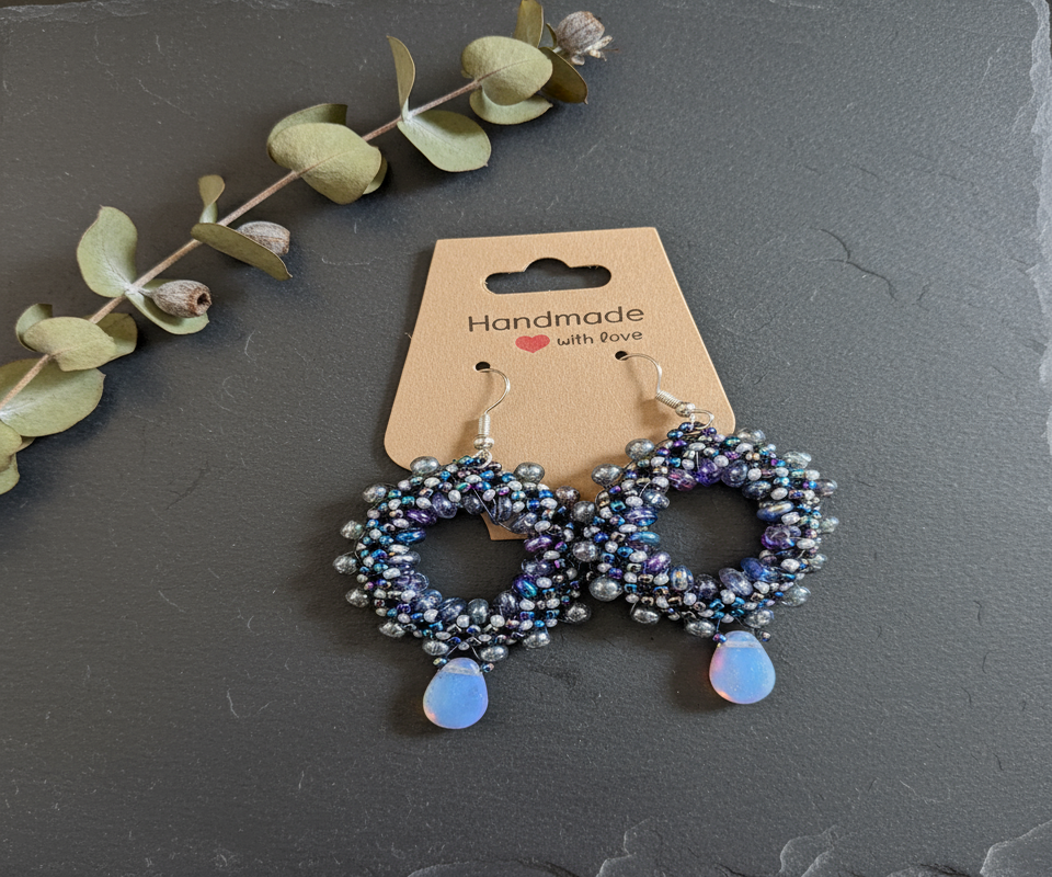 Shine bright—even in your favorite tee. These handmade hoops are bursting with moody shimmer and metallic texture, featuring deep iridescent glass beads, silver accents, and a single glowing teardrop dangle. They’re equal parts playful and polished—perfect for jeans, leather jackets, or a night out with friends.