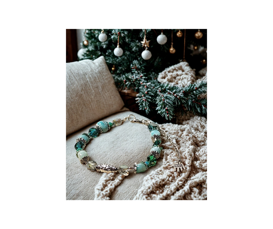 Each bead is carefully selected to reflect the beauty of winter — shimmering greens, soft silver accents, and elegant amazonite beads that sparkle like a Christmas morning. Whether you’re dressing up for a festive gathering or giving a heartfelt handmade gift, this bracelet adds a timeless touch of warmth and charm.