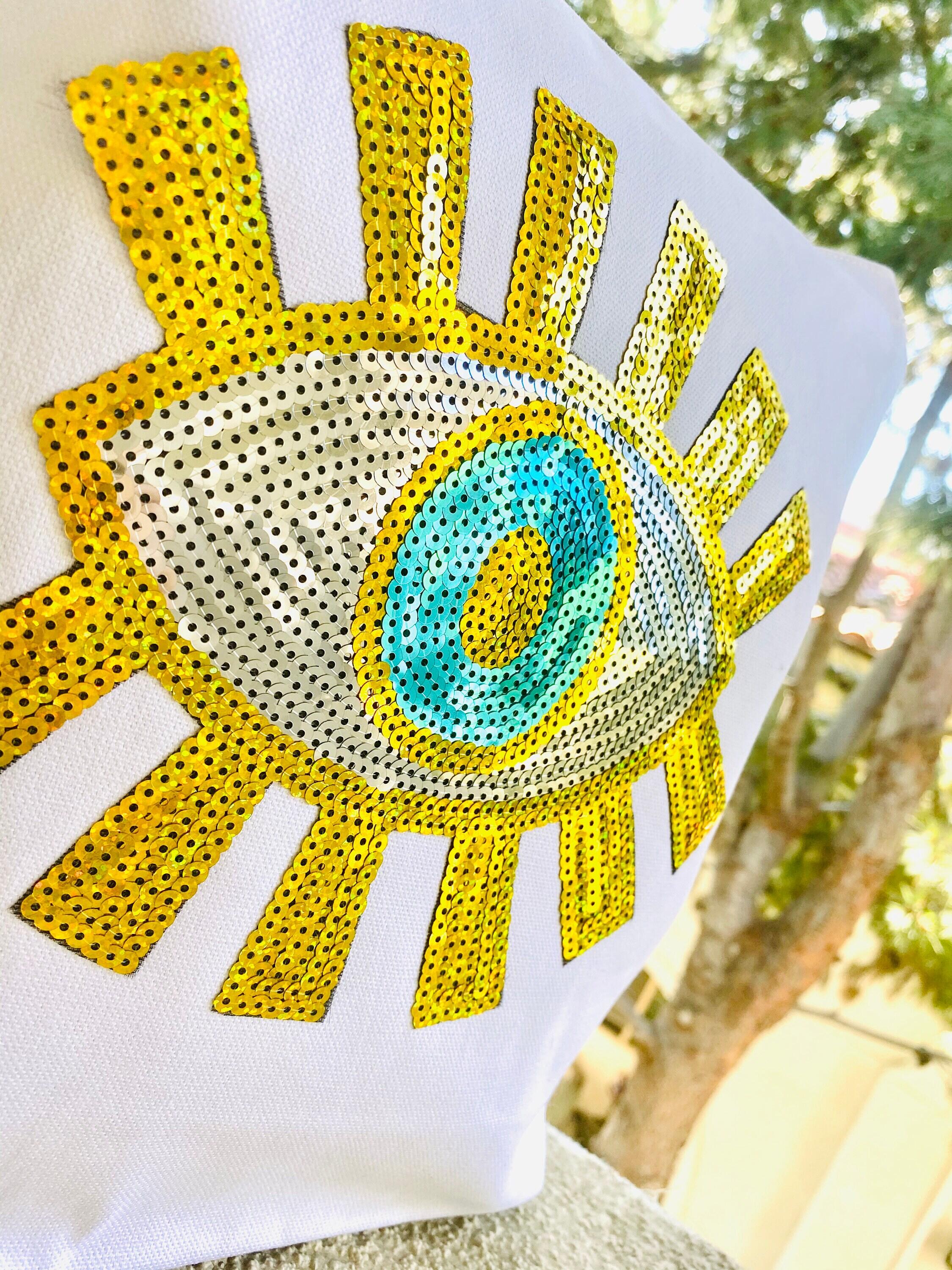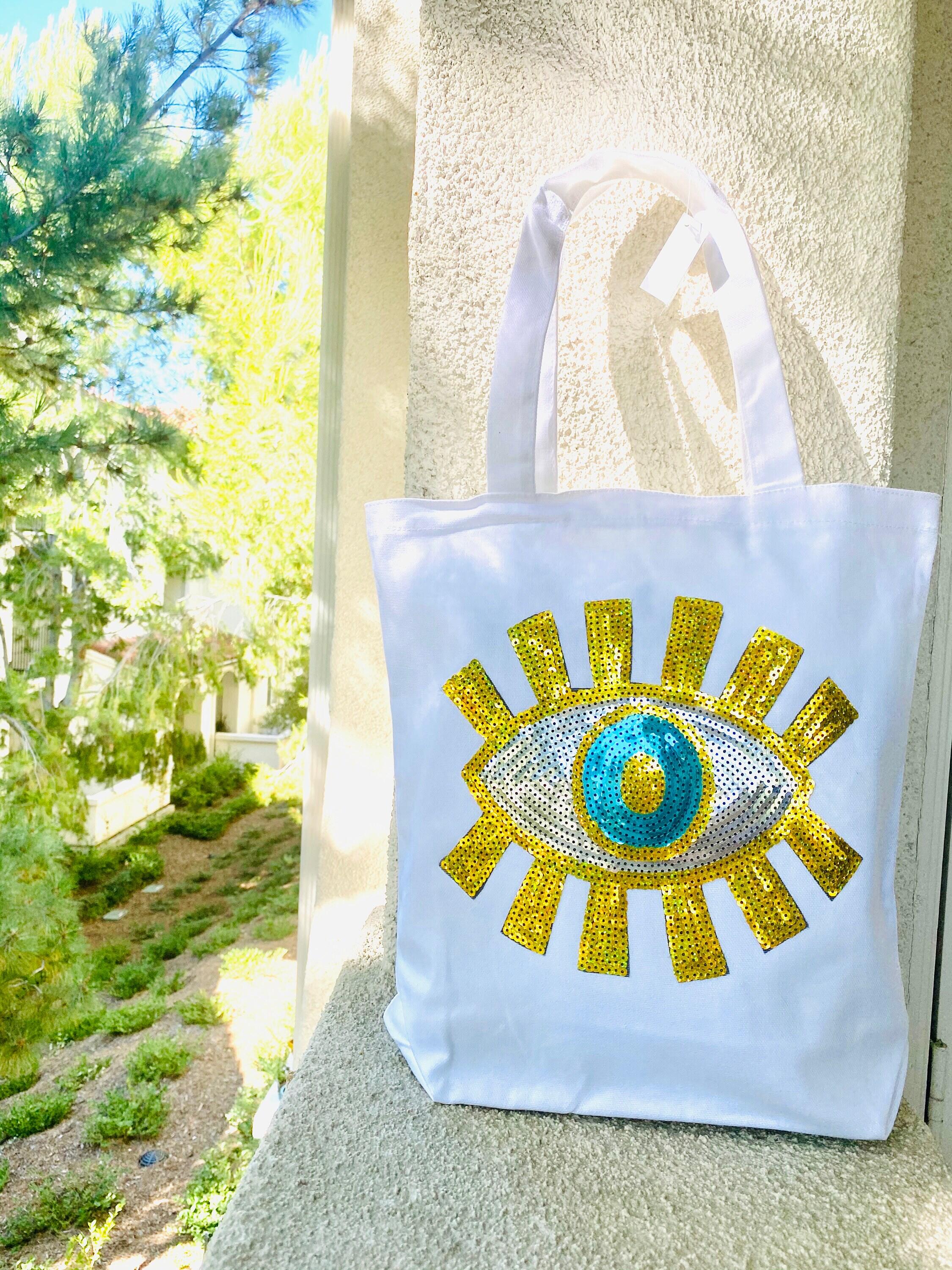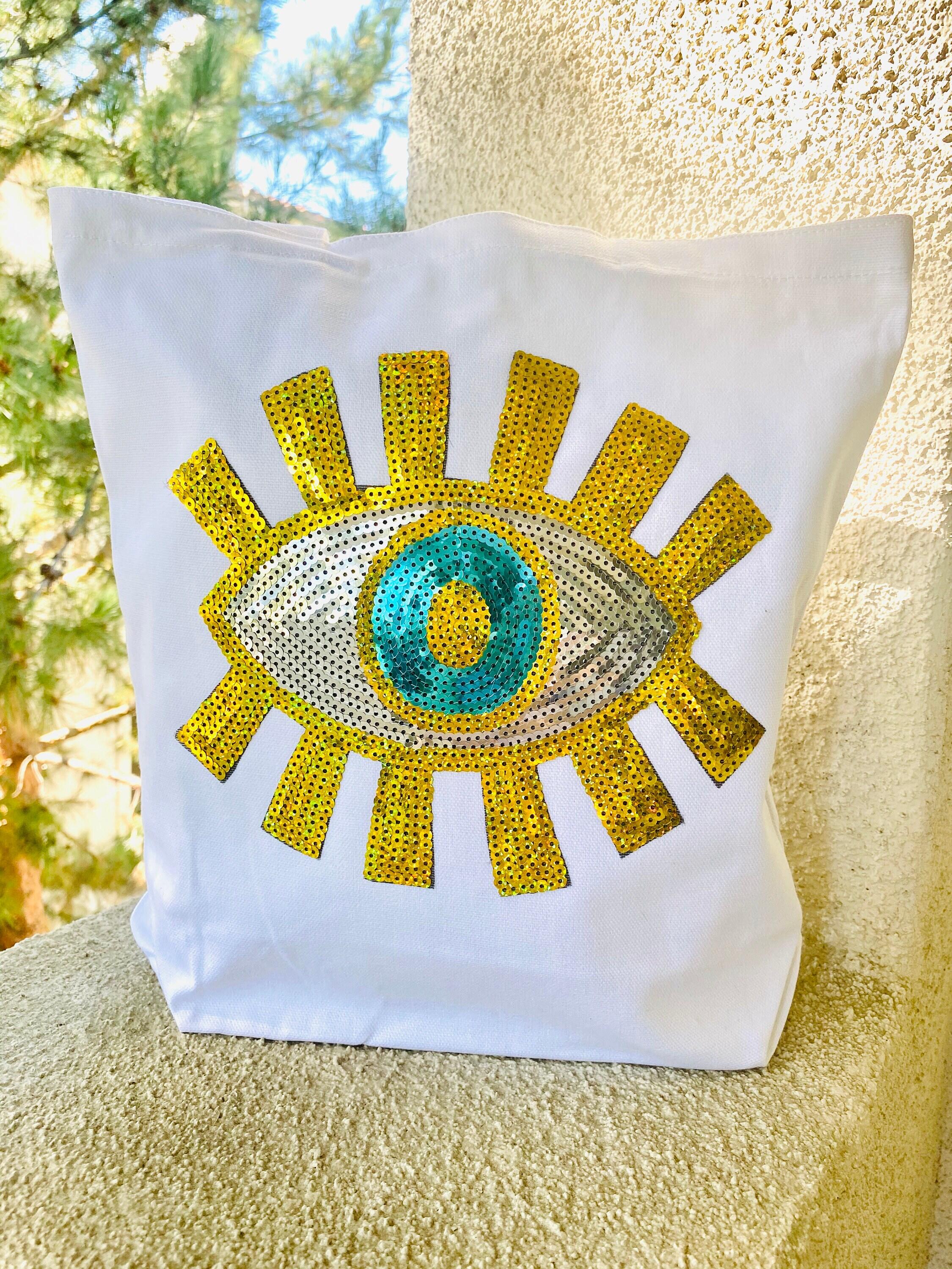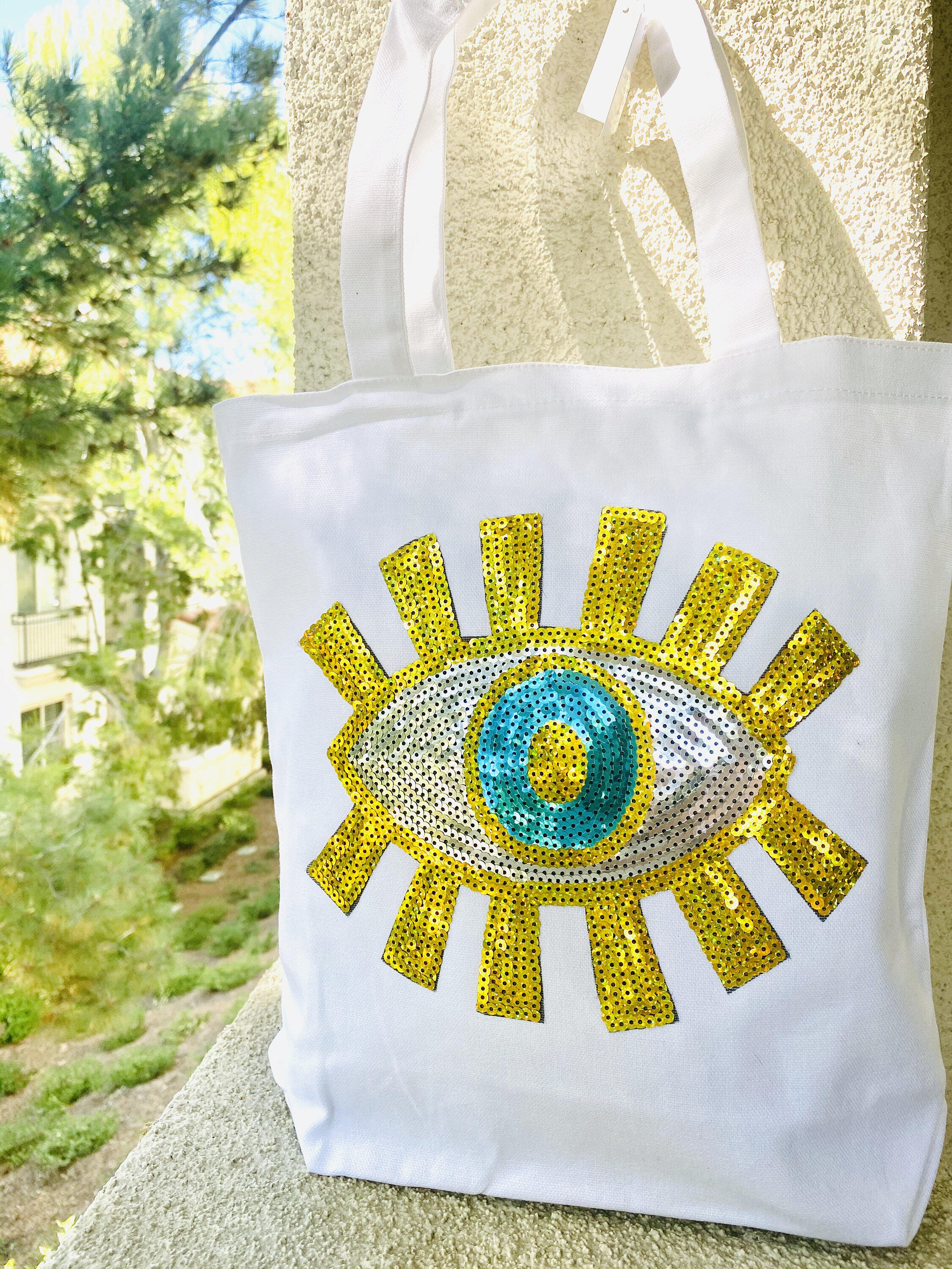 Evil eye canvas tote bags can be used also as a beach or grocery bag. These woven bags are constructed with a premium solid canvas material ad designed with two matching handles for carrying. Decorated this durable, reusable bag with high-quality sequins evil eye patch. Use as an everyday bag to set yourself part of eco-friendly life and apart from those carrying unnatural materials bags.