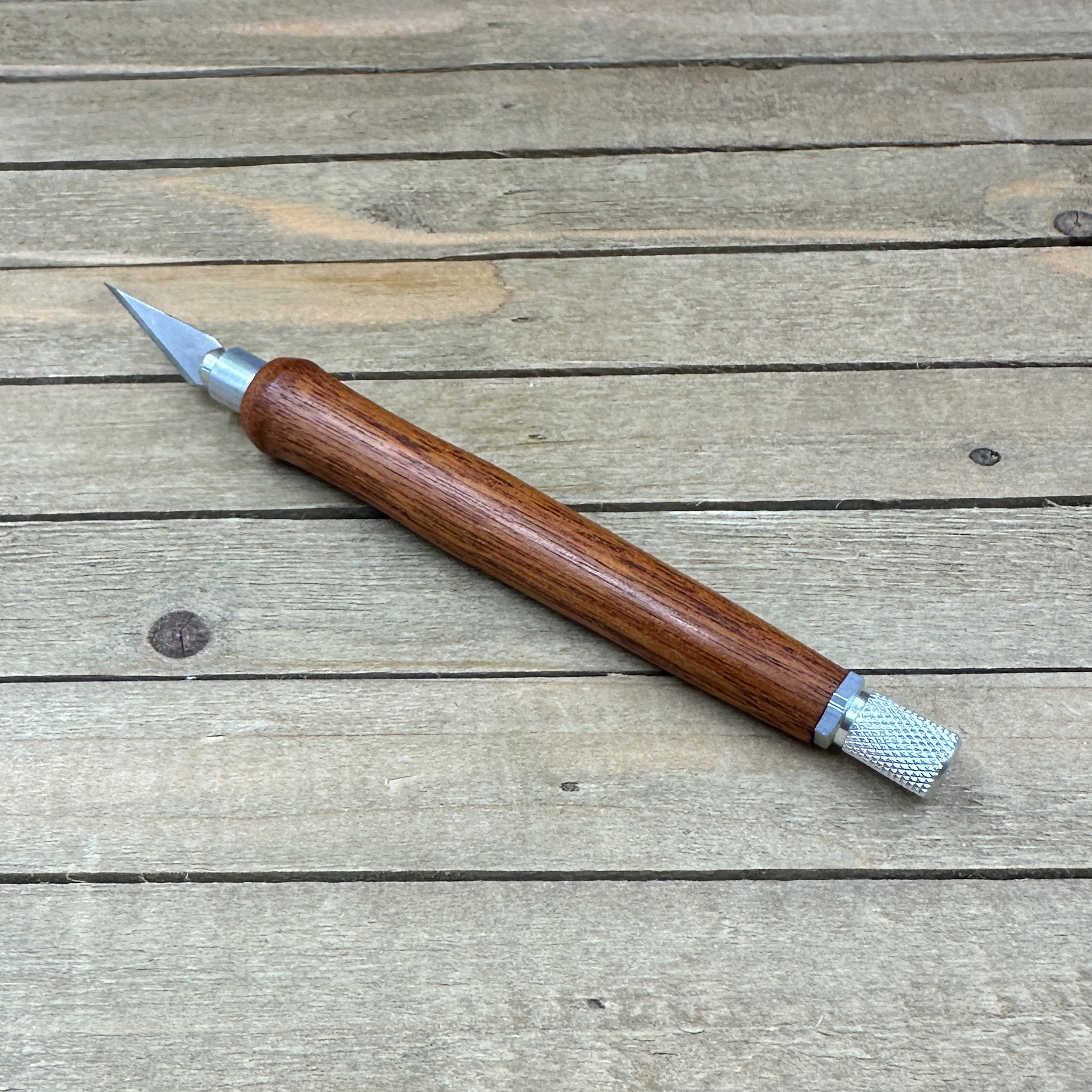 This custom handmade hobby knife, like all my other hobby knives, was personally handcrafted by me in my woodshop. These are not mass produced marking knives and each one is handcrafted by myself so you are getting a craftsman's touch and the love of their craft with each knife. Each hobby knife I craft has subtle differences making it a truly one of a kind. First, I select a piece of Sapele wood, cut it down to size to get it ready to turn on my wood lathe. Second, the newly formed blank is drilled out to fit the aluminum components and to prep it for turning. Third, it is meticulously turned down with my lathe to fit the hobby making knife components taking proper care that it transitions to the hardware perfectly. Finally, a walnut oil and wax finish is applied in multiple coats which allows you to feel the wood when you use the knife.