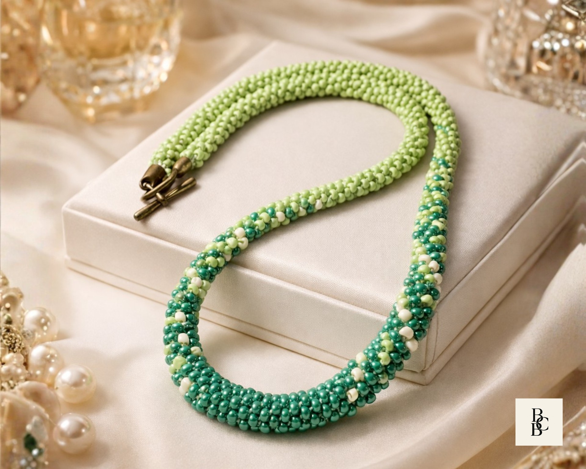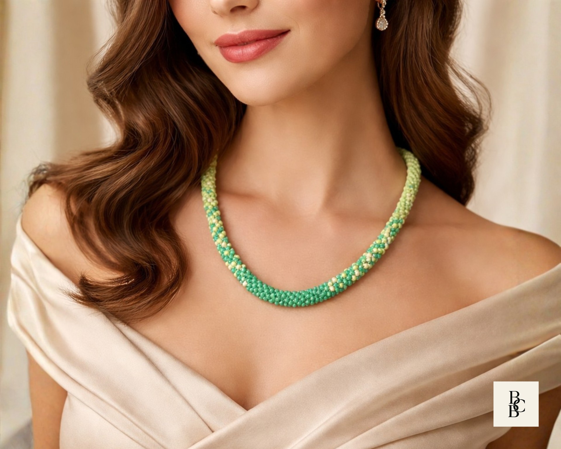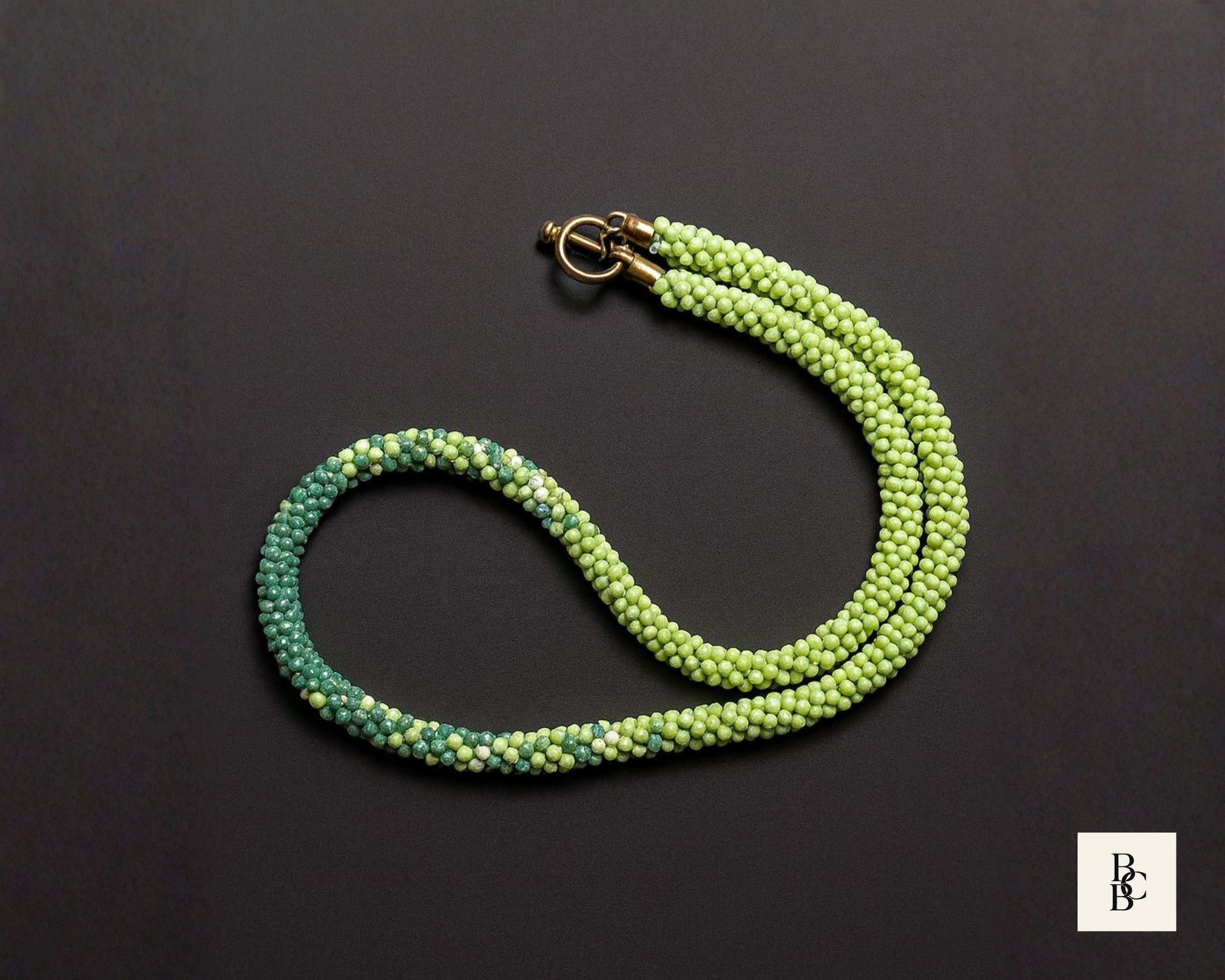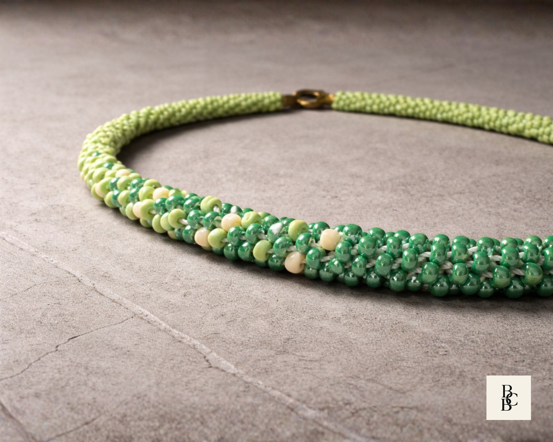 The Verdant Fade colorway transitions seamlessly from soft botanical green into deeper, richer emerald tones. The gradual color shift is intentional and organic, giving the necklace depth, movement, and a quietly luxurious presence. No two pieces are ever exactly alike — each one reflects the hands that made it.