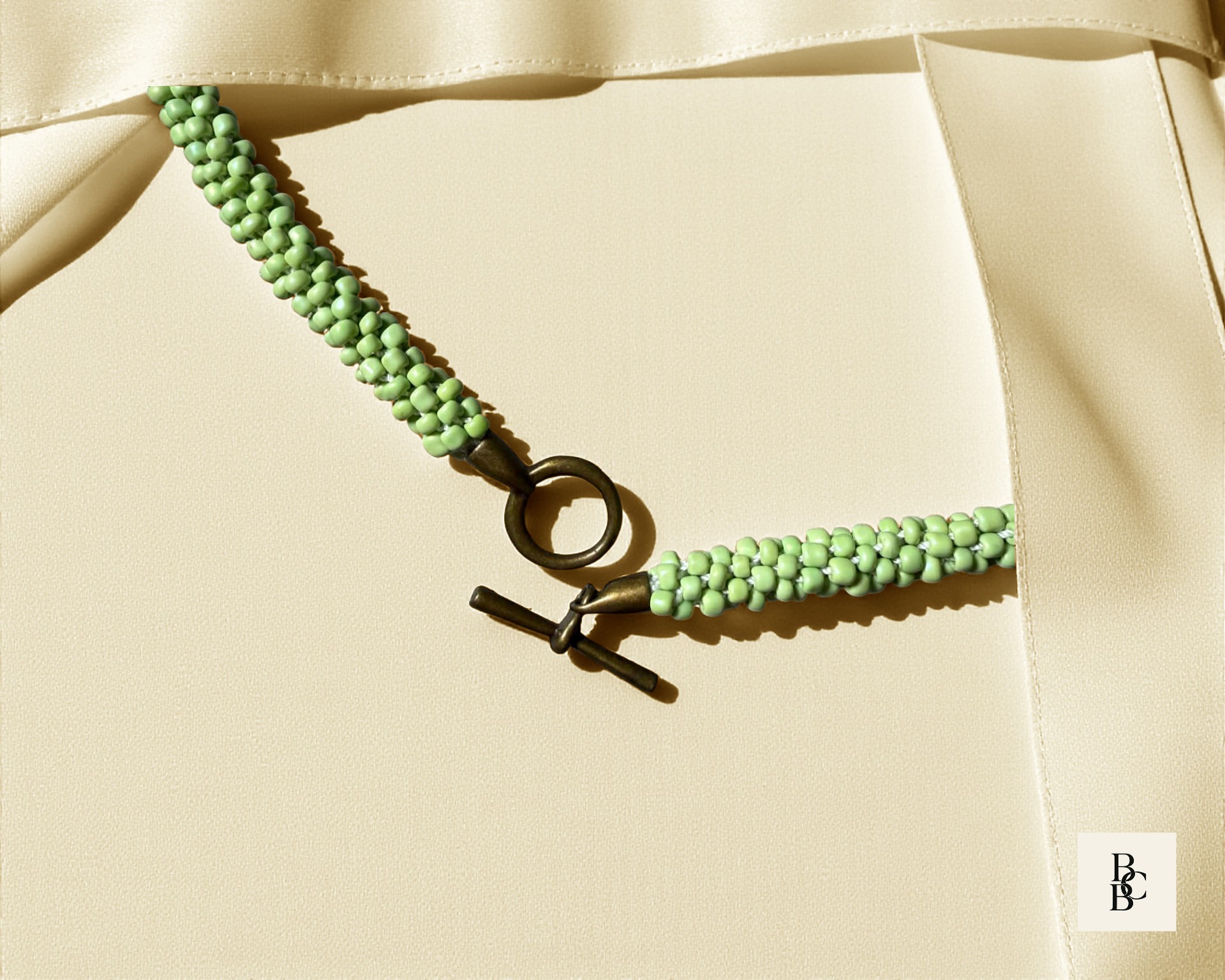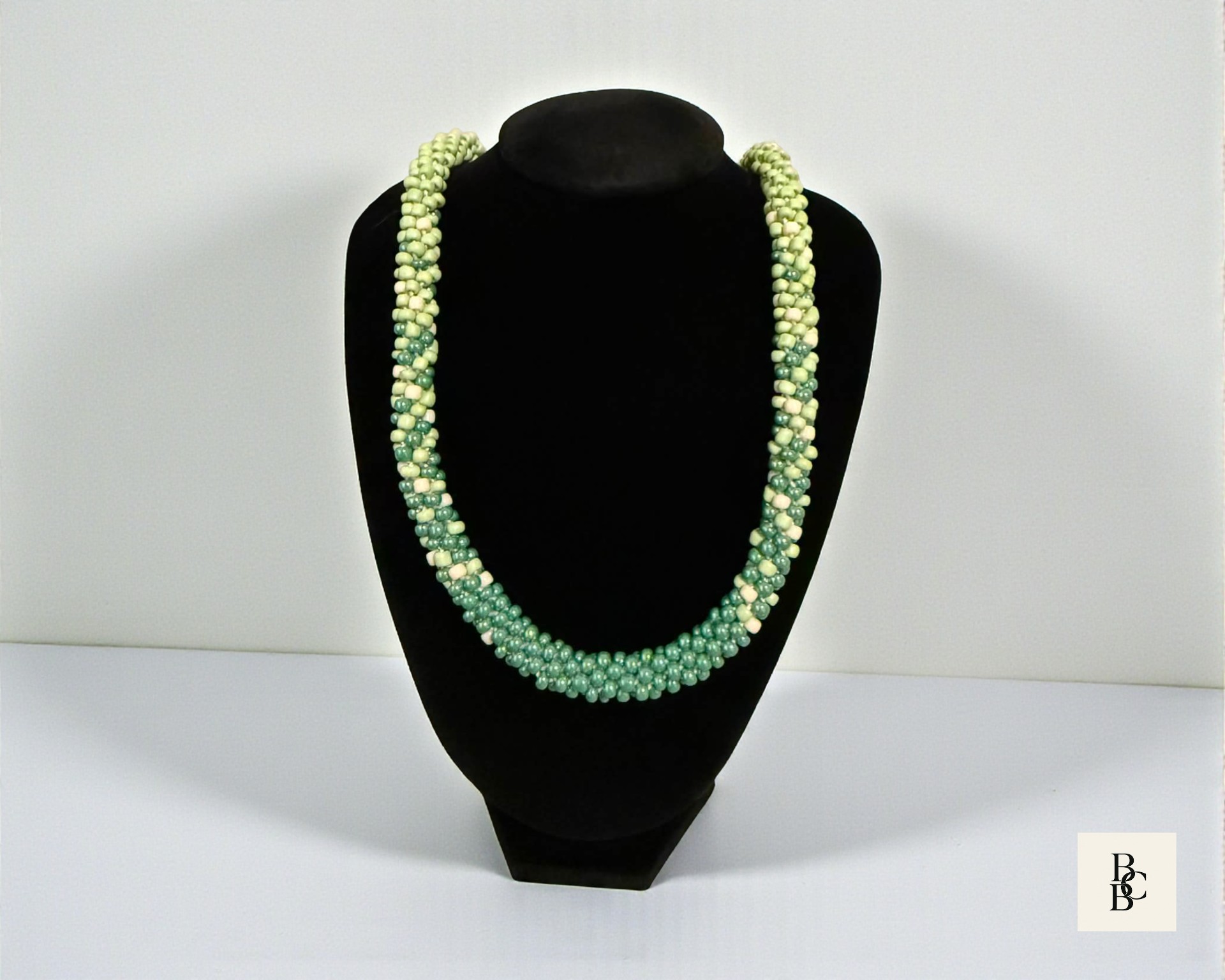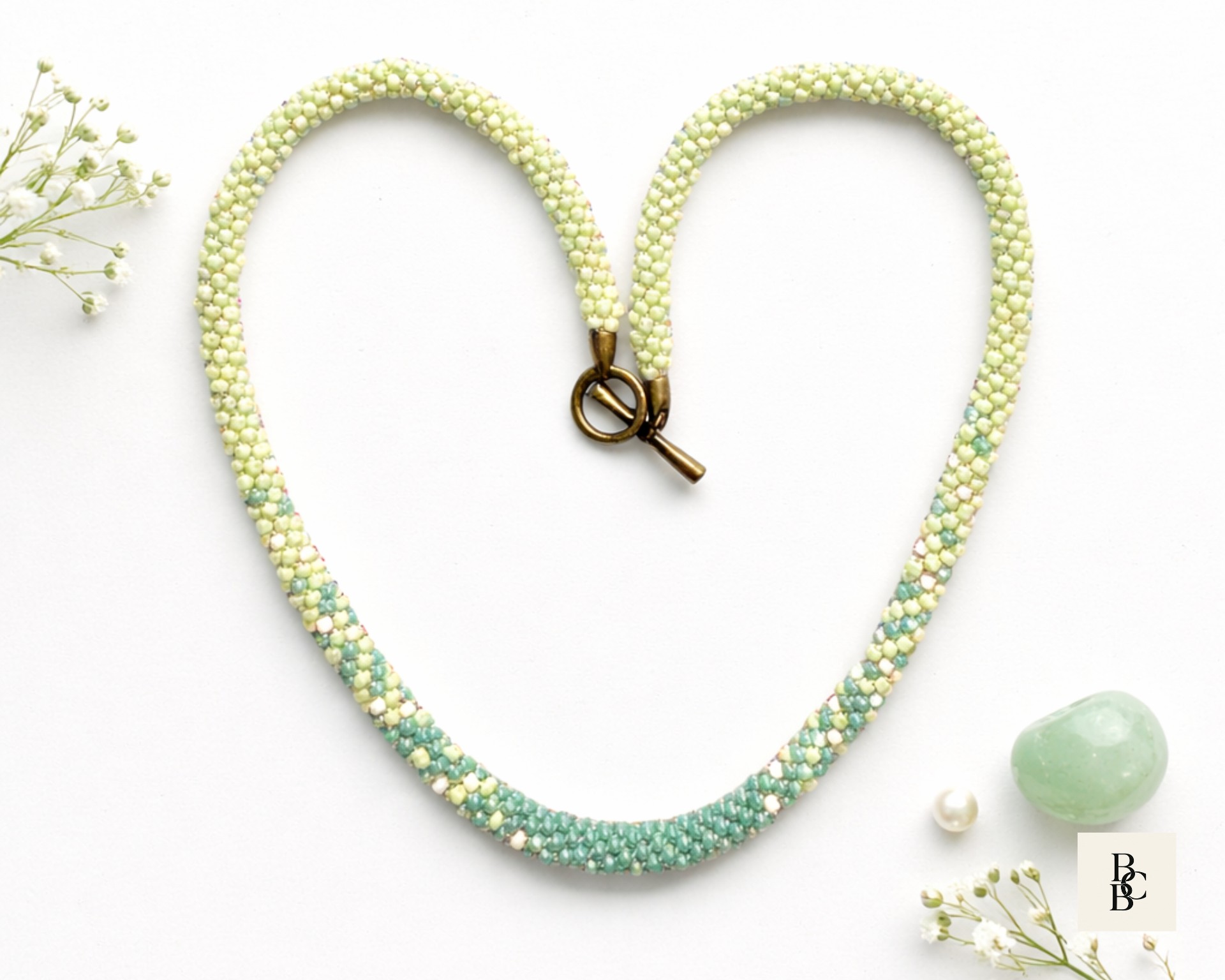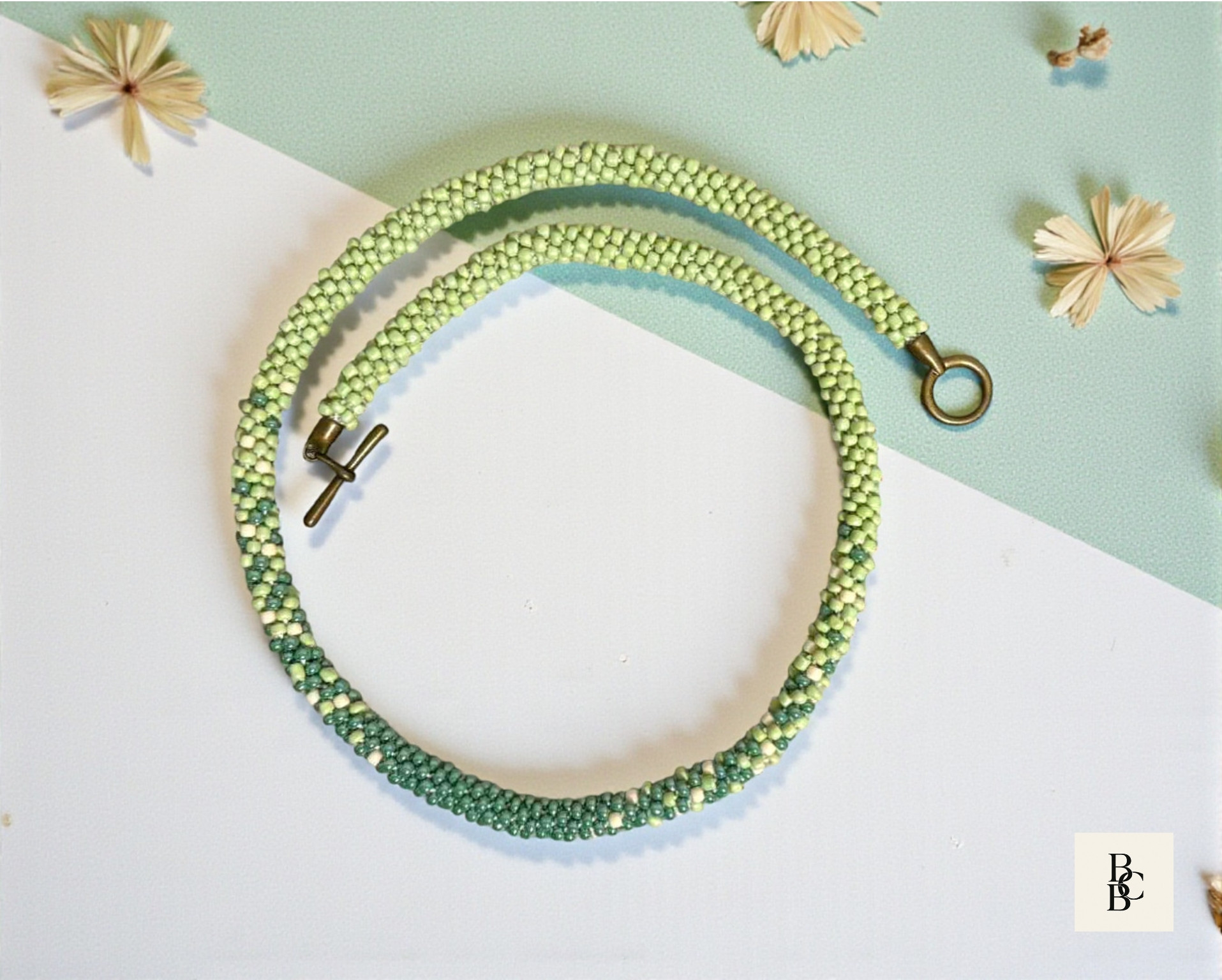 The Verdant Fade colorway transitions seamlessly from soft botanical green into deeper, richer emerald tones. The gradual color shift is intentional and organic, giving the necklace depth, movement, and a quietly luxurious presence. No two pieces are ever exactly alike — each one reflects the hands that made it.