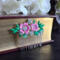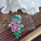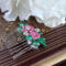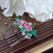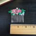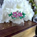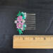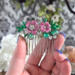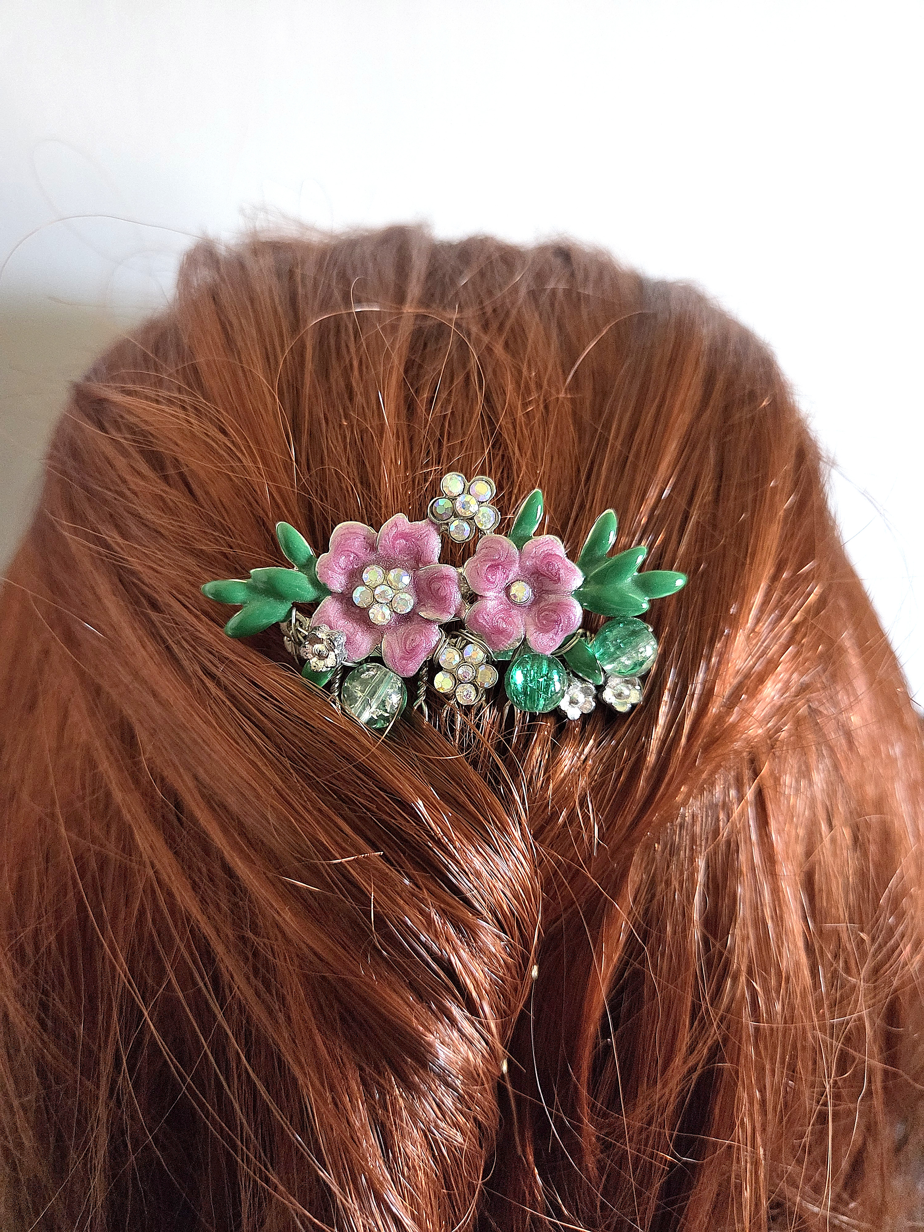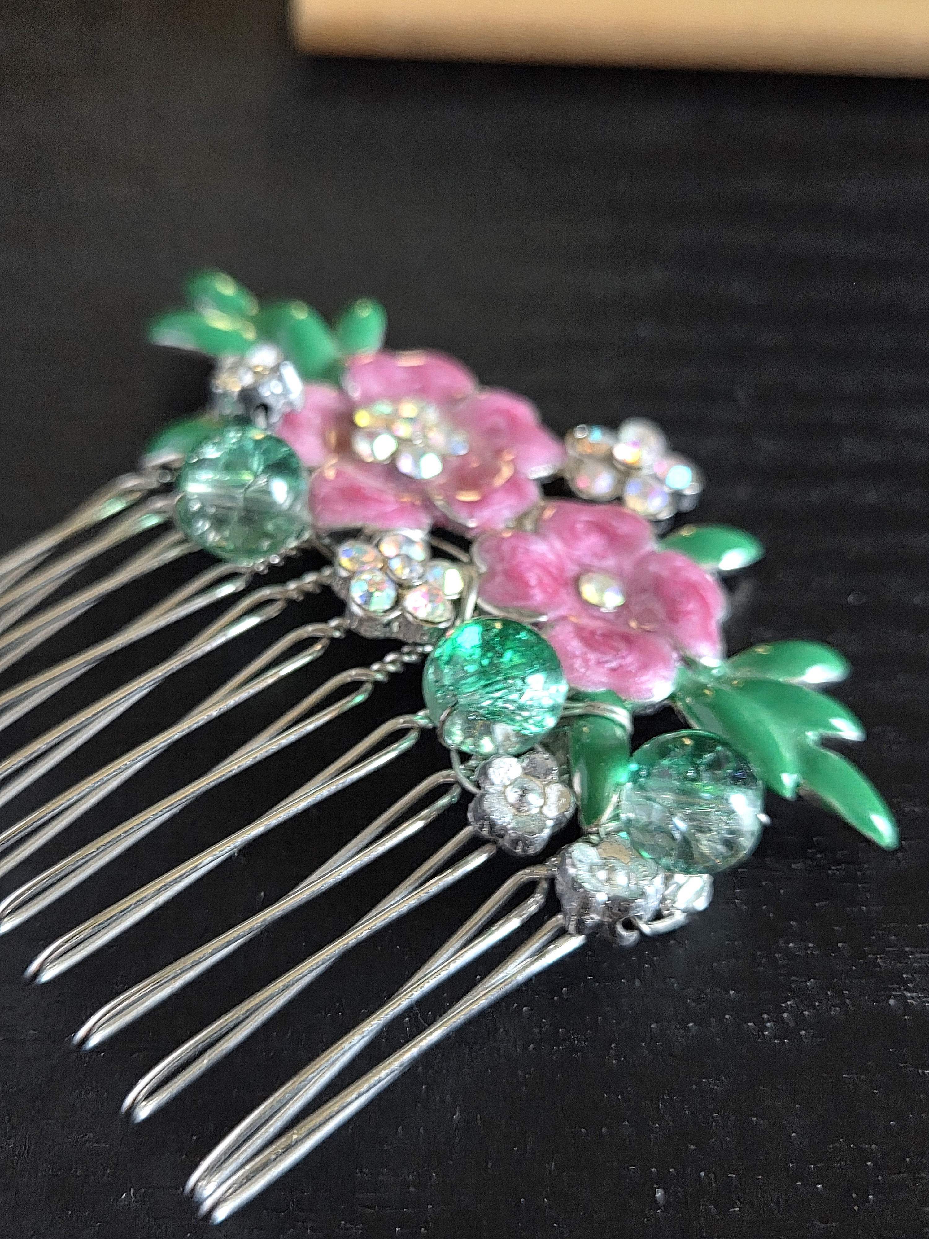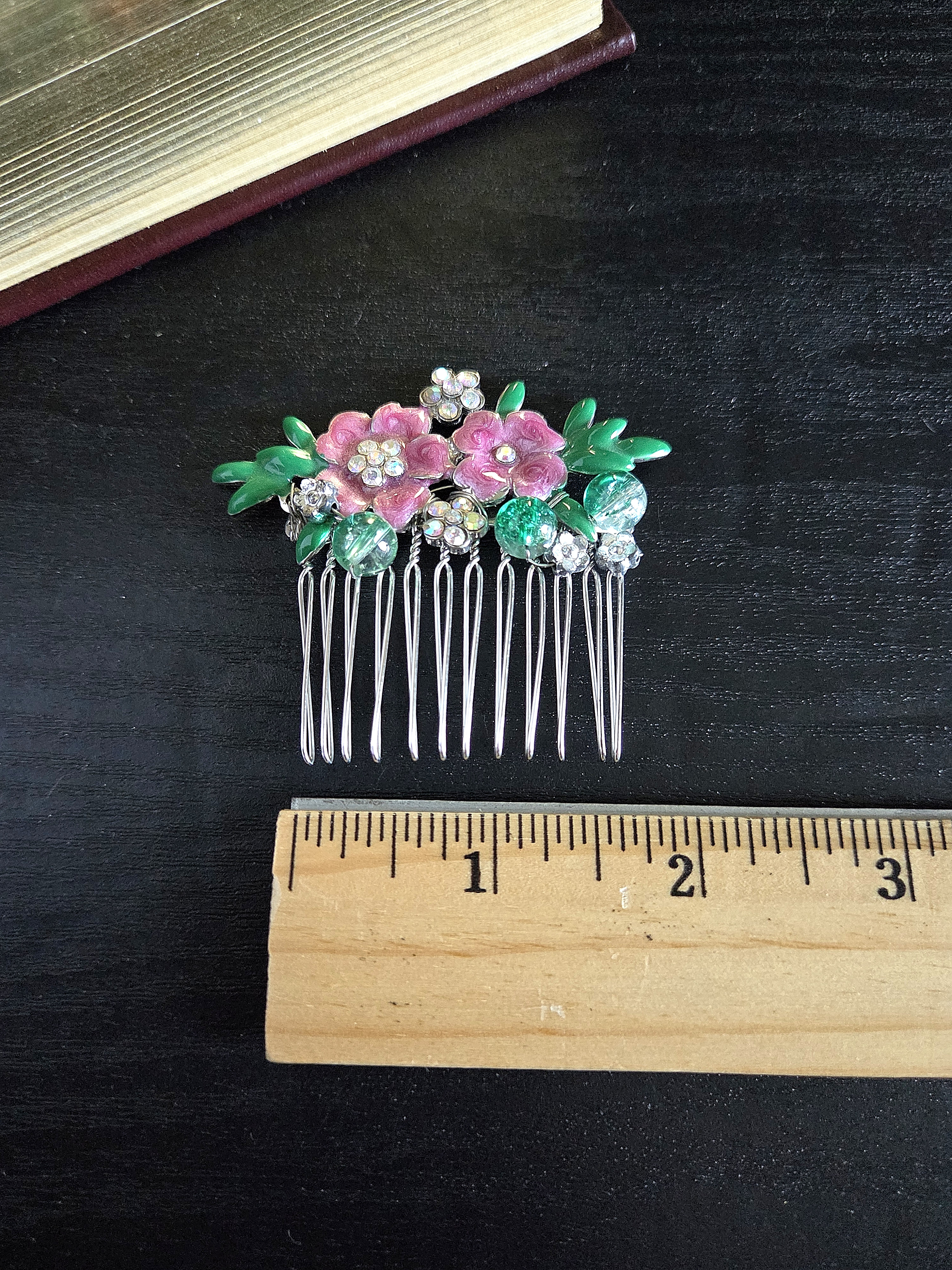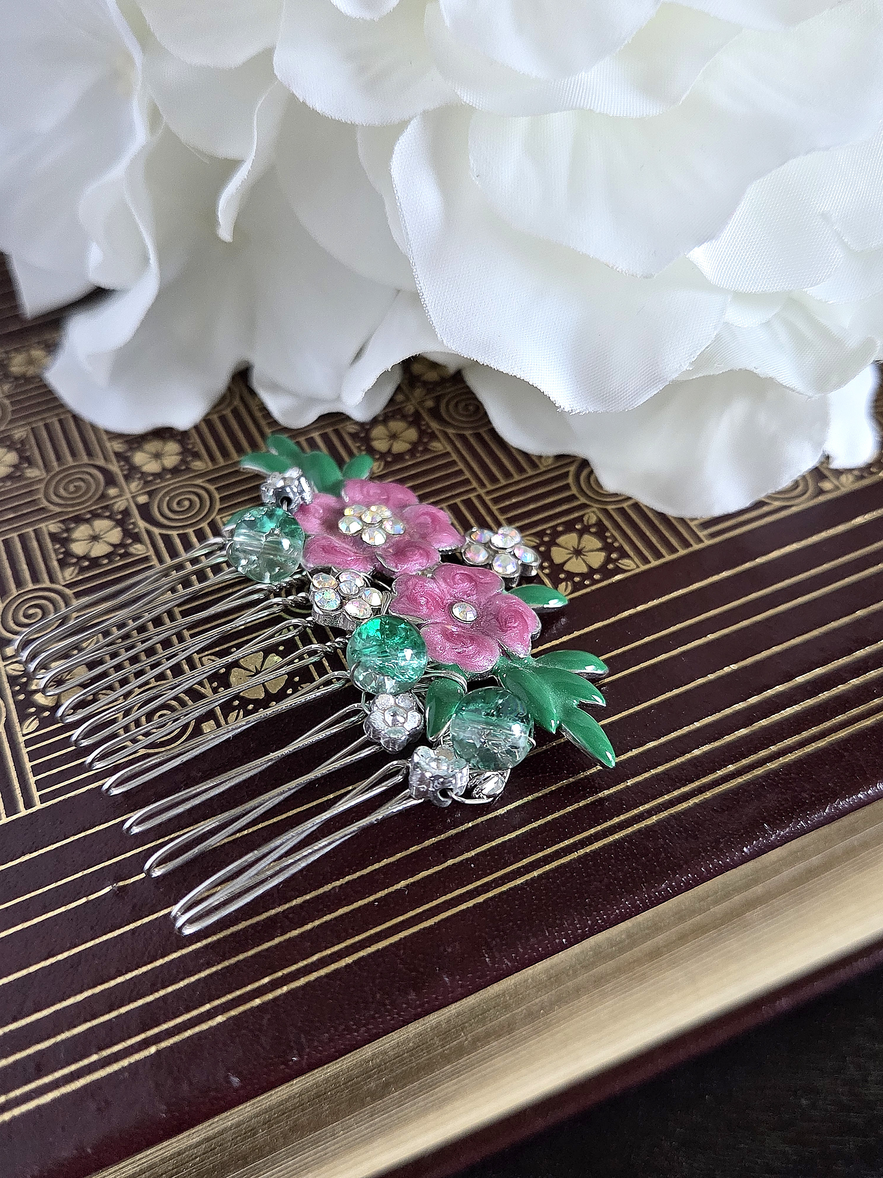 This silver hair comb is decorated with a focal piece of enameled purple flowers, green leaves, and tiny rhinestone blossoms. Wrapped by hand with crackled green glass beads and tiny metal flowers added, it creates a lush, garden-inspired design that feels both whimsical and timeless. Perfect for weddings, spring celebrations, or simply adding a vintage flourish to your everyday look, this floral hair accessory is a lovely way to bring a bit of Victorian-inspired beauty to your hairstyle.