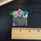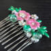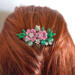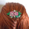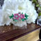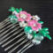 This started as a blank 2" hair comb. I attached the focal flower piece with wire, wrapping it to the edge of the comb. Then I selected the beads. I wanted them to match colors and aesthetic so I settled on the green crackle beads and some more tiny metal flower beads. I wrapped them on in a random fashion to fill holes and also to accentuate the colors and patterns already on the focal piece.