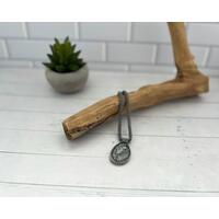 Made with aluminum jump rings, pewter pendant and stainless steel lobster claw clasp