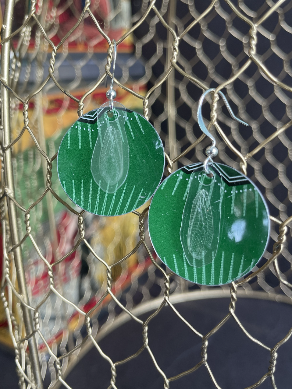 These green and brown earrings are simple and earthy. The concave tin leave space for the laminated (real! sourced from an insect who had already lived its full life) 'fairy wings' to flutter in the wind. The earrings are silver plated with no nickel, and have rubber stoppers on the back so they won't fall out of your ears.