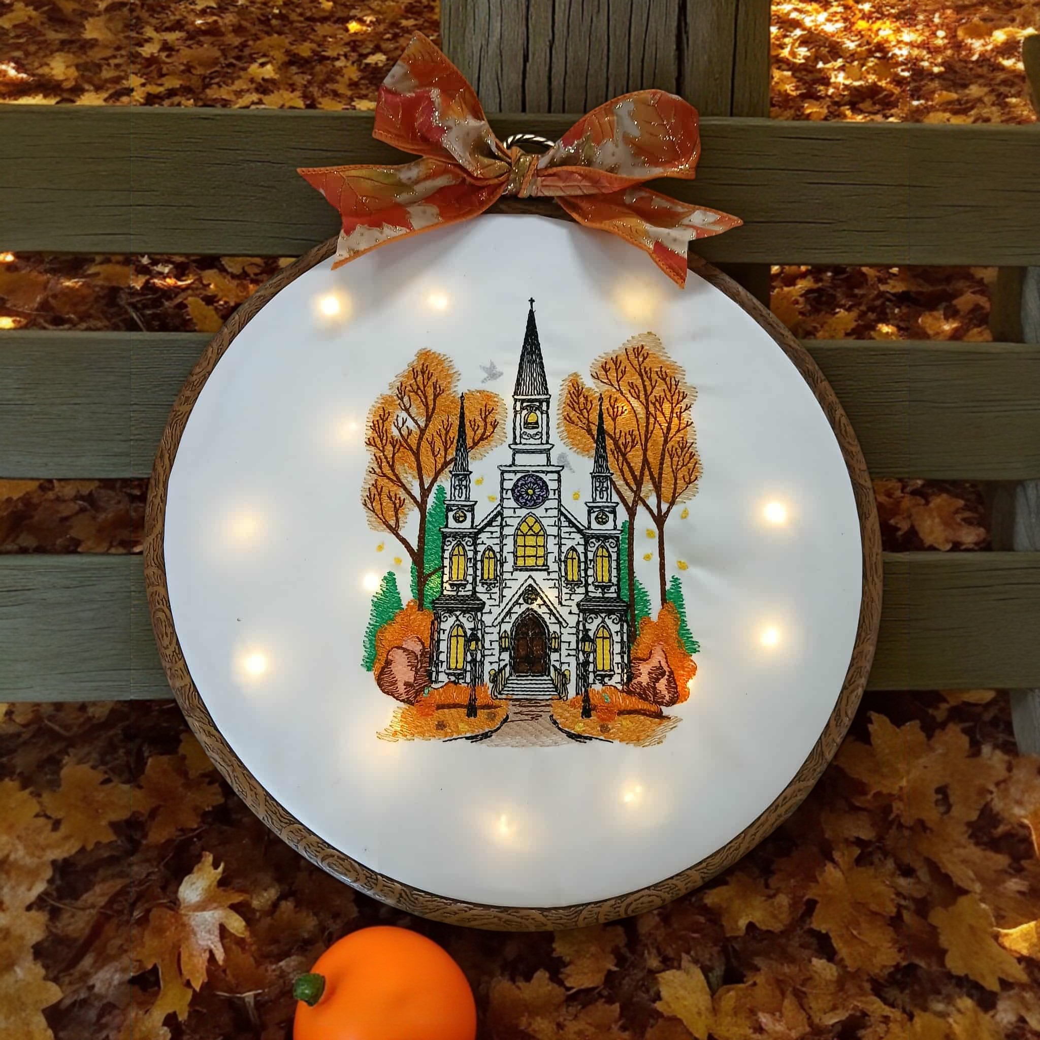 This is a cute 10 inch wooden hoop that I embroidered a Church with Fall colors. on satin fabric. Has Leaf design Bow trim on top. Applied lights on the back that come thru on the front. Make a great Fall Decor.
