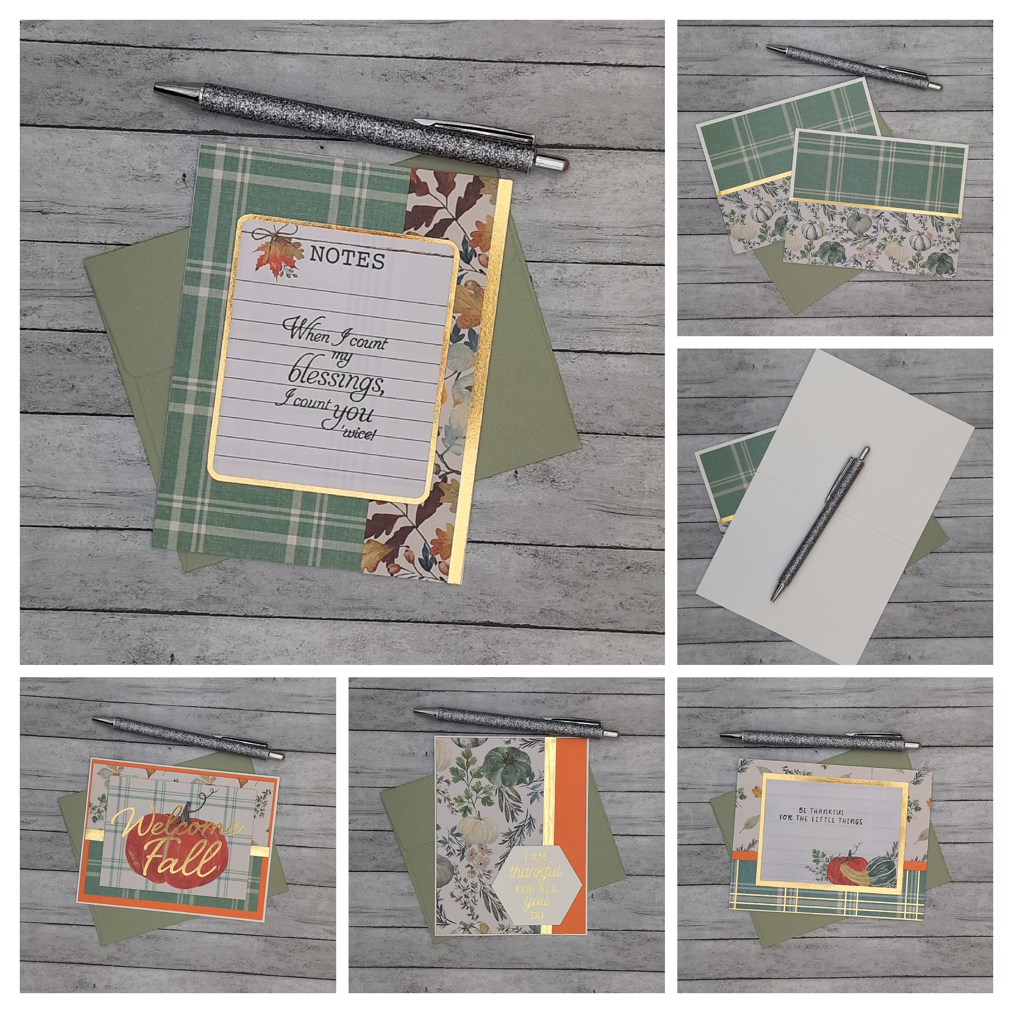 Celebrate the season with this handcrafted fall greeting card set, featuring six autumn-inspired designs. From cozy plaid backgrounds to layered pumpkins, florals, and heartfelt sentiments like “Welcome Fall” and “Be Thankful for the Little Things,” each card blends rustic charm with artisan detail. Two designs are repeated, while four offer unique layouts and color palettes. All cards are blank inside, ready for your personal message. Ideal for seasonal notes, thank-you cards, or thoughtful gestures to friends, family, or coworkers. A versatile set for autumn correspondence, bundled with coordinating envelopes.