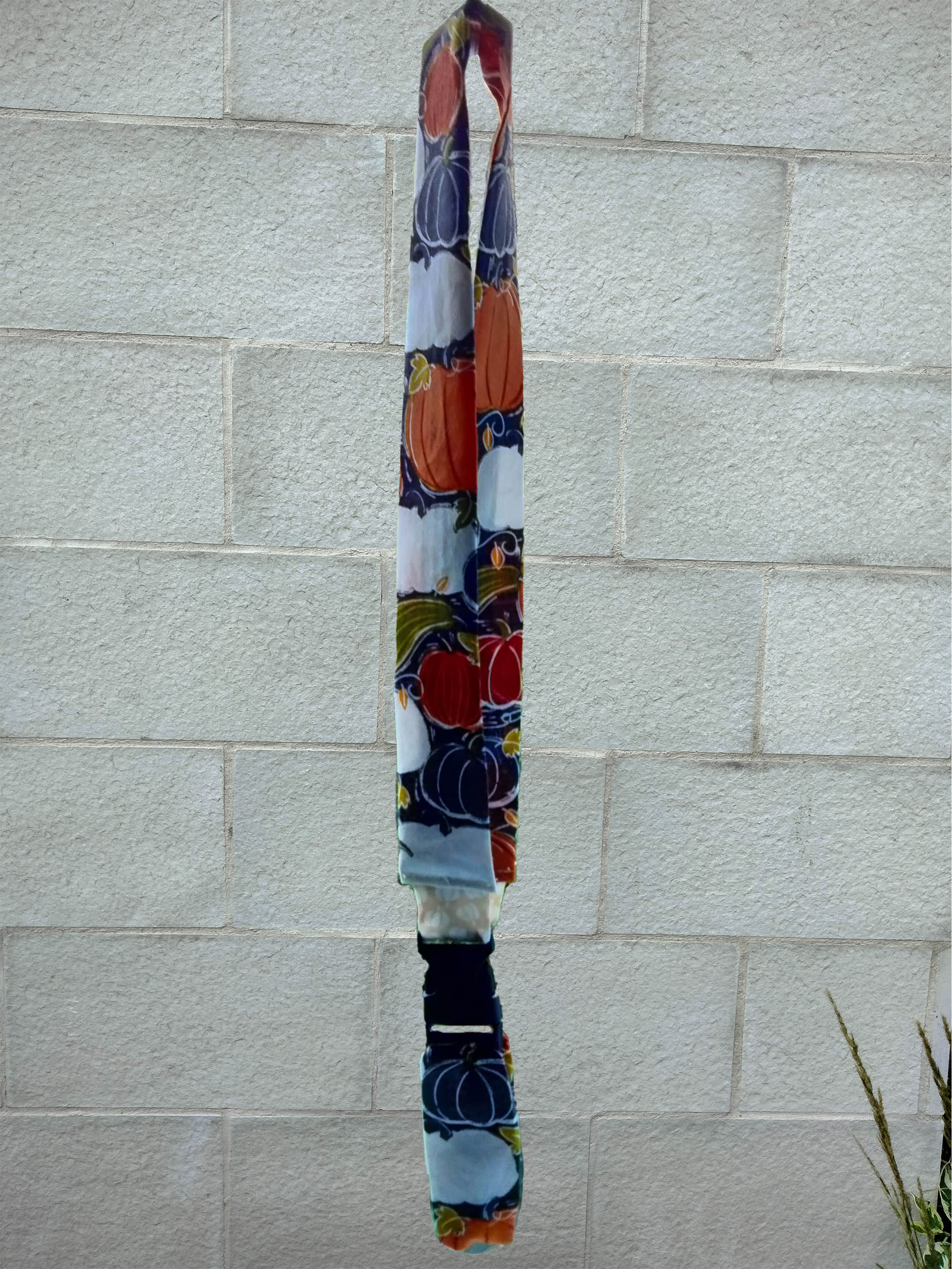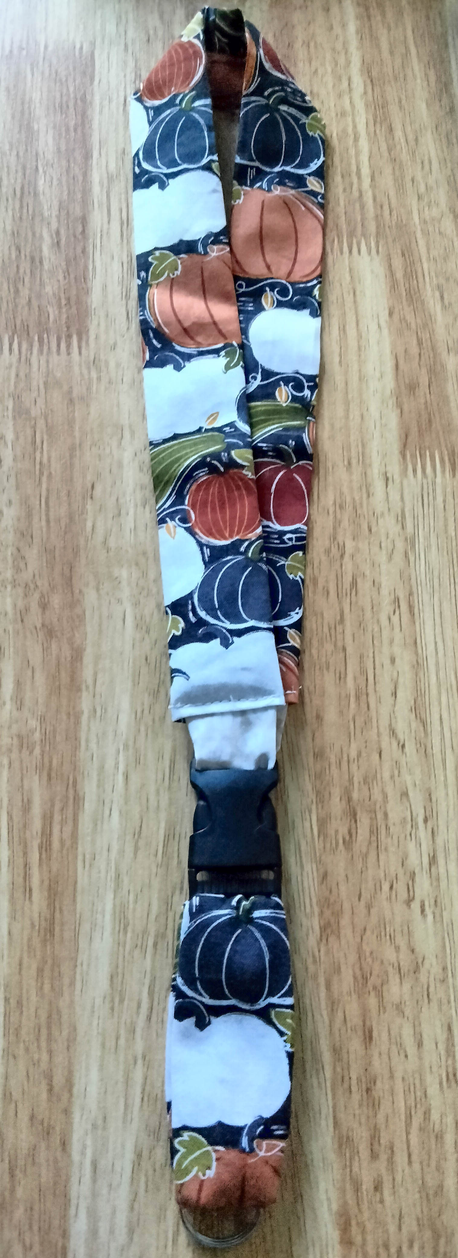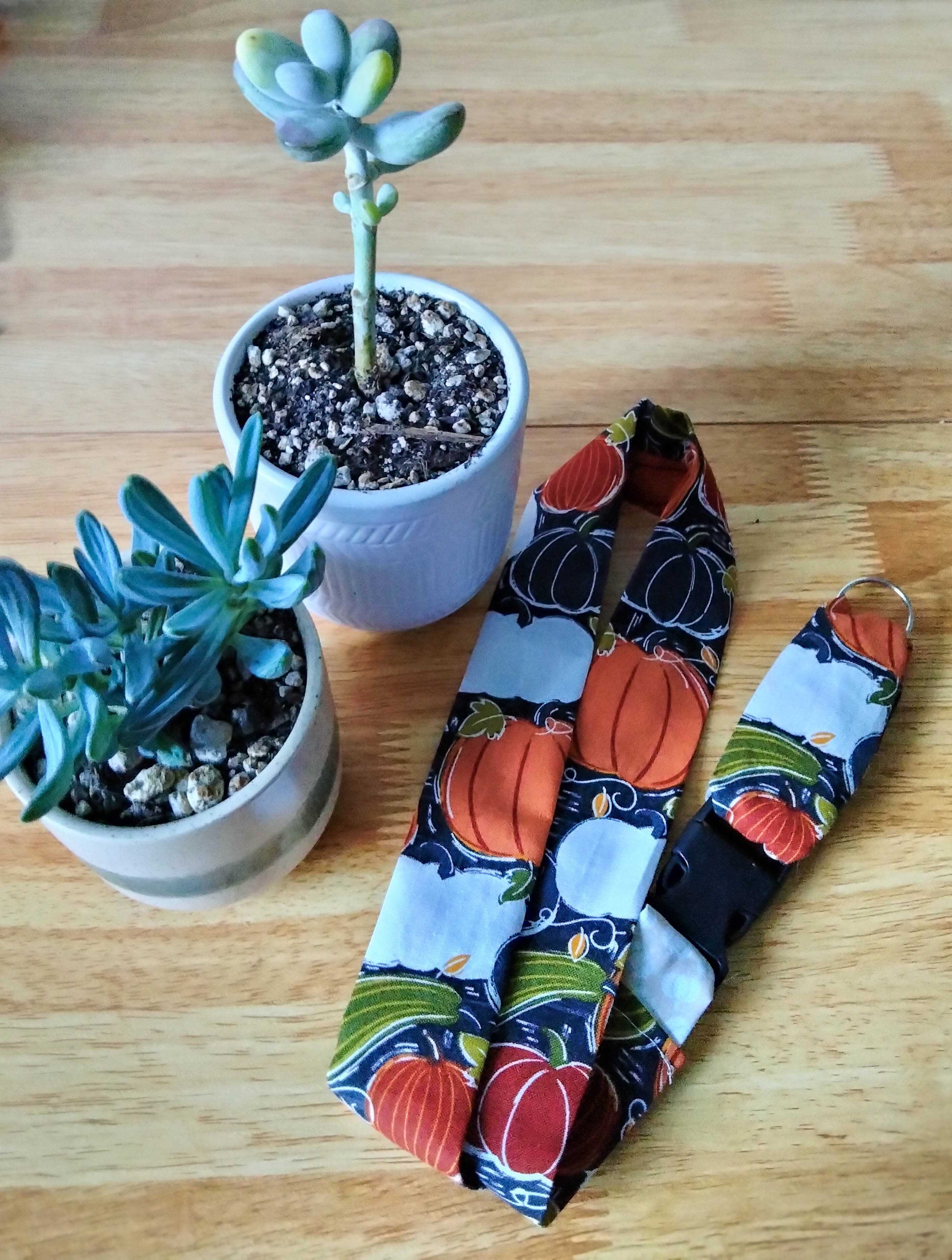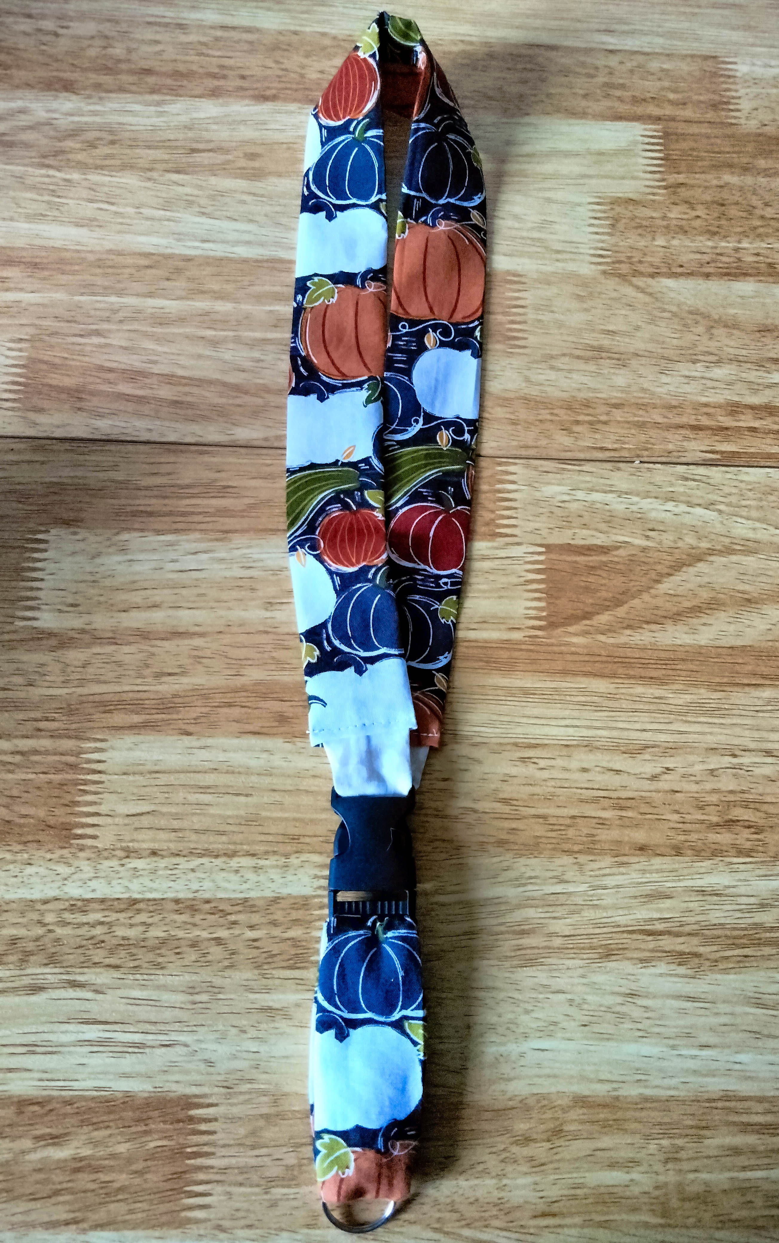 Oranges, greens, reds, and whites. This one's got fall vibes with pumpkins and gourds on a navy background. My lanyards are made with comfort in mind. Each one comes with a clip, so you can easily use the bottom separately. It also comes with a split keyring to add keys, keychains, etc. The top has a U-shape to fit nicely on your neck. This design uses cotton fabric which is comfortable and durable. Length is 19 inches, width 1.5 inches. The bottom piece is 3.75 in. long, with about a 8 in. circumference. Removing the bottom is great for temporary use without having to take off your lanyard. That also makes it short enough your lanyard won't bump into your leg when driving. Functional and adorable, I put my heart into my products and hope they make you smile!