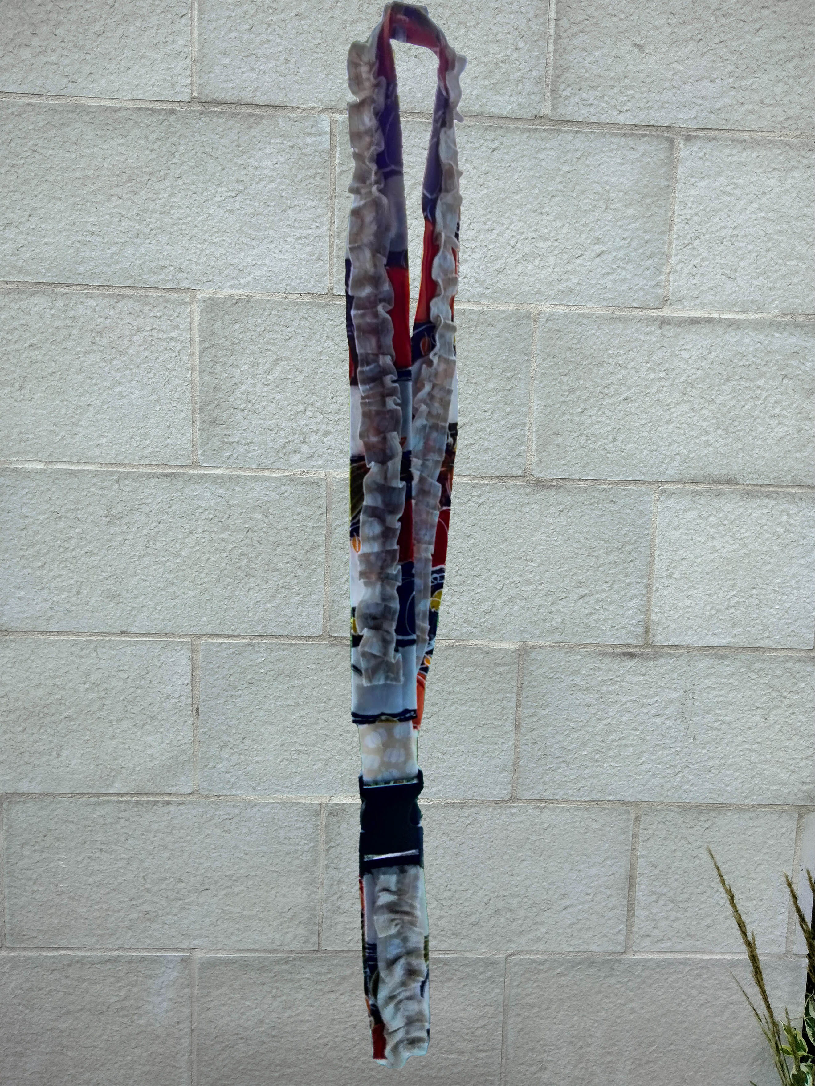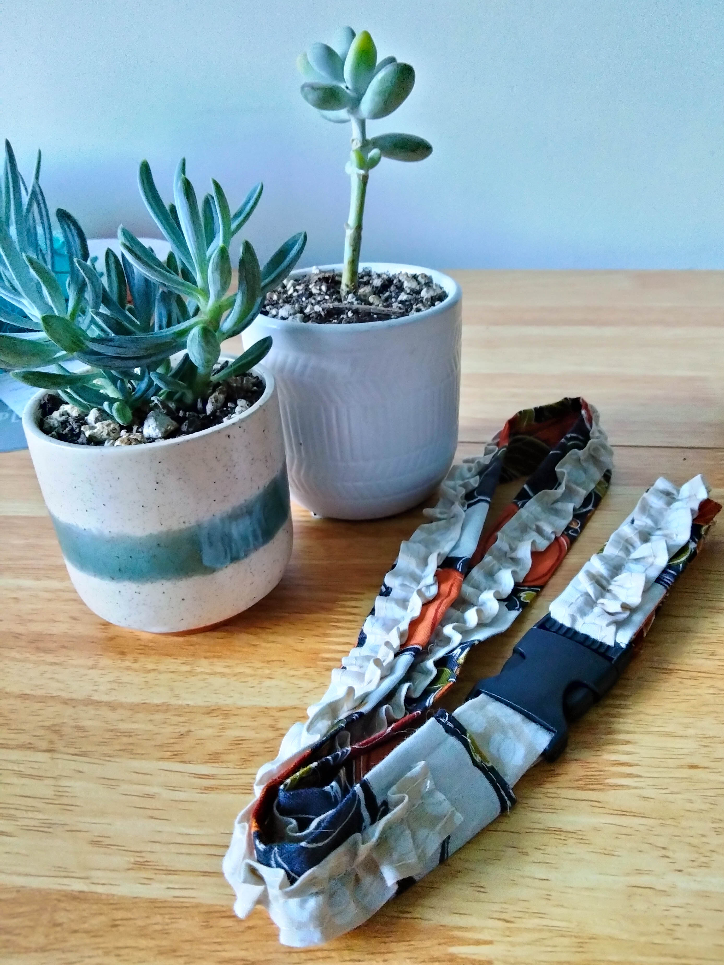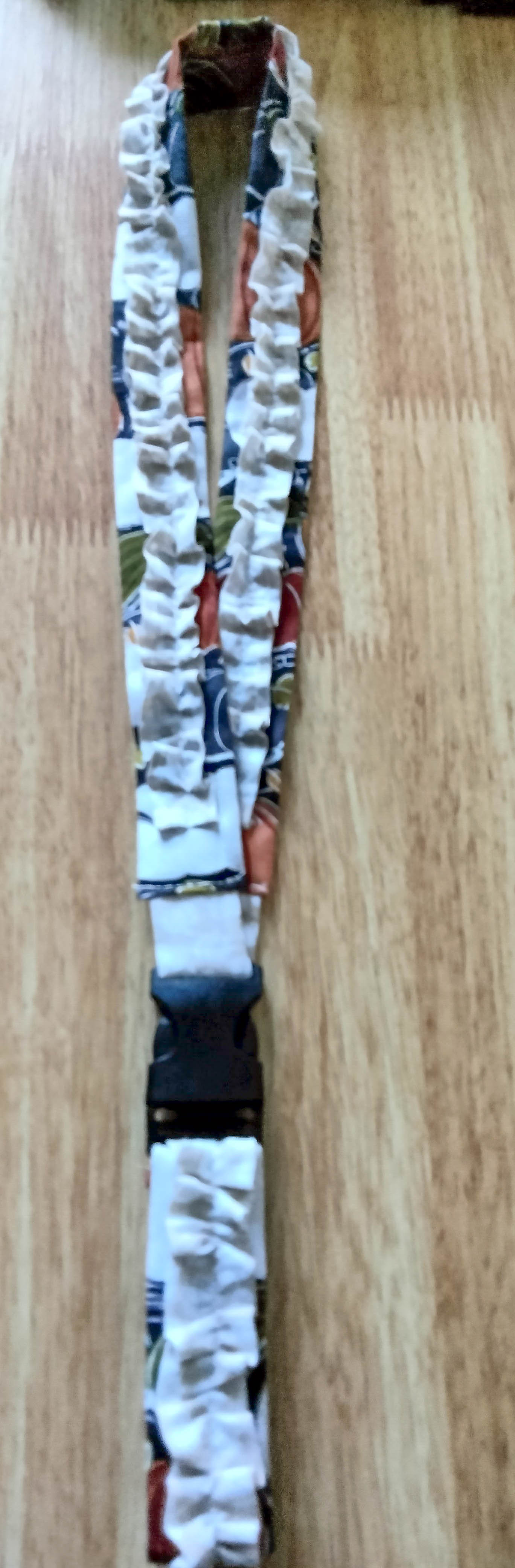 I am in every part of the process, from carefully choosing the fabric to sewing each piece myself. Every piece is cut out by hand. Sewn on a sewing machine. Carefully flipped inside out, then the clip and keyring are added. The shape makes sure it lays flat against your neck. For the ruffle I sew along the fabric and pull the strings to scrunch it by hand. Then attach it to the lanyard. Hope you love it!