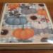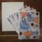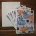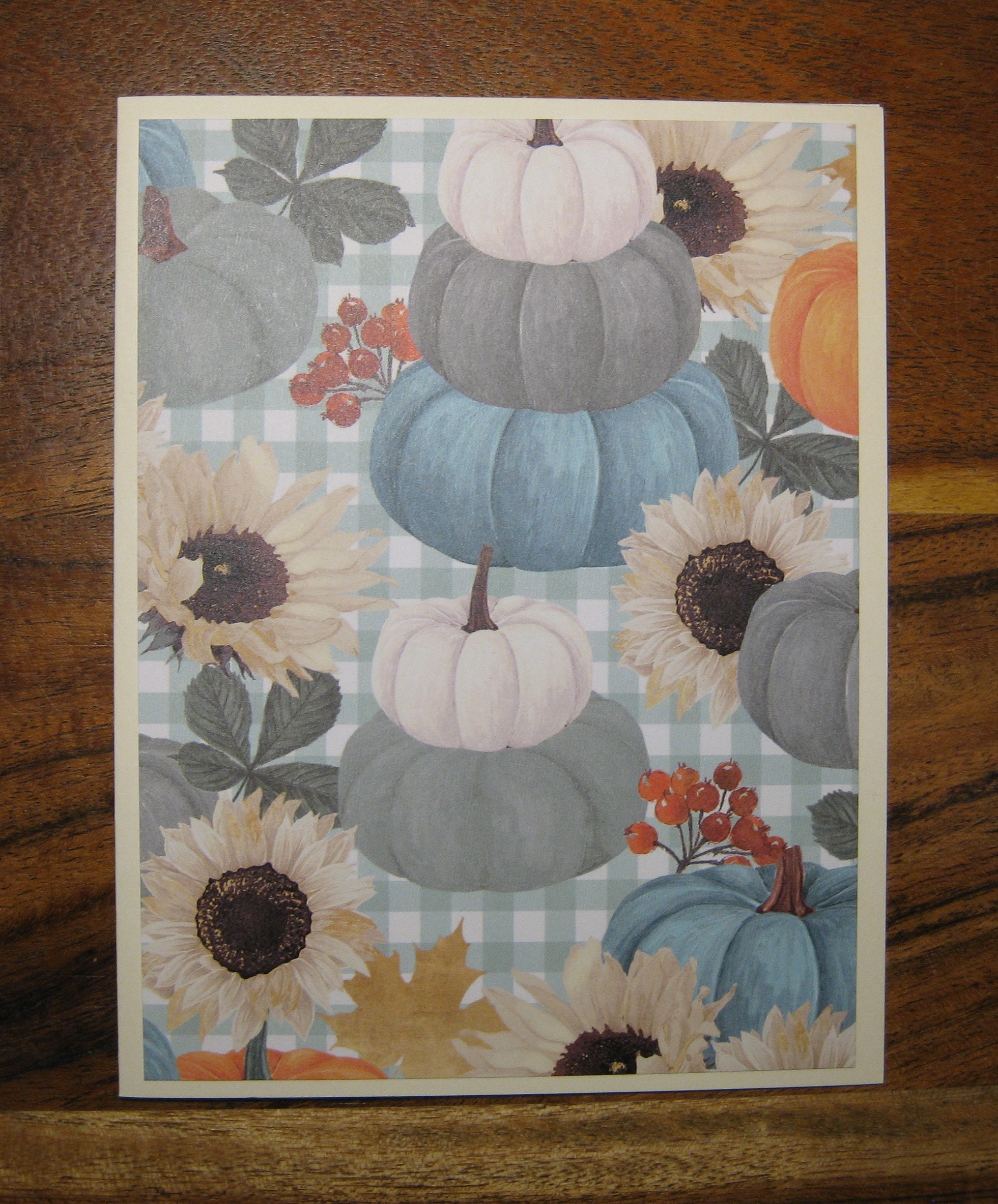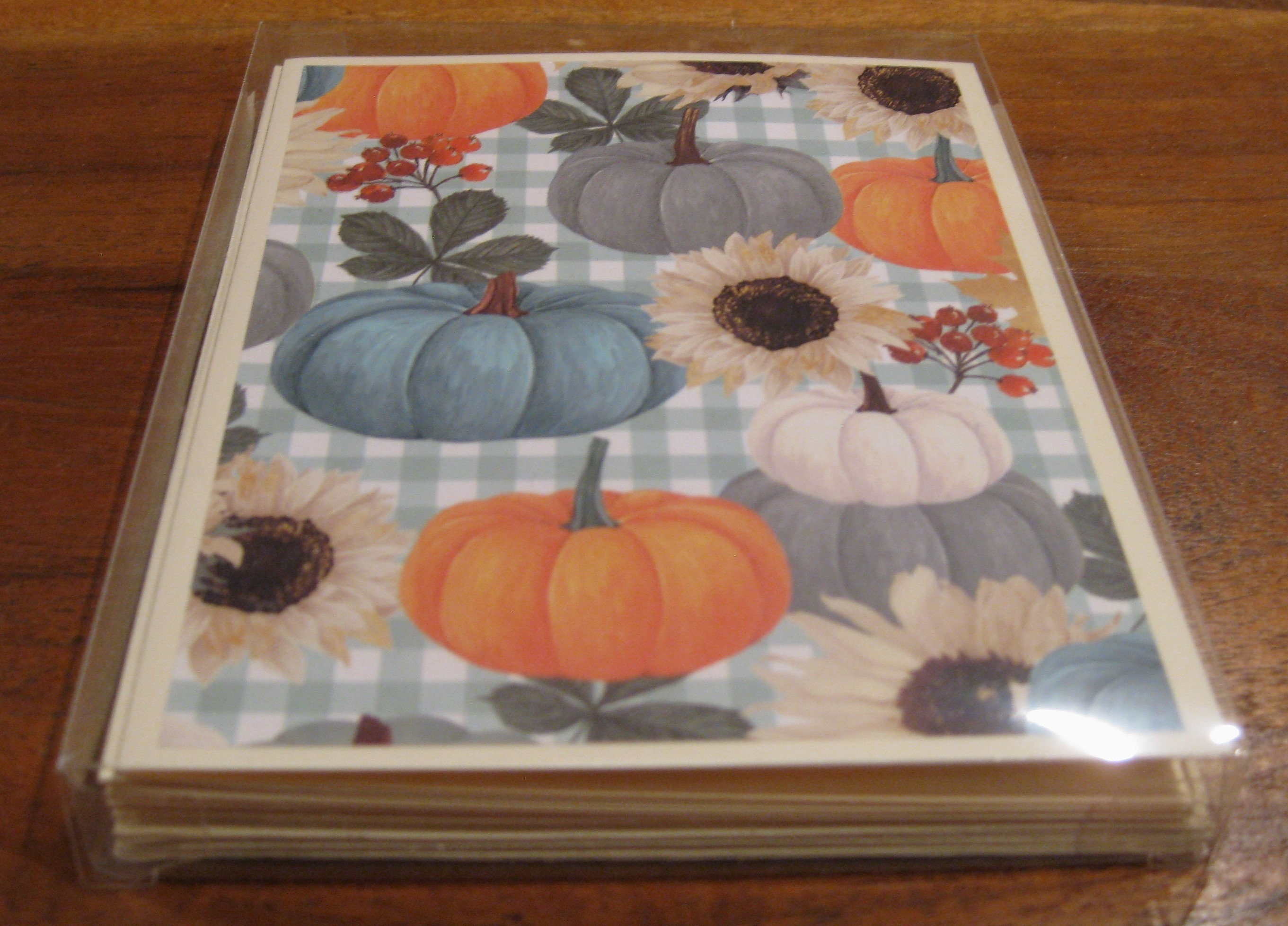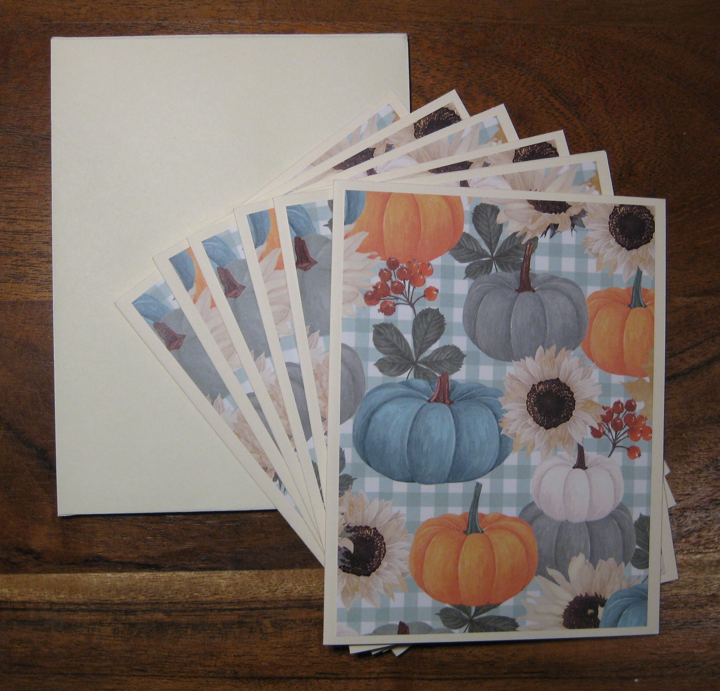 6 Fall notecards on ivory cardstock with 6 ivory envelopes. Details: Light teal gingham background filled with pumpkins, sunflowers, and berry sprigs mounted on ivory cardstock.