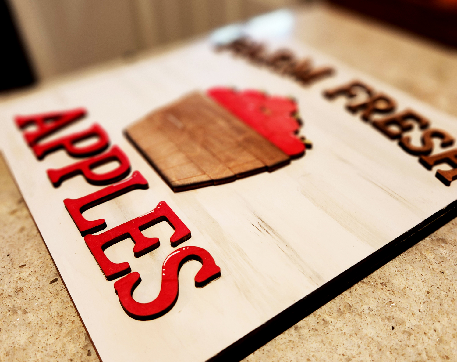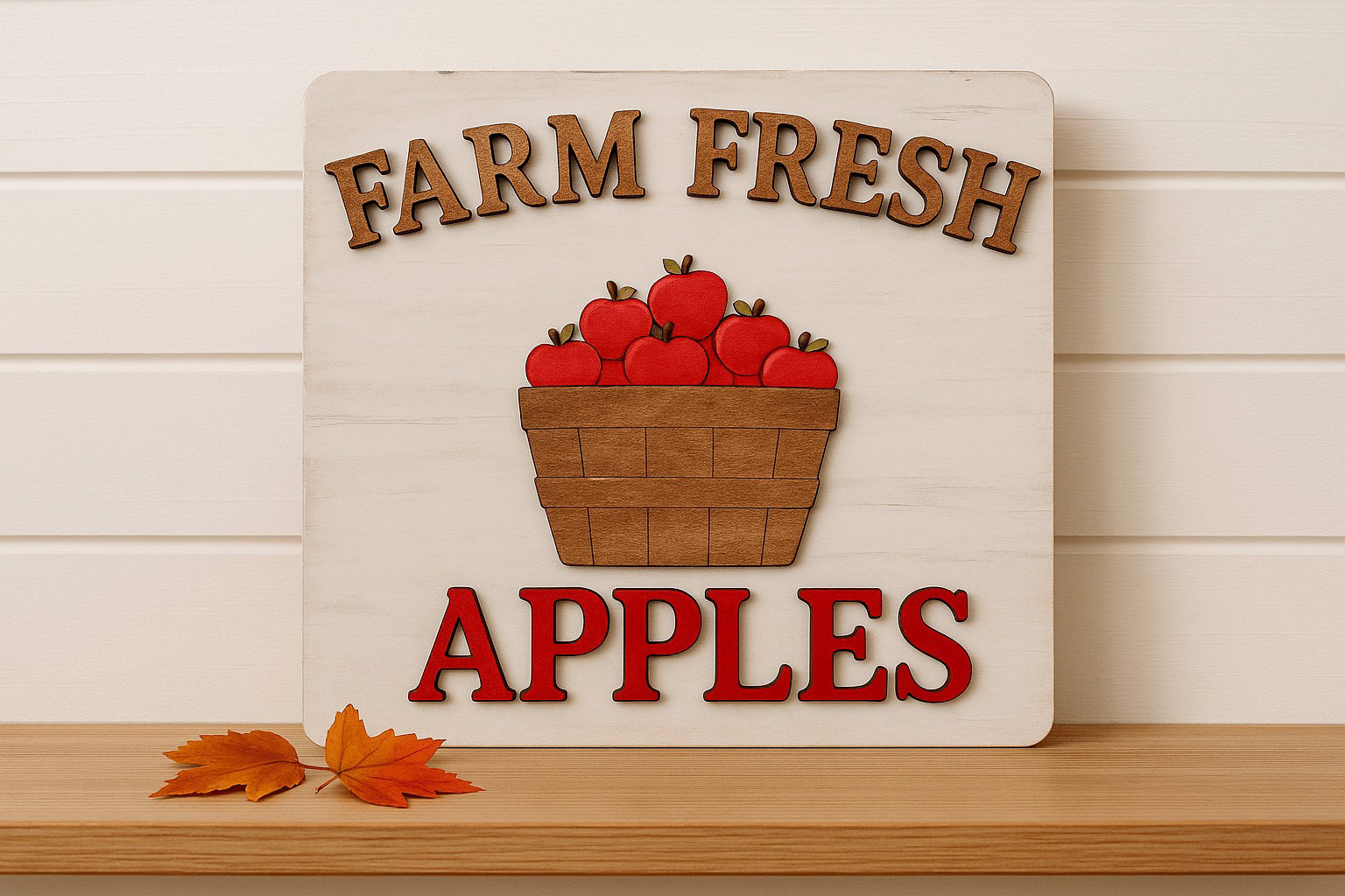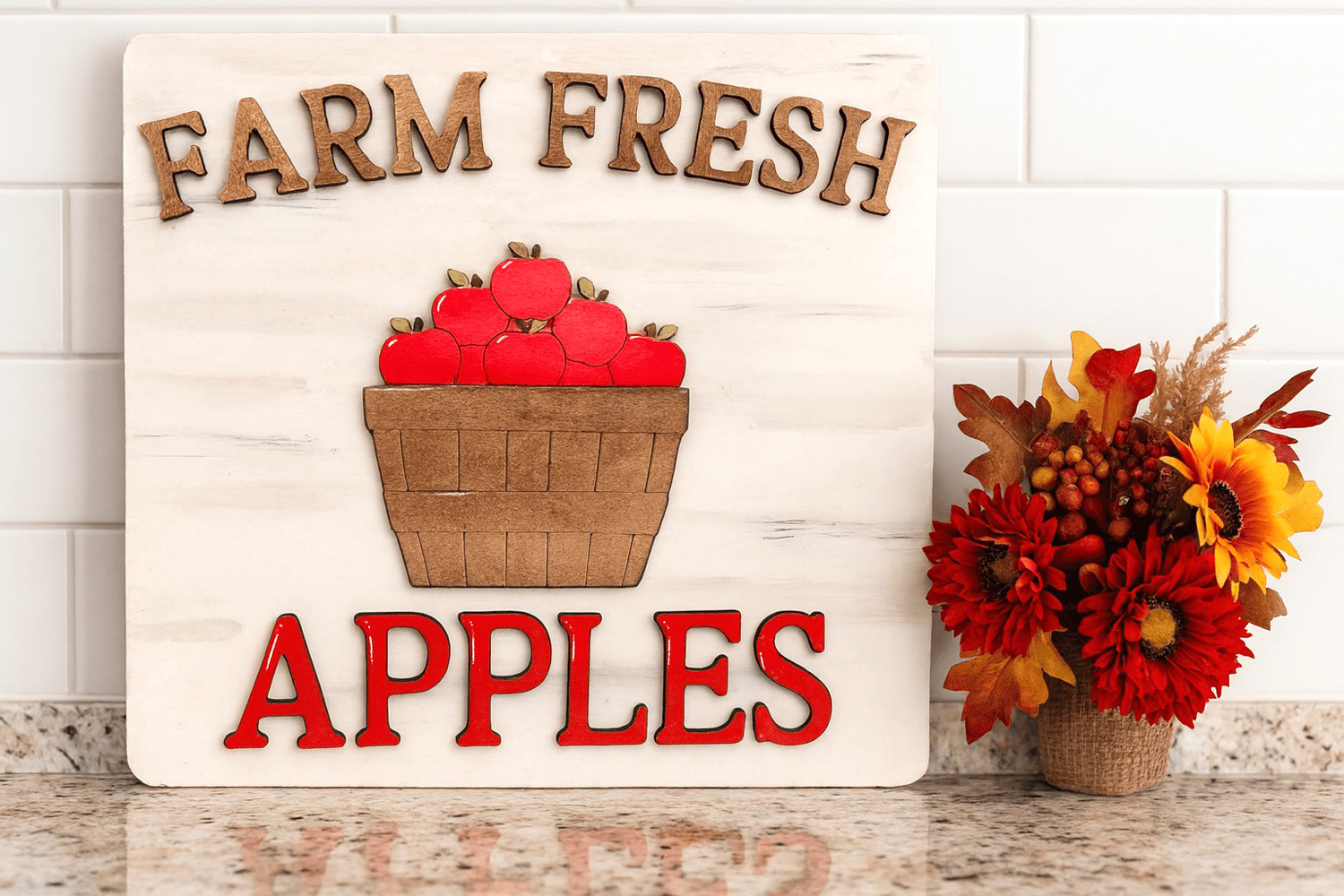 Looking to add some cozy vibes to your kitchen? Check out our super cute "Farm Fresh Apples" shelf sitter! It's got a charming wooden basket overflowing with bright red apples, and the fun lettering makes it pop.