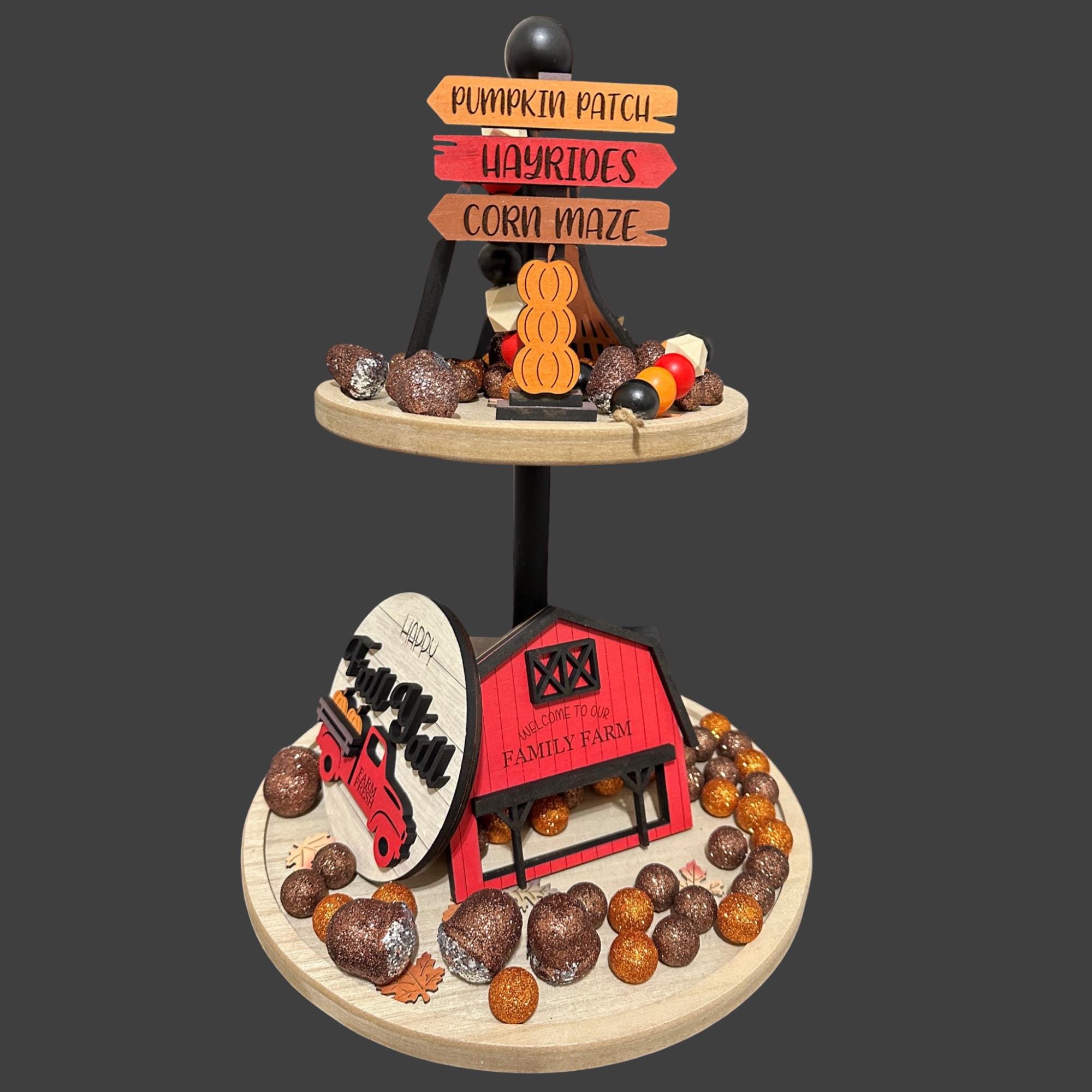 This is a two tiered tray with fall decor. The decor can be changed out with other decor (not included). The wood decor is laser cut & engraved wood. The tiered tray is not. The decor is hand painted & sealed with clear coat. Also the tray will need to be assembled as it will be broken down for shipping. It’s easy to assemble, just screws together. You can purchase the whole set WITH the tiered tray or just the wood decor WITHOUT the tiered tray and accessories. You can also buy each piece of decor individually.