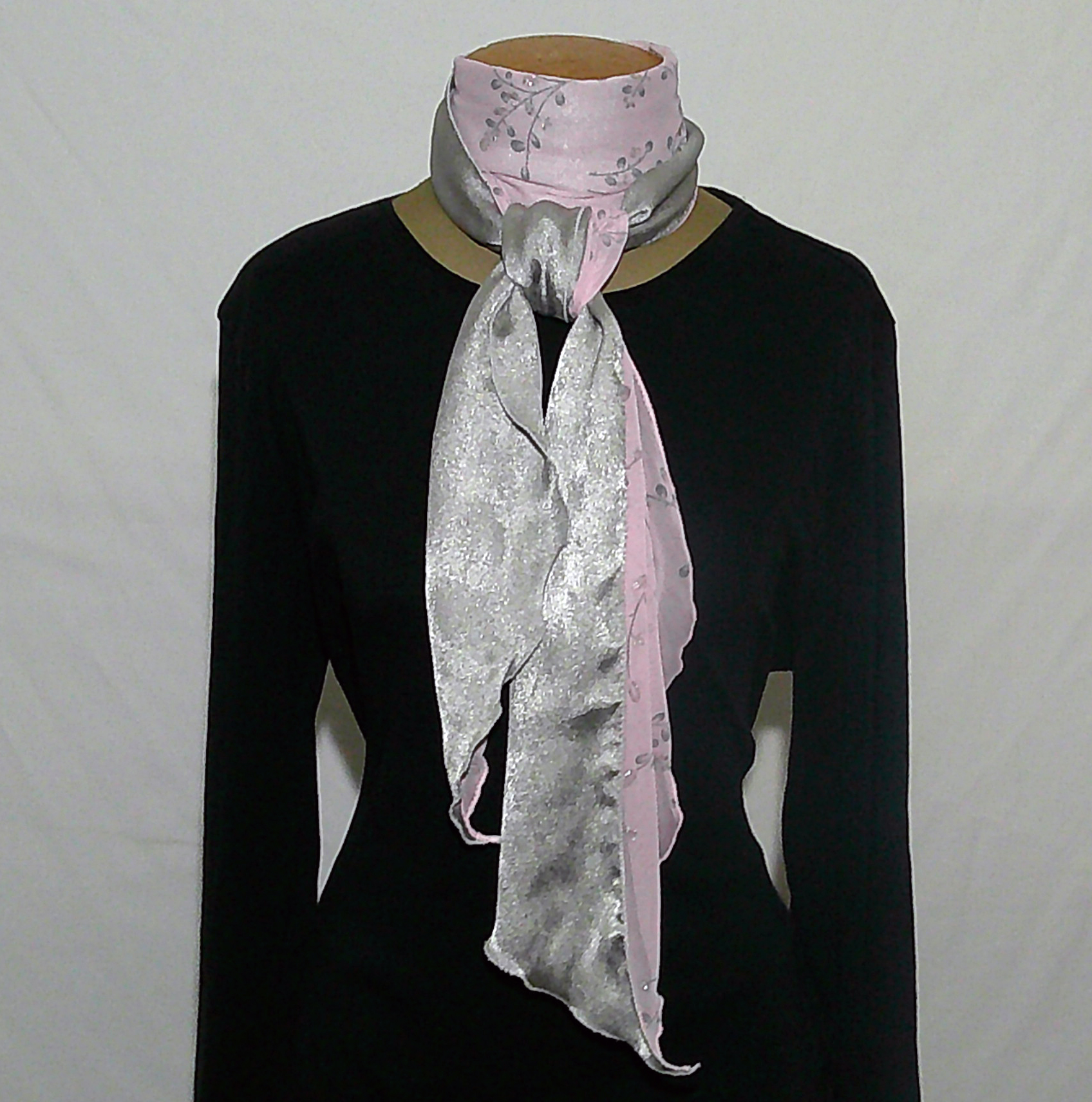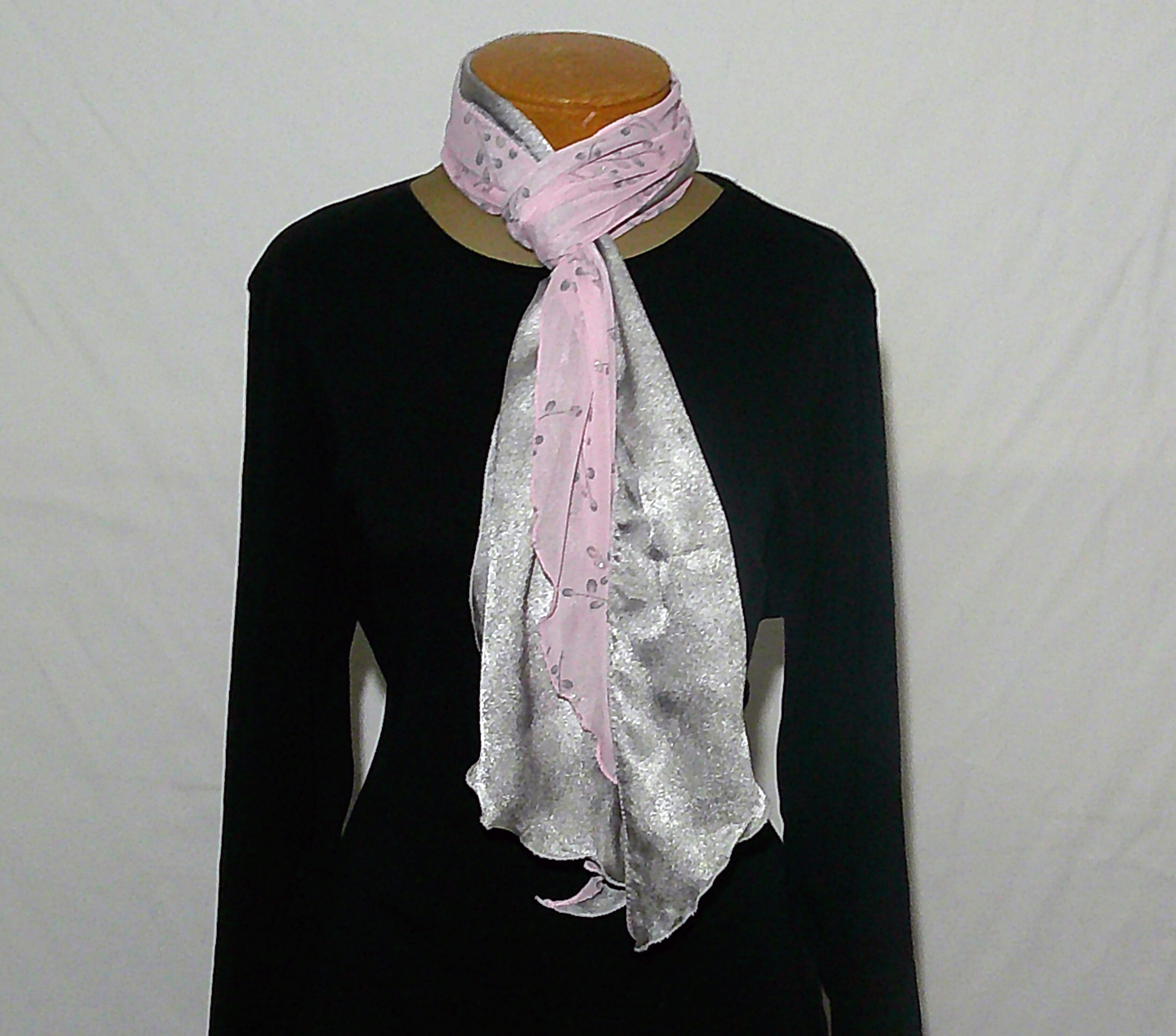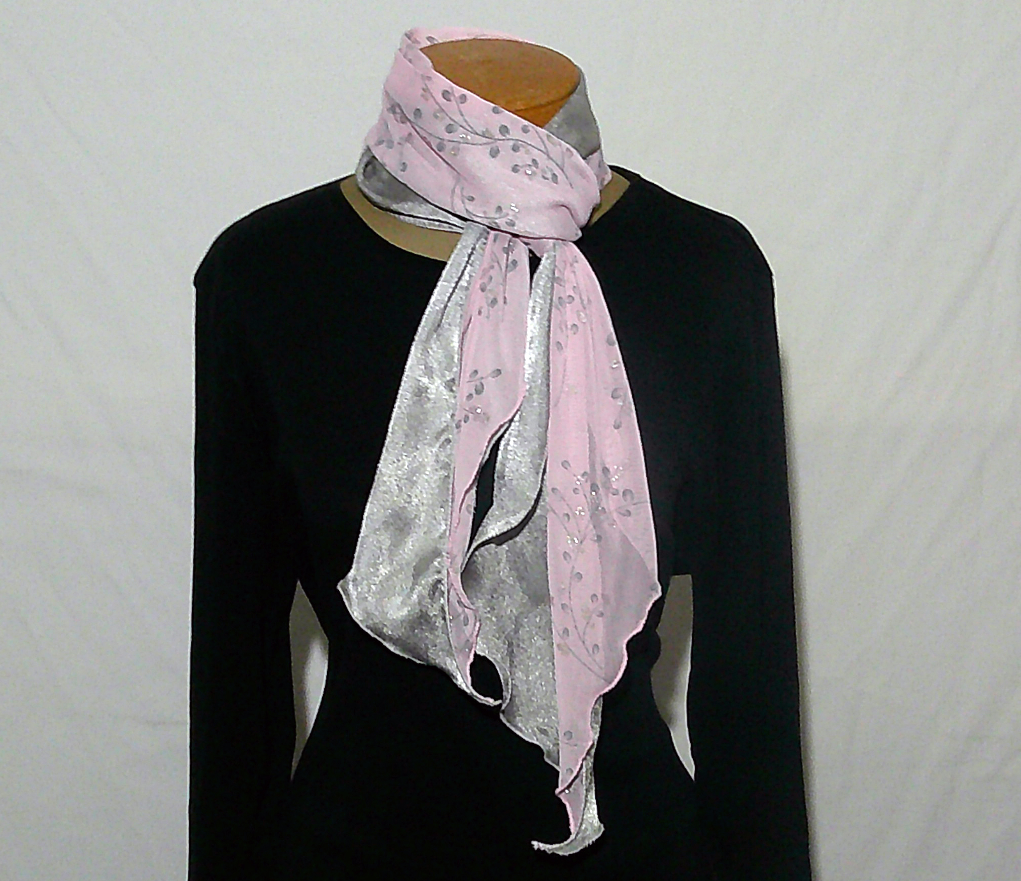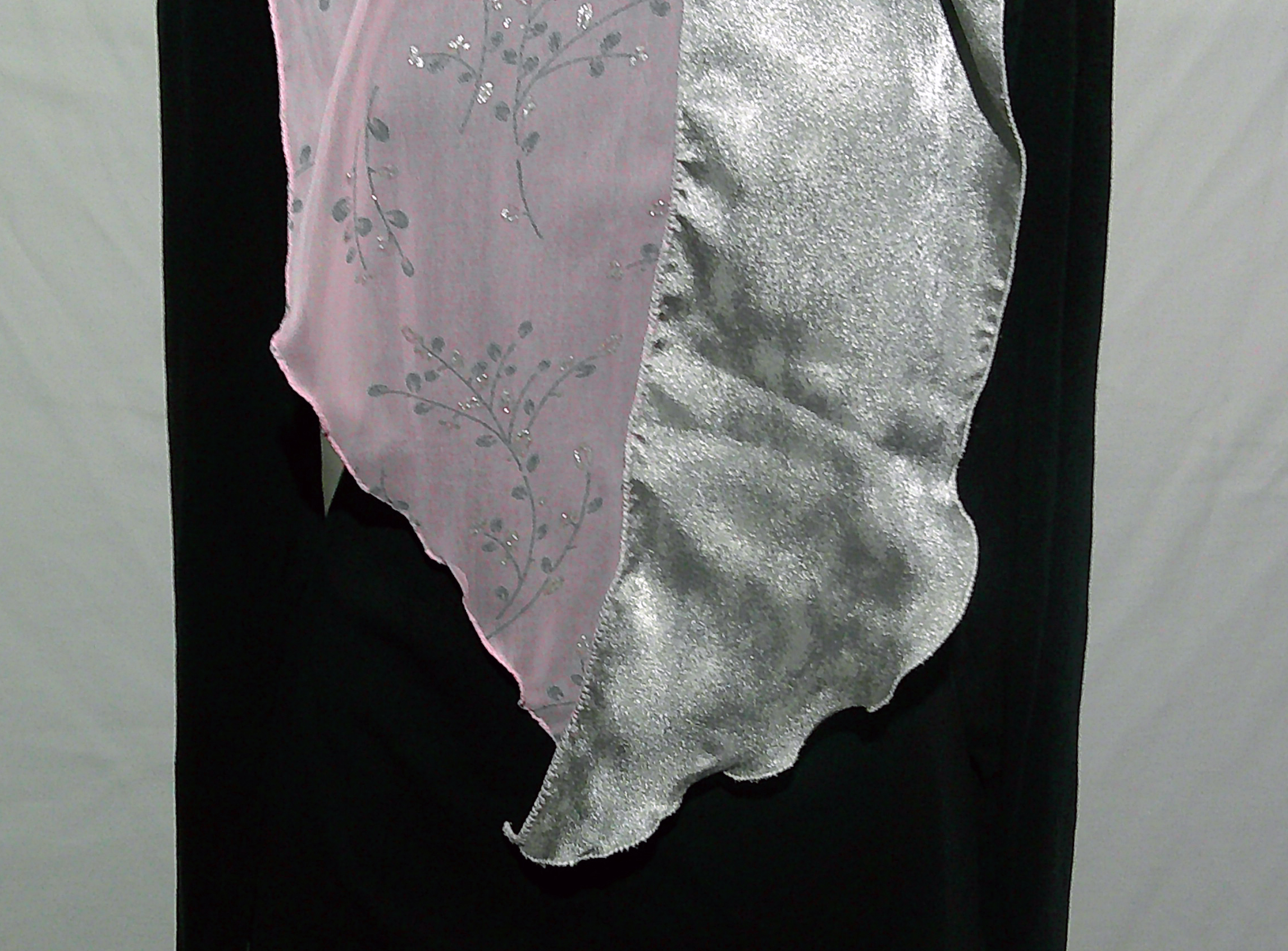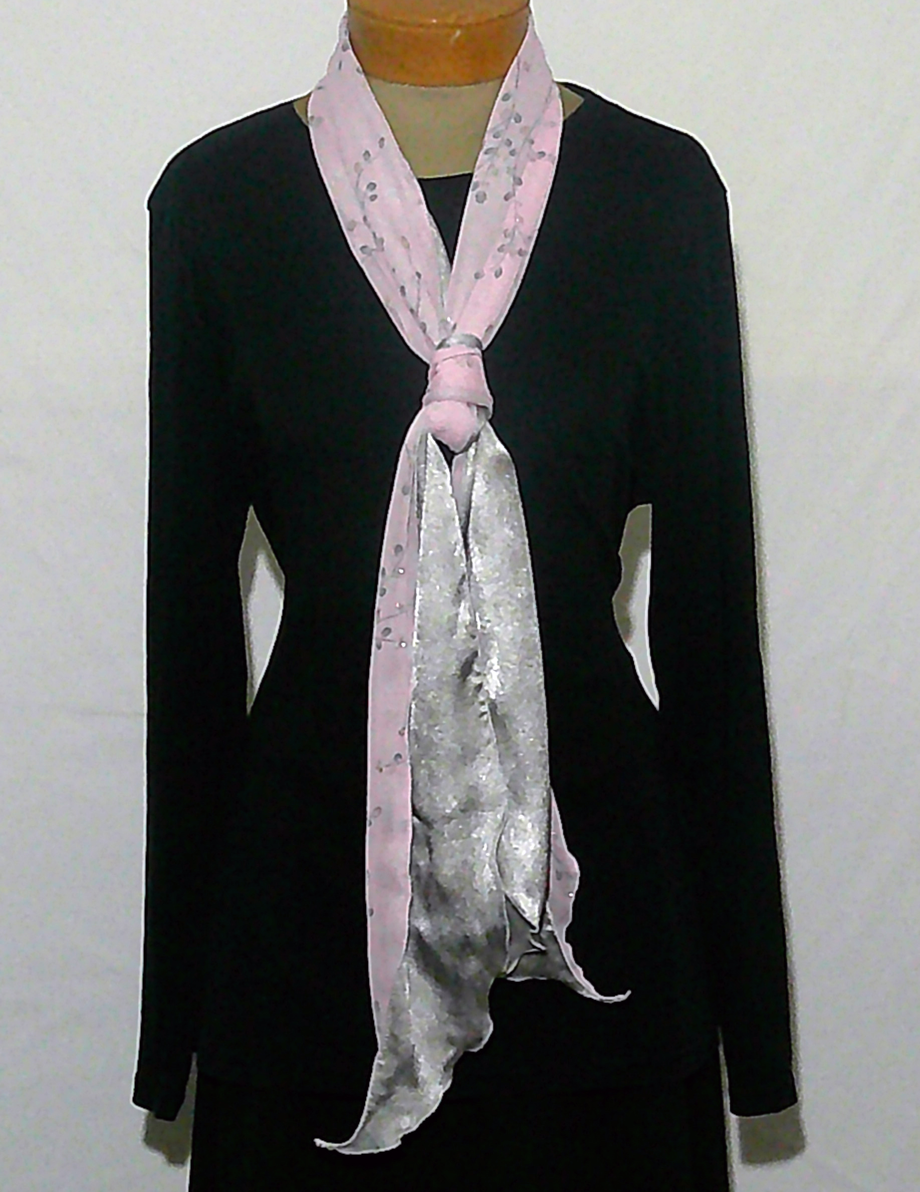 This unique scarf is the marriage of two special fabrics. The shiny silver fabric is a perfect accompaniment to the soft pink fabric with the silver design and sparkles. The edging done on this scarf has been perfected over the last 15 years and is what causes the right shaped curves and drape of this scarf. Because of this it can be tied multiple ways, each producing a different look. Whether wearing to a gala event or pairing jeans with a jacket, it is one of a kind and will bring joy to the wearer for many years to come.