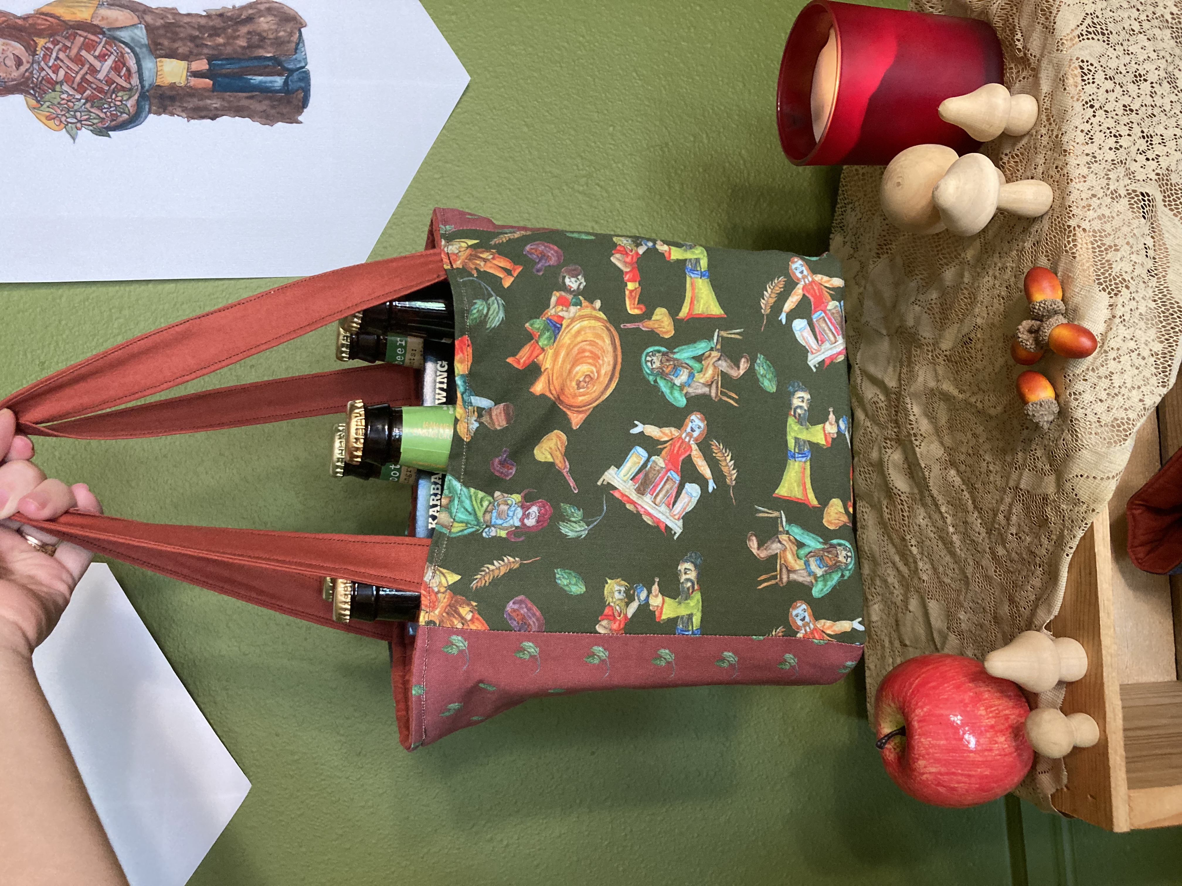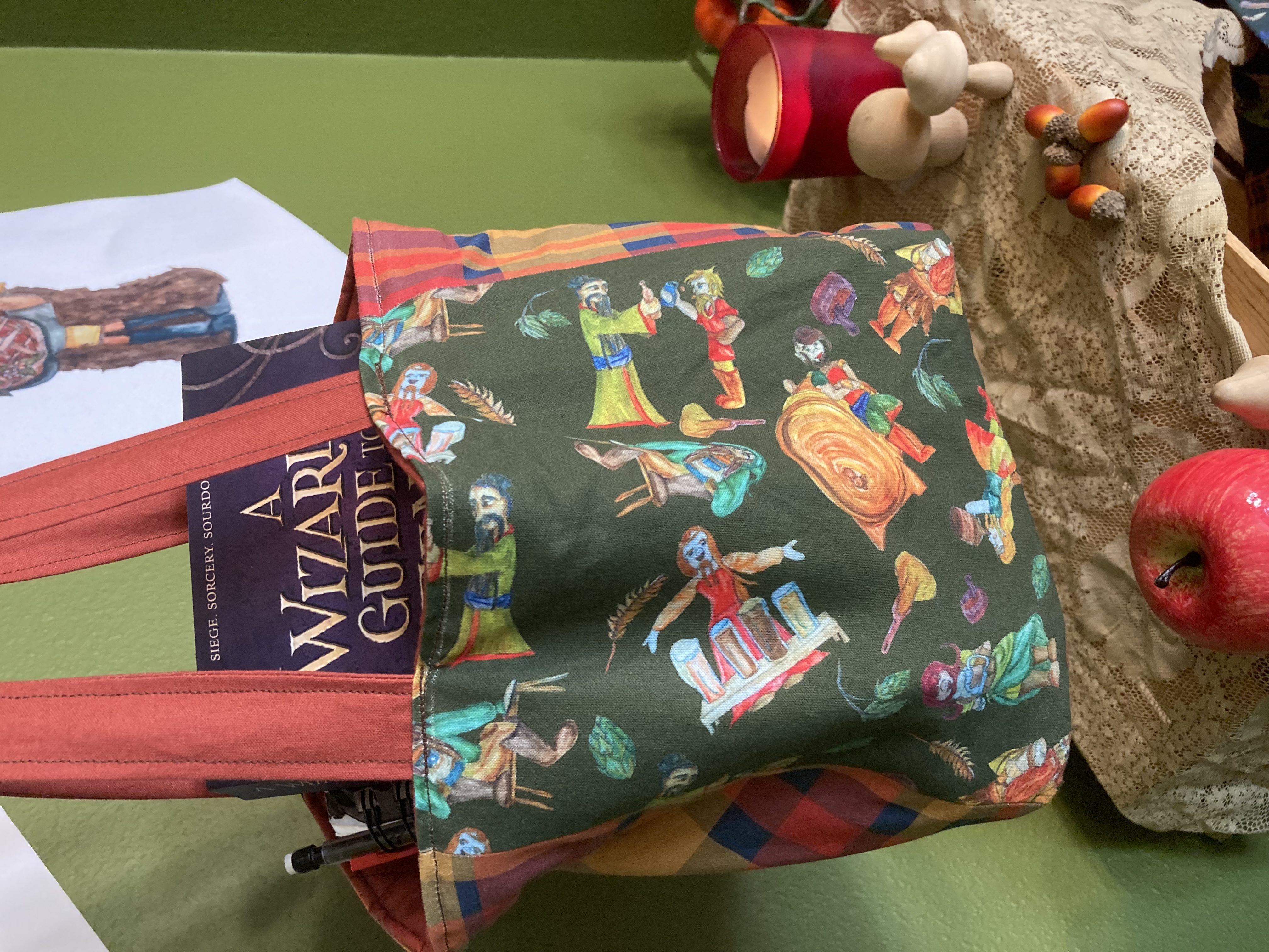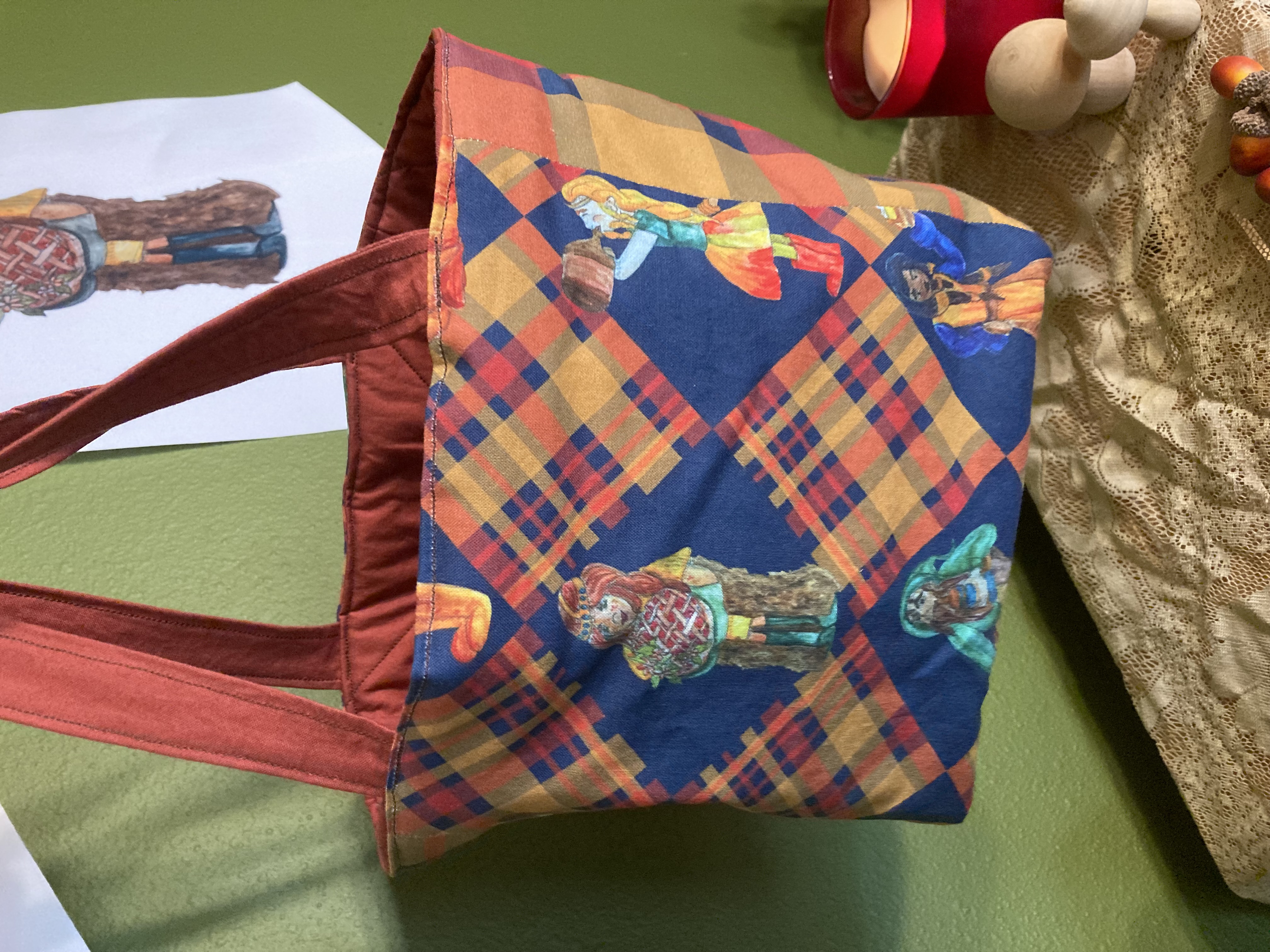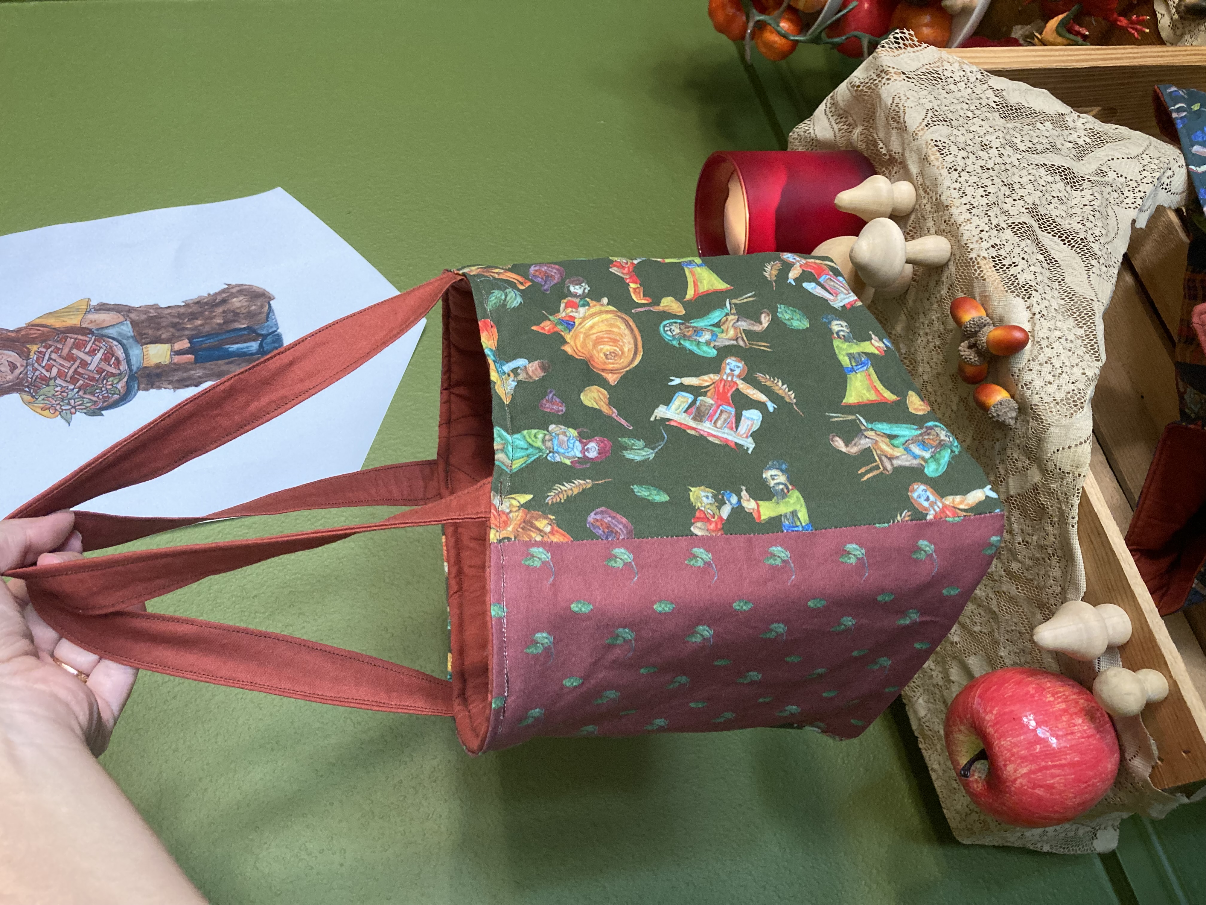 I hand draw and paint each image then digitize it and make them all into a pattern. I then get that pattern printed in fabric and sew the tote for you!