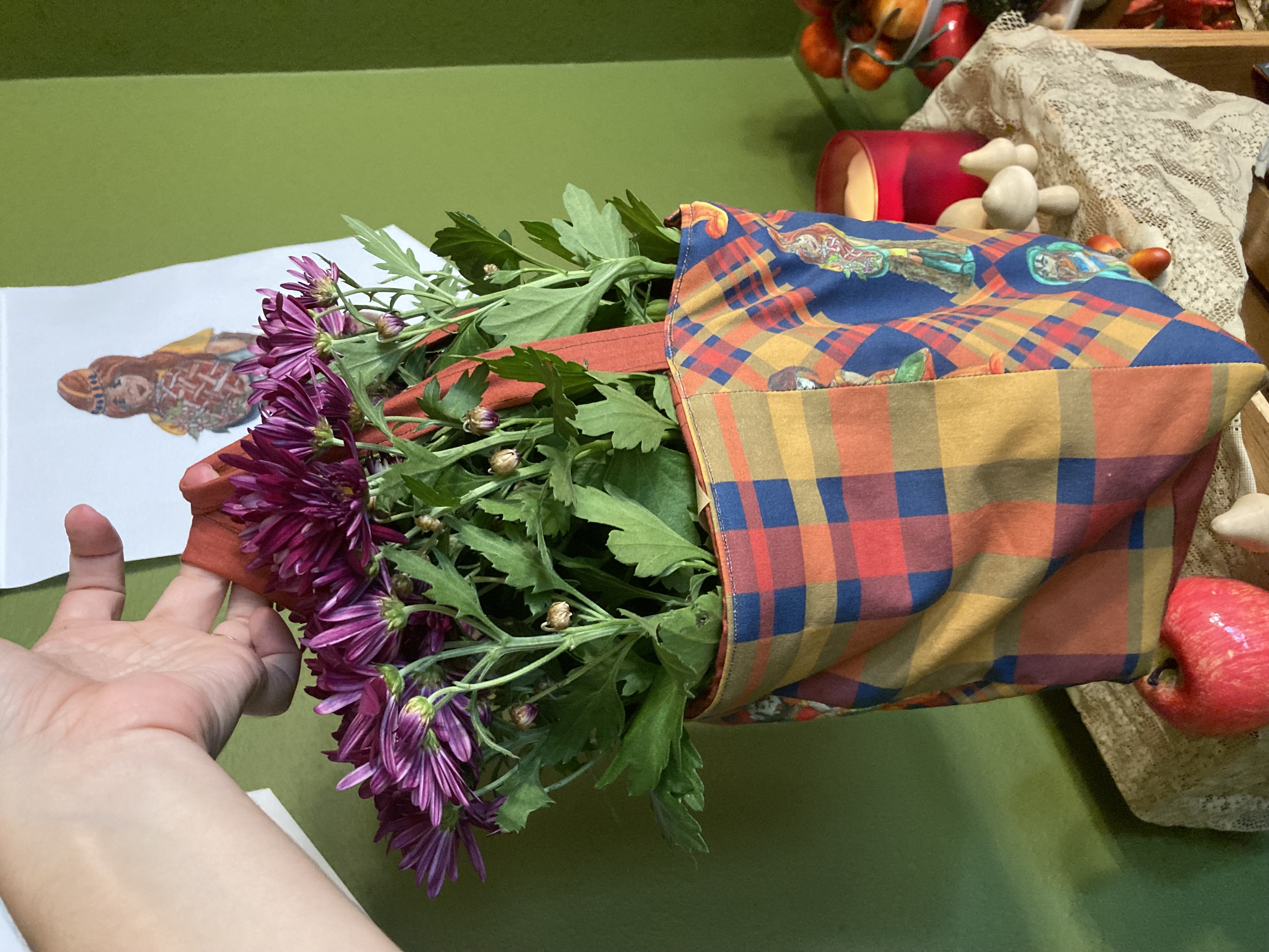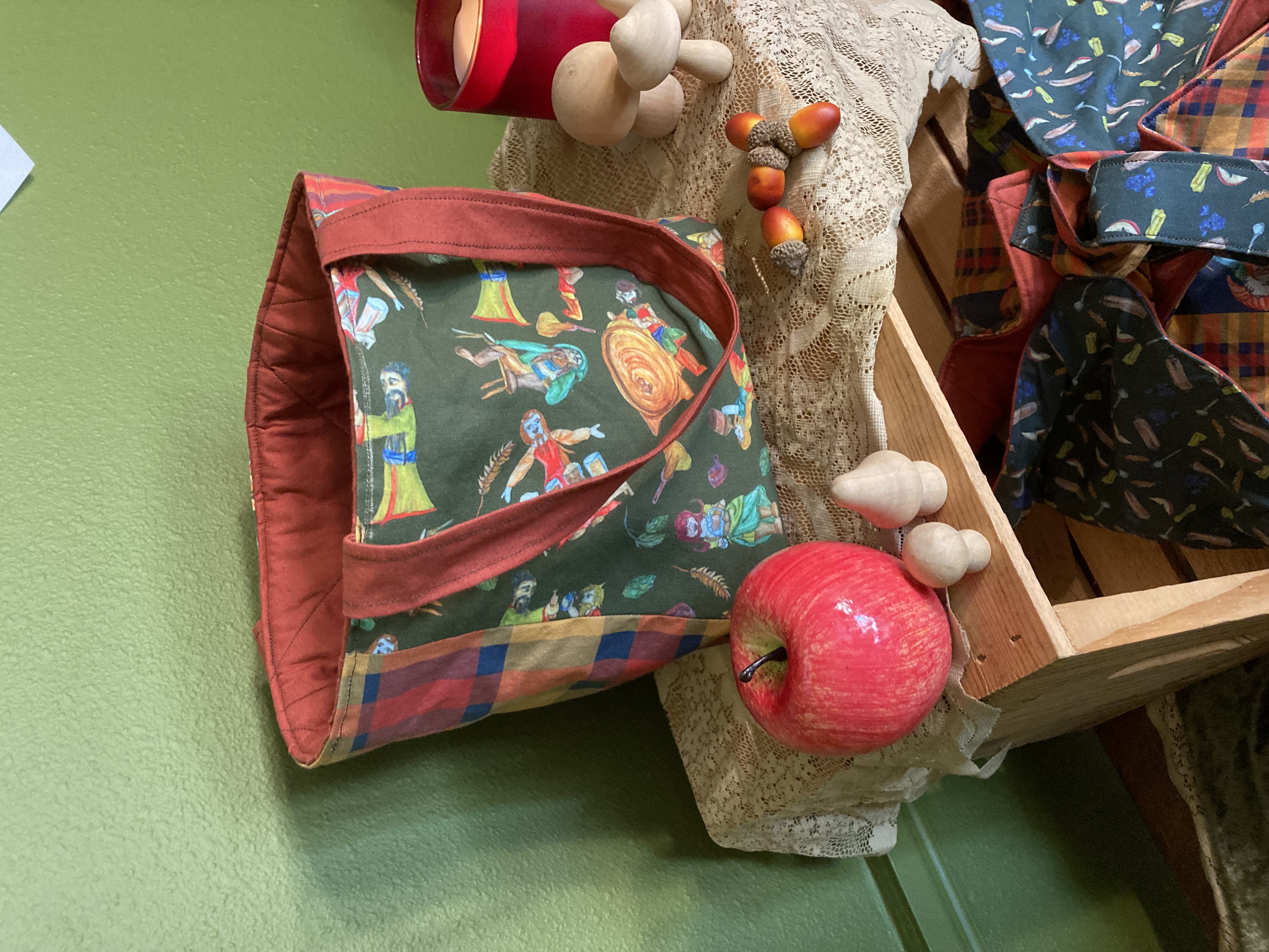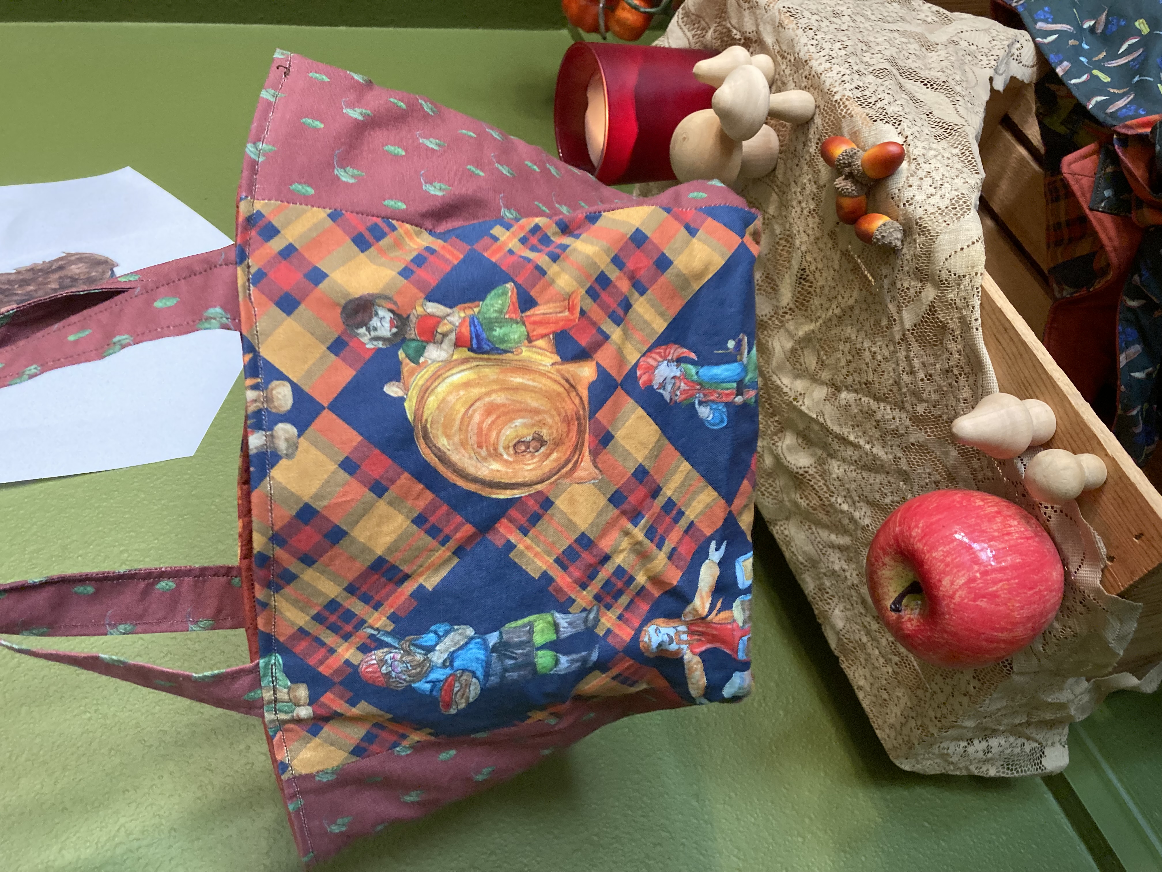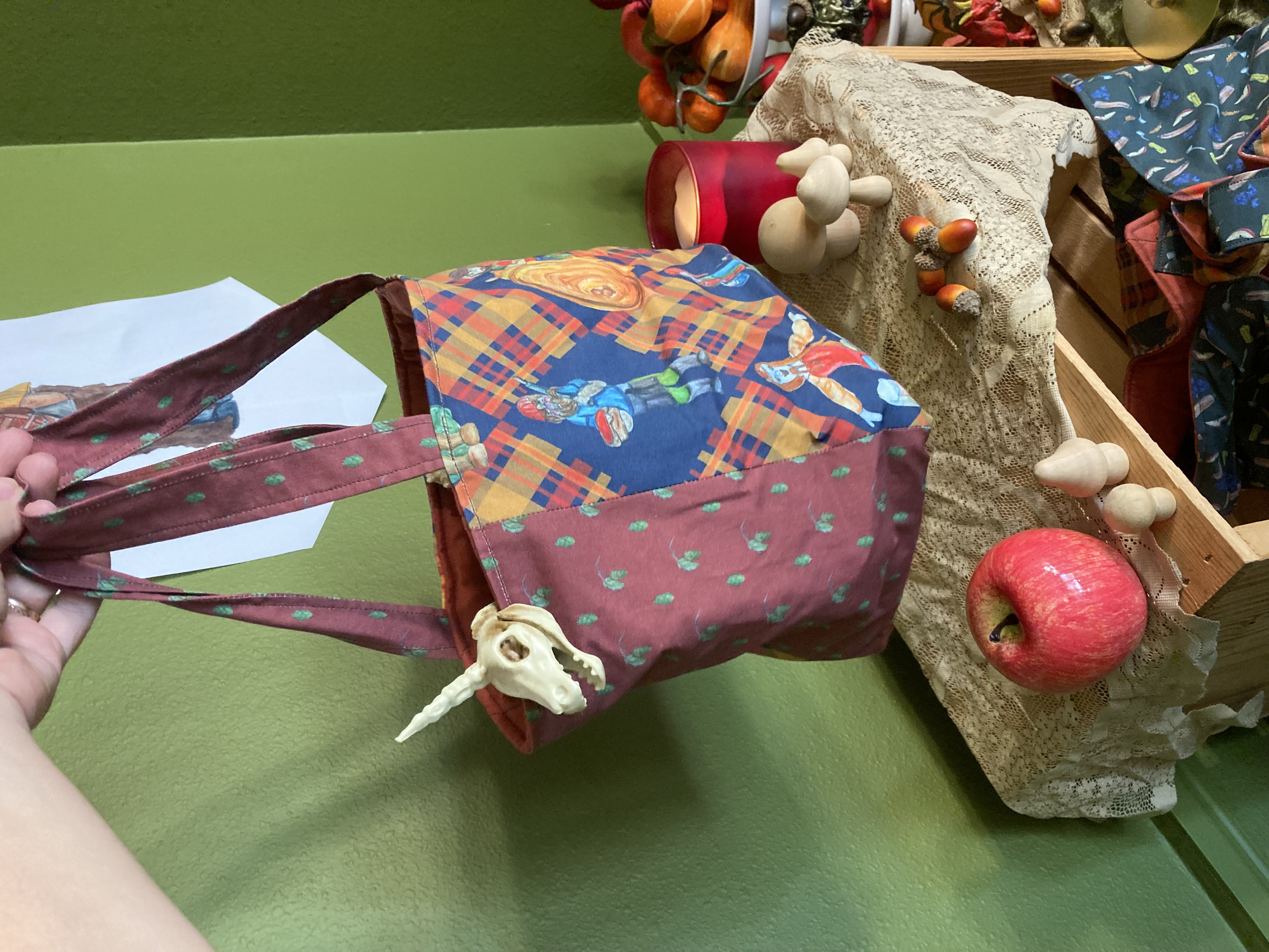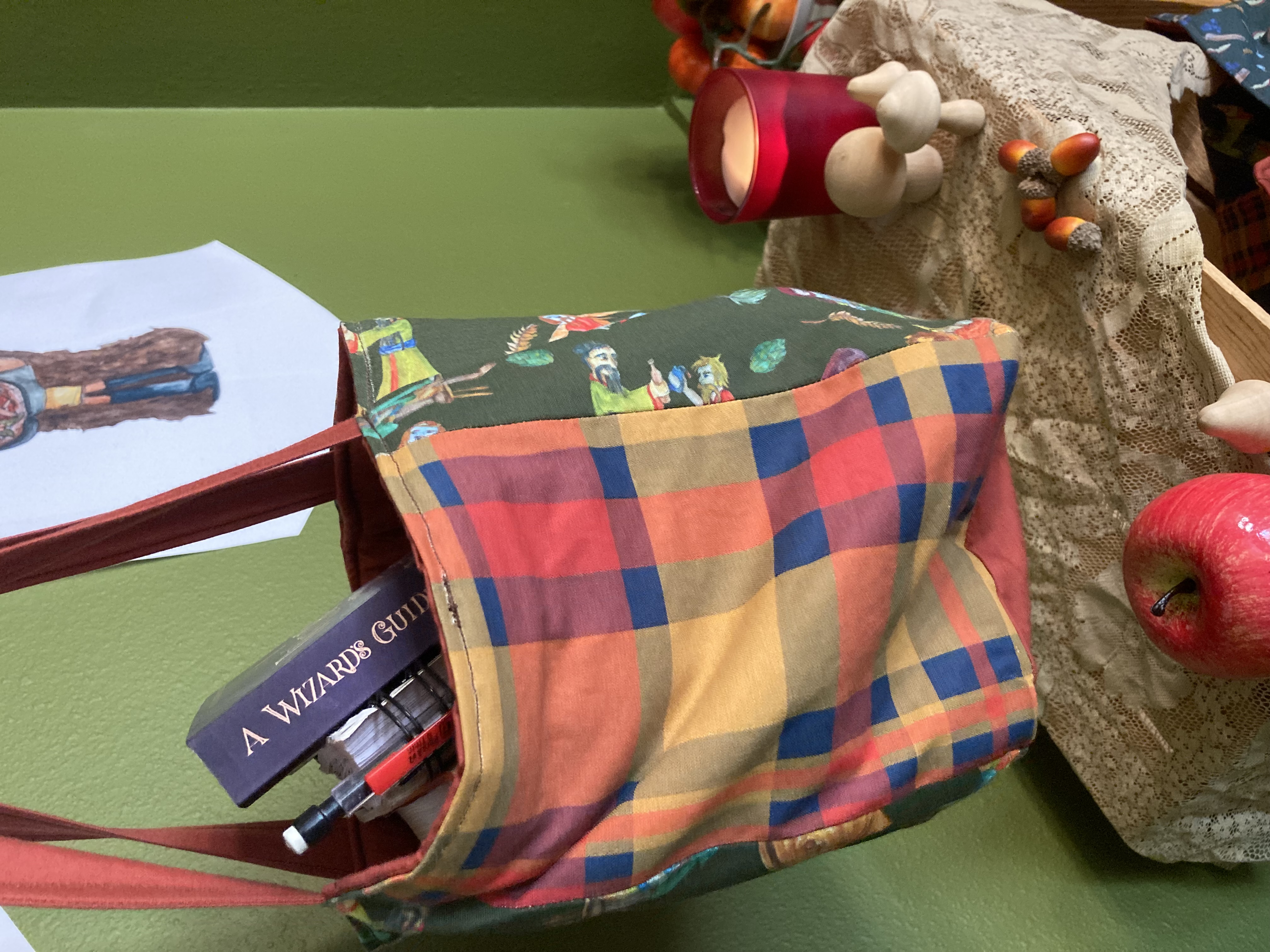I hand draw and paint each image then digitize it and make them all into a pattern. I then get that pattern printed in fabric and sew the tote for you!