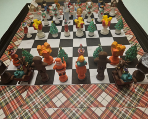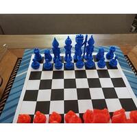 I custom-designed each piece on my computer on a 3D modeling software. I then print them out on my 3D printer. I design and print the chess boards to match the theme of the set. I apply the board along with a complementary design element to a hard surface.