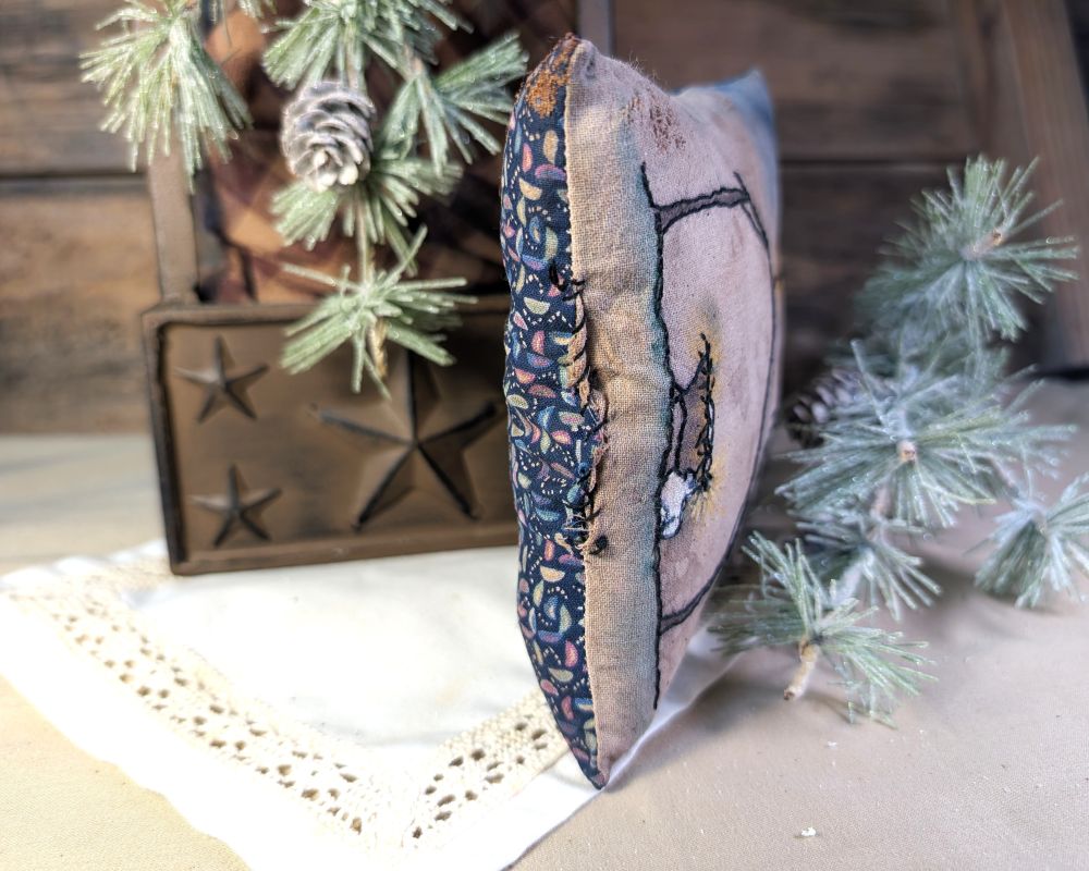Each pillow is created individually. The design is hand embroidered and painted on the front and then it is stitched to a coordinating fabric for the back. After stuffing it and stitching it closed, I stain it and then add stiffener as the last step to help keep the cinnamon from shedding and for durability.