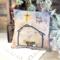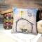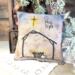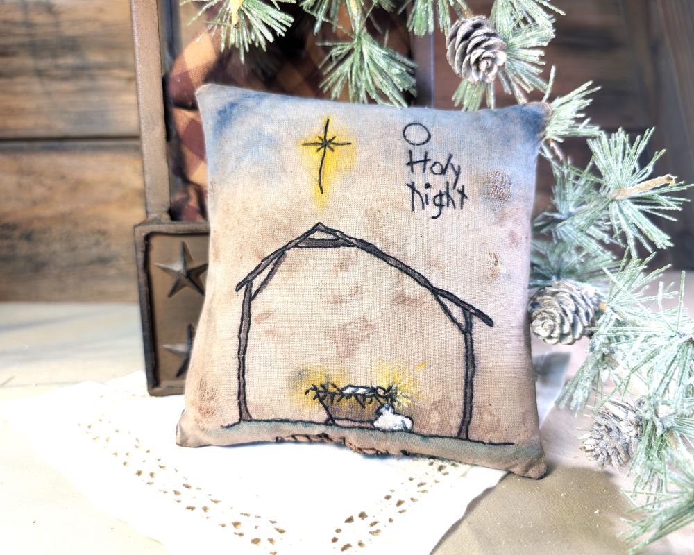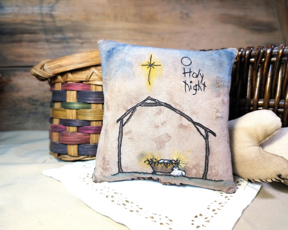 This farmhouse style 5-inch decor pillow features a nativity scene with a star and O Holy Night hand-embroidered on the front will add a cozy charm to your holiday decor. The back of the pillow is a multi-colored blue and a stain and stiffener has been added to the pillow for added vintage appeal. This is a pillow to be used in your decor scenes, not suitable as a cushion.