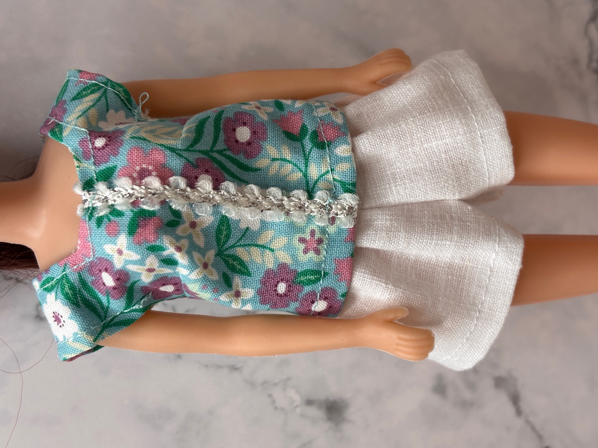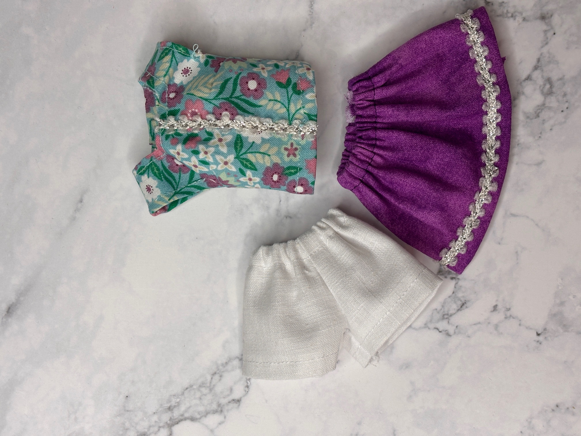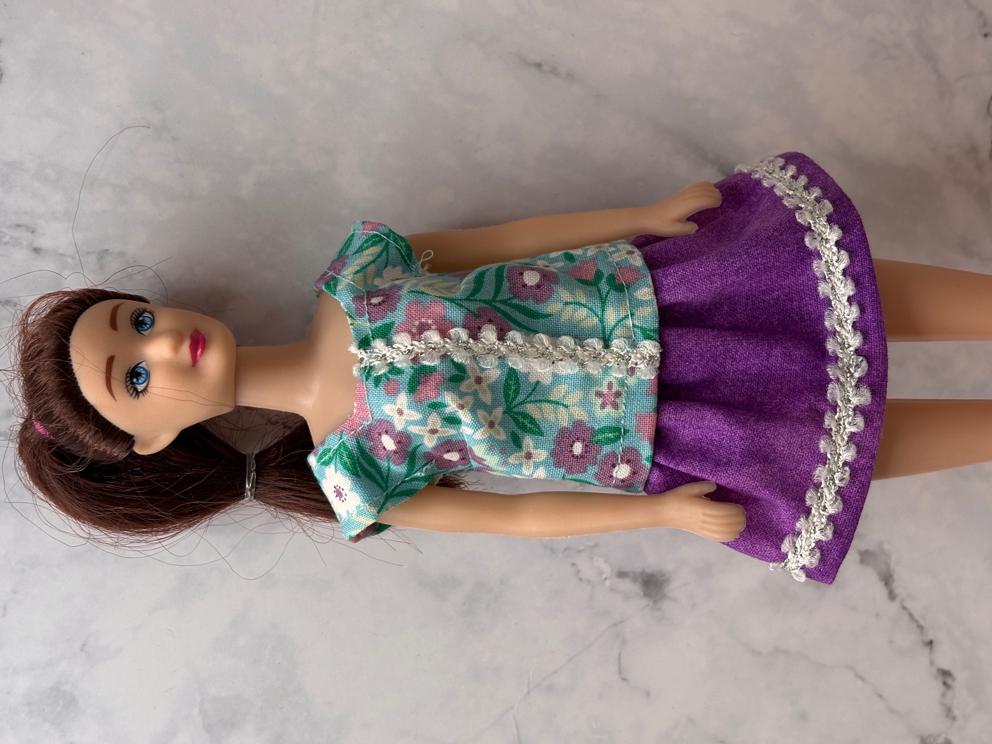 These doll clothes are made from mostly cotton fabric and sewn on a sewing machine.