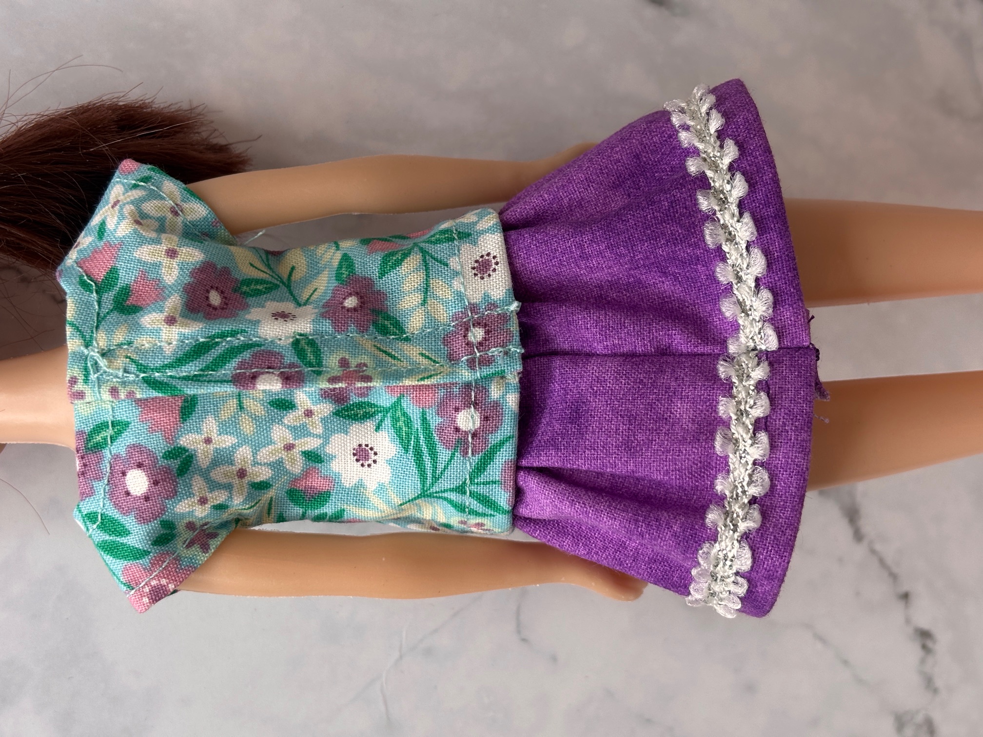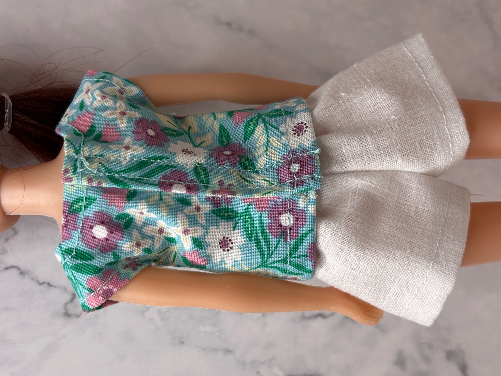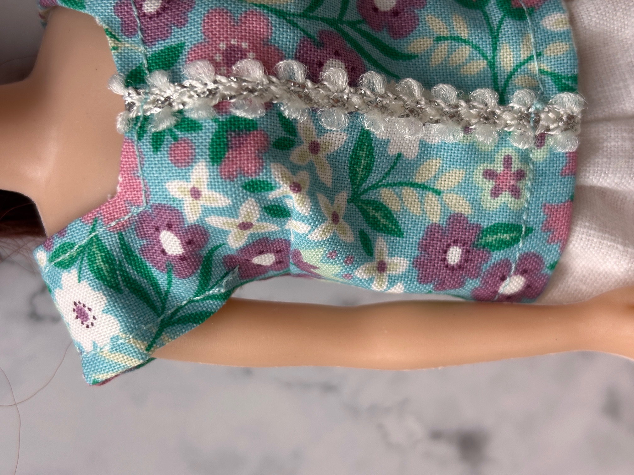 These doll clothes are made from mostly cotton fabric and sewn on a sewing machine.